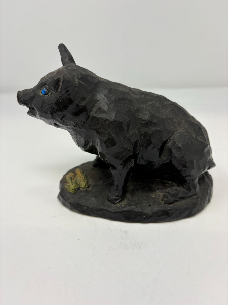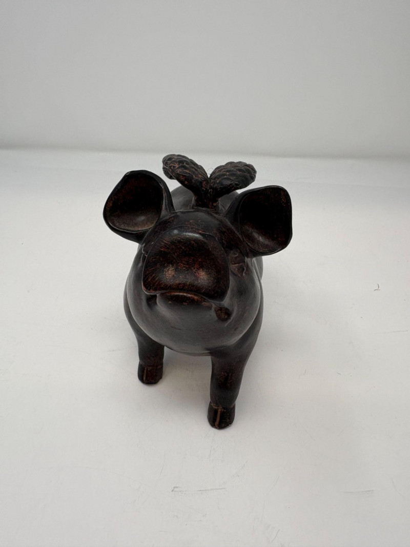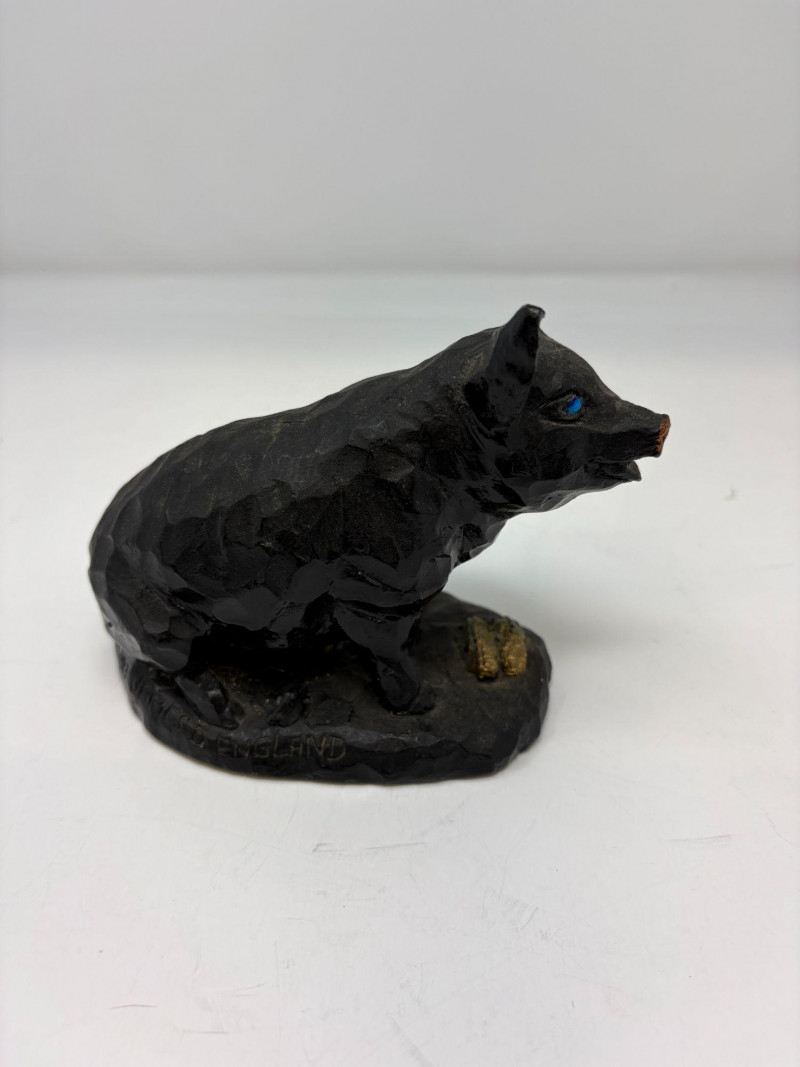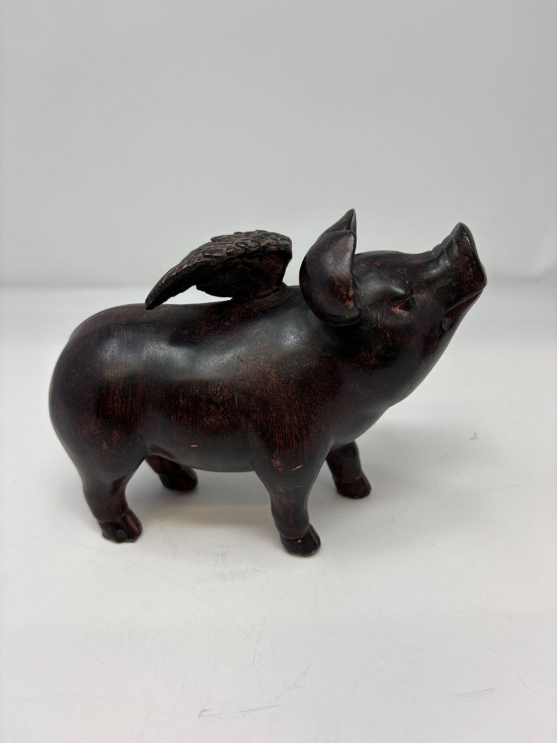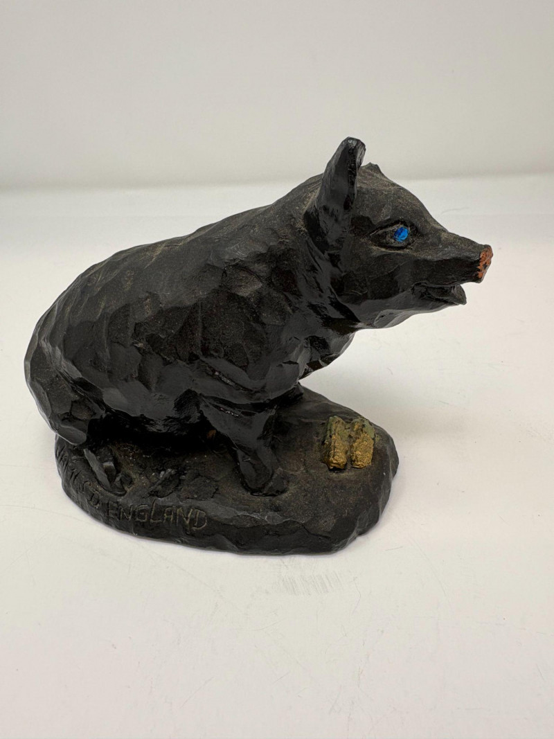 The first is a ceramic pig with wings, a whimsical sculptural form measuring approximately 5¼" H × 3¼" W × 4½" D. Nicely detailed with expressive features and a warm finish, it makes a delightful decorative accent. The second is a coal pig figurine, signed “James D – England”, noted as a 1938 English souvenir. Compact and weighty with a matte black surface, it measures approximately 3⅜" in length. A distinctive example of early coal‑crafted keepsakes.