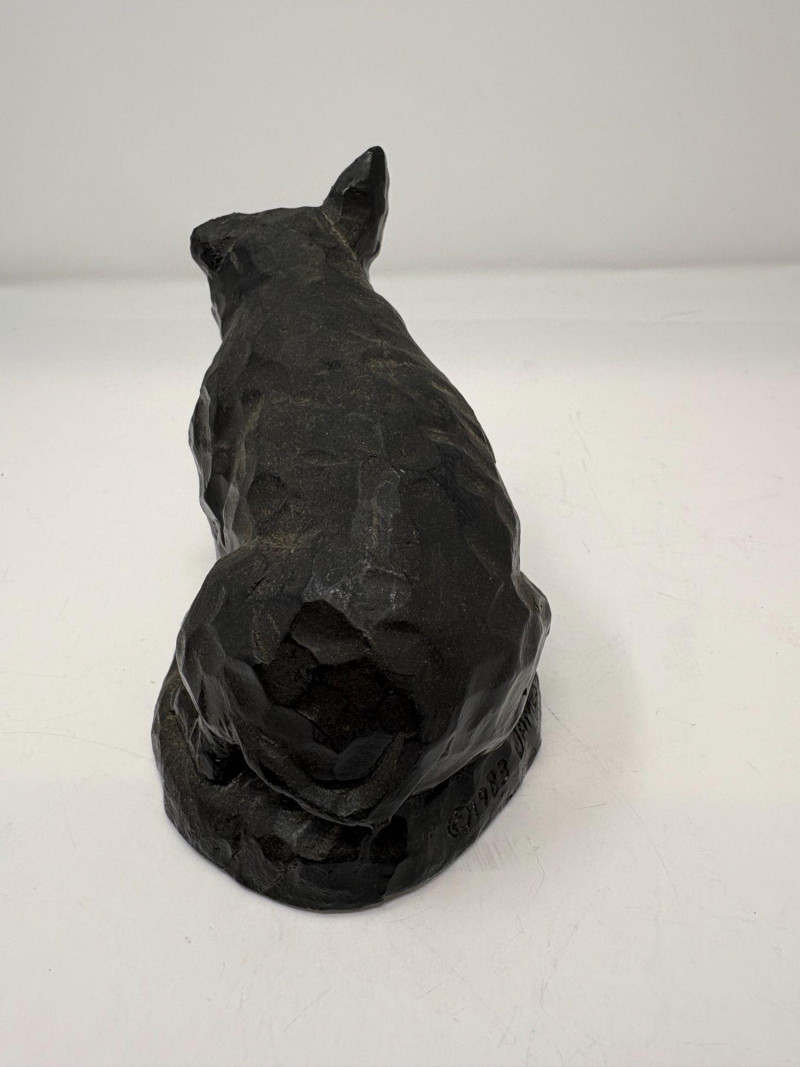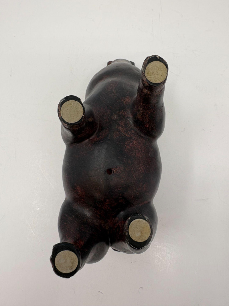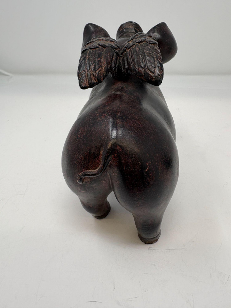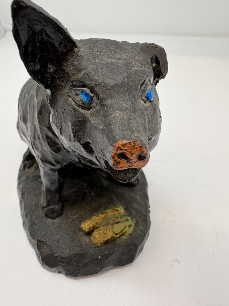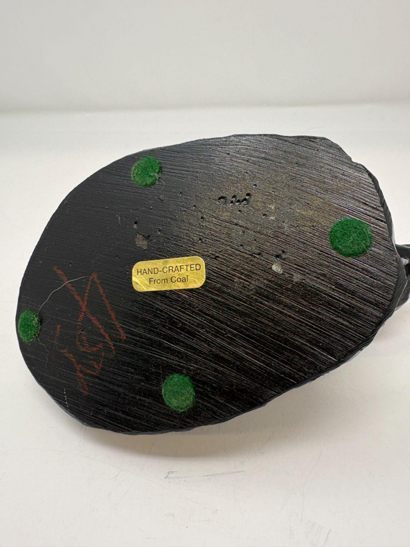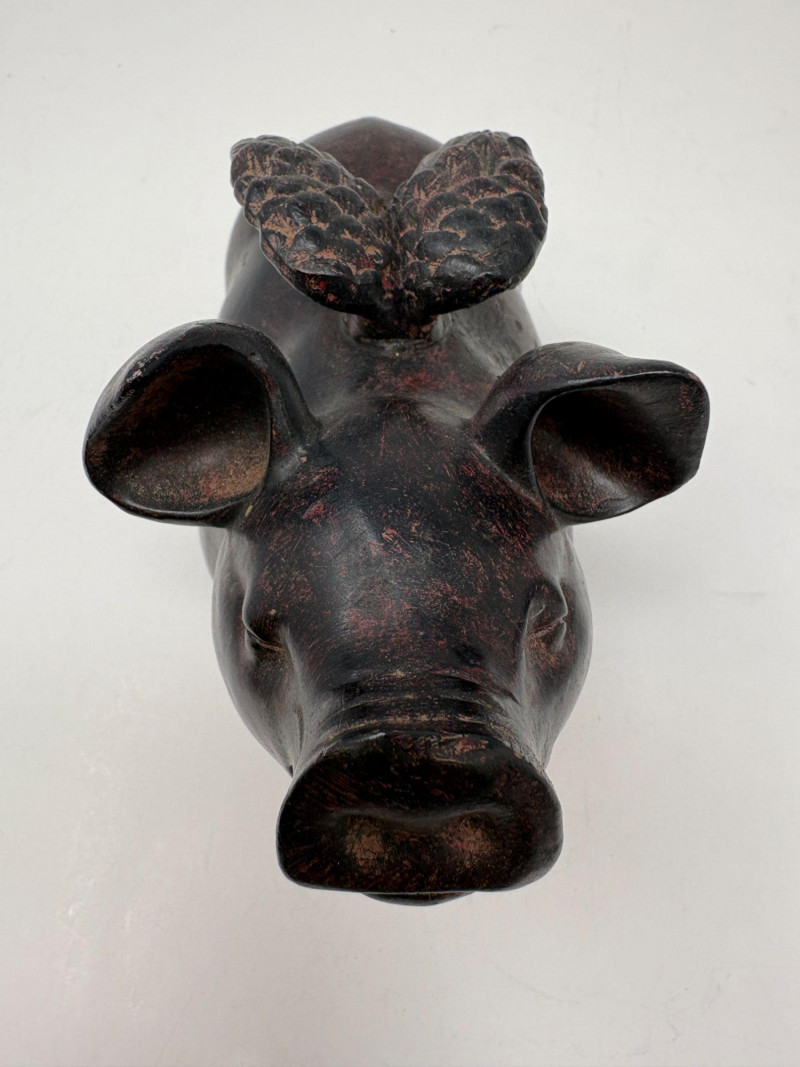 The first is a ceramic pig with wings, a whimsical sculptural form measuring approximately 5¼" H × 3¼" W × 4½" D. Nicely detailed with expressive features and a warm finish, it makes a delightful decorative accent. The second is a coal pig figurine, signed “James D – England”, noted as a 1938 English souvenir. Compact and weighty with a matte black surface, it measures approximately 3⅜" in length. A distinctive example of early coal‑crafted keepsakes.