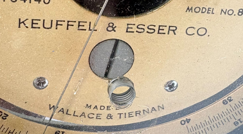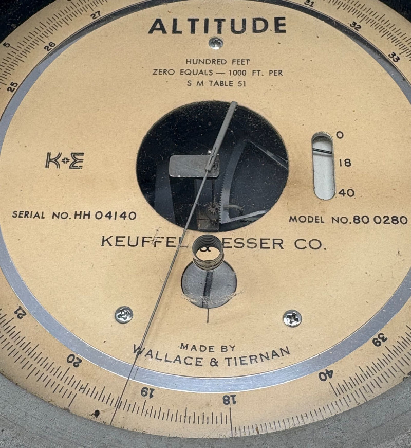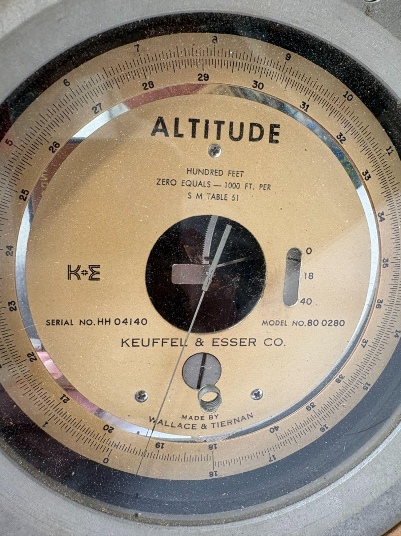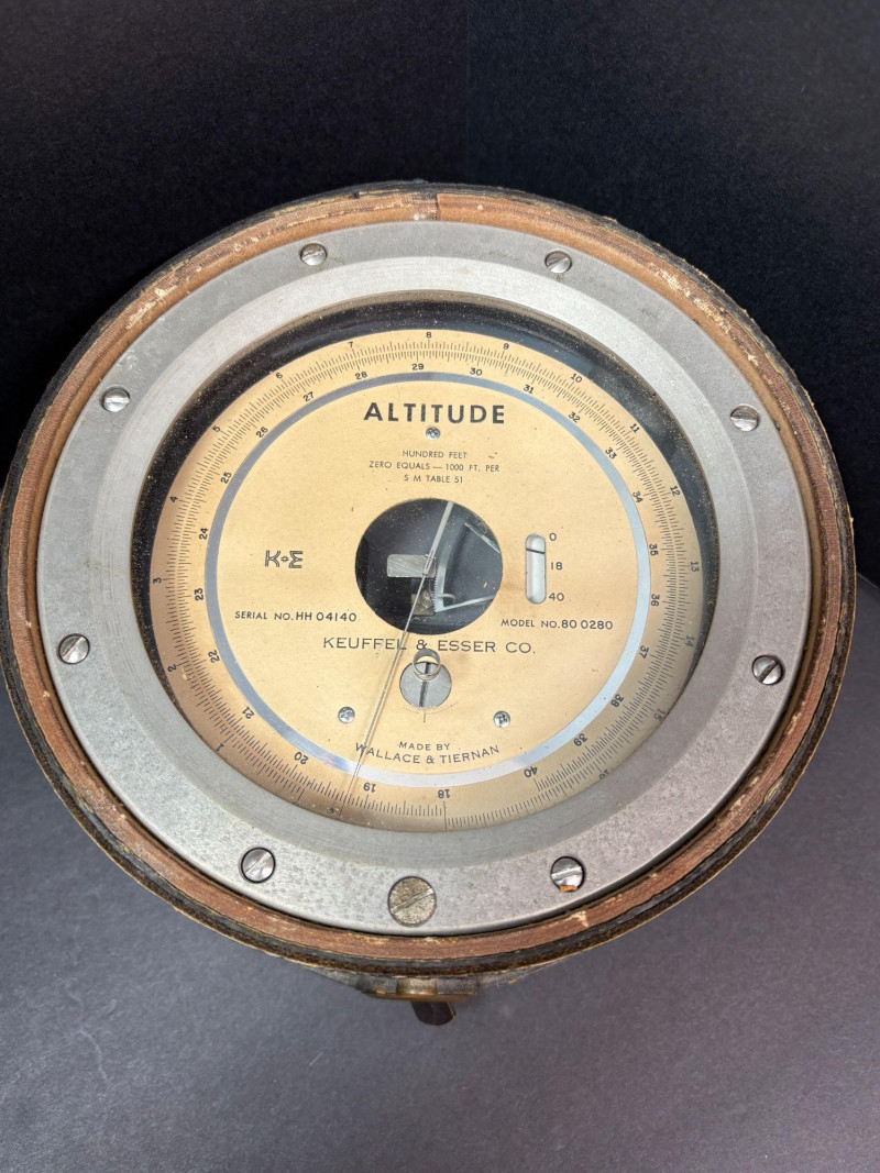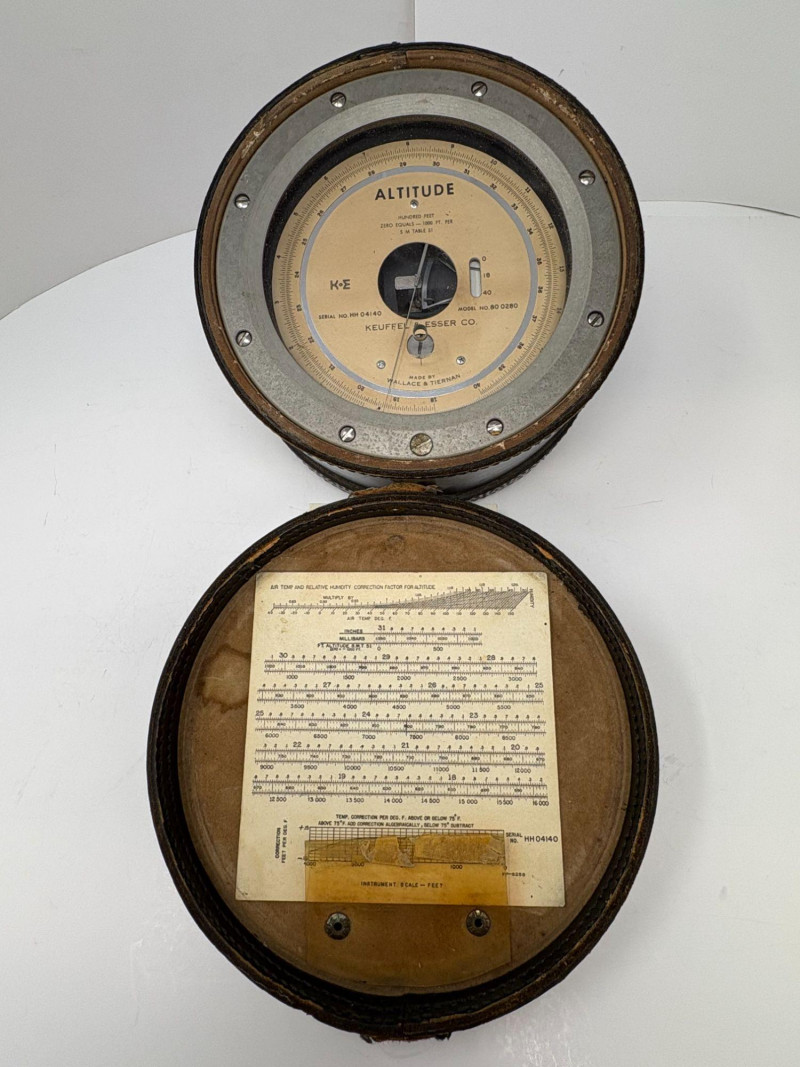 A finely preserved Keuffel & Esser Co. Model 80 Altitude Gauge, manufactured by Wallach & Tiernan, offered as a single collectible instrument. This precision analog gauge features a classic circular metal housing, clear altitude dial marked in hundred‑foot increments, and original serial markings. Included with the piece is its fitted protective case and accompanying printed instruction sheet, enhancing both provenance and display value. Approximate Measurements Gauge diameter: ~3.5 in Depth: ~1.25 in Case: ~4.5 × 4.5 in