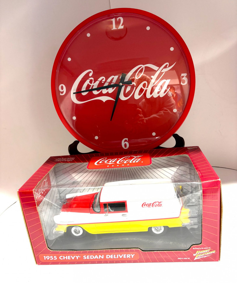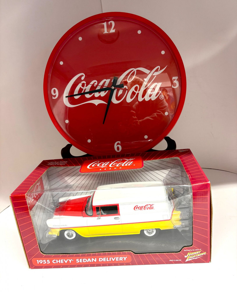 Lot # 119 - Coca‑Cola Collectible Set — 1955 Chevy Delivery Die‑Cast & Wall Clock
