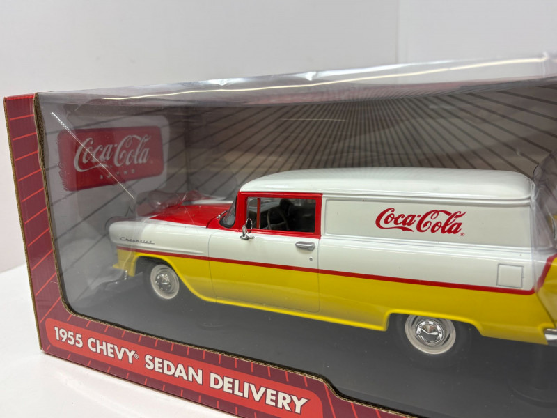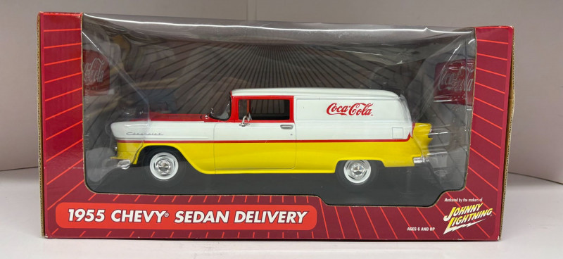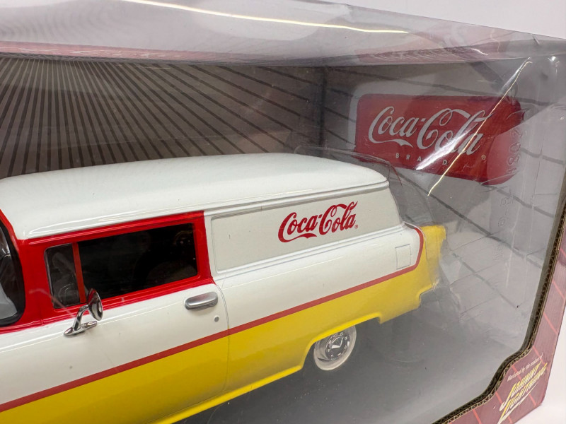 A bright, nostalgic Coca‑Cola duo featuring a 1955 Chevy Sedan Delivery die‑cast model and a 14" Coca‑Cola wall clock by Hamberger Clocks. The die‑cast truck is produced by the makers of Johnny Lightning, showcasing a 100% metal body, detailed engine, and collector‑grade interior. The clock features the classic red‑and‑white Coca‑Cola branding with bold numerals, perfect for a kitchen, game room, or vintage display wall. Both pieces present well together as a coordinated Coca‑Cola collectible set—ideal for brand enthusiasts, automotive collectors, or retro décor lovers.