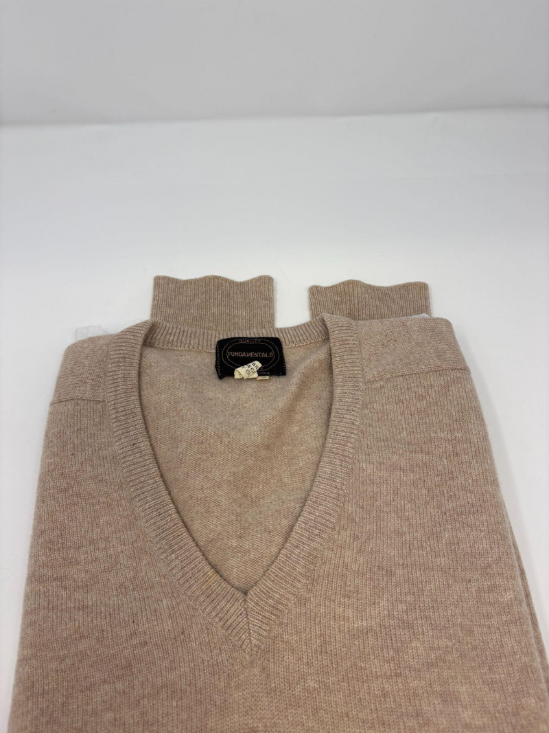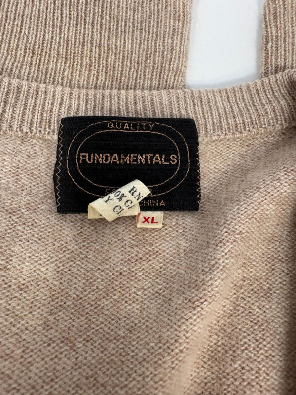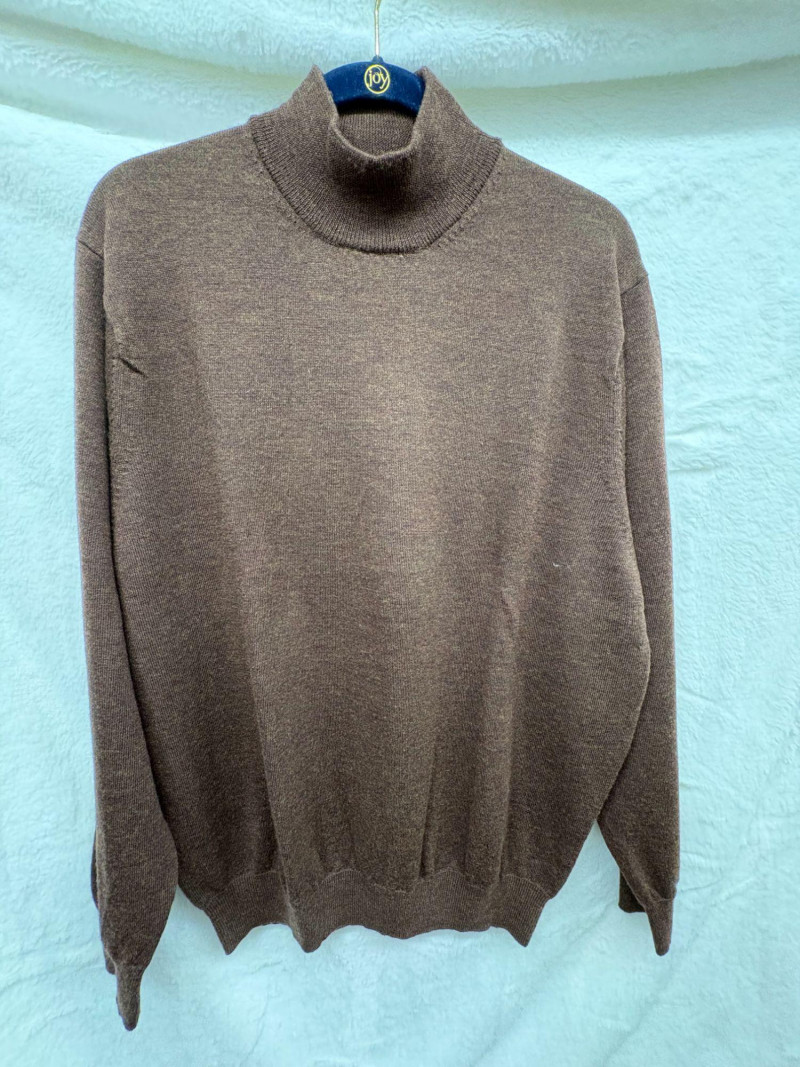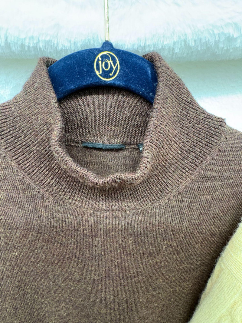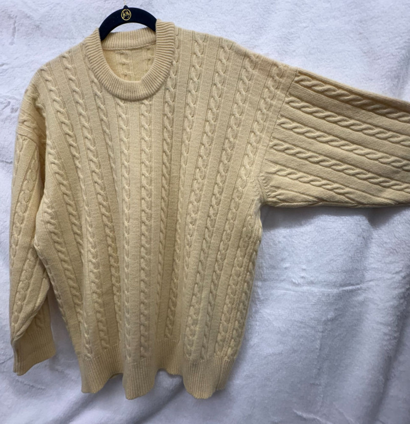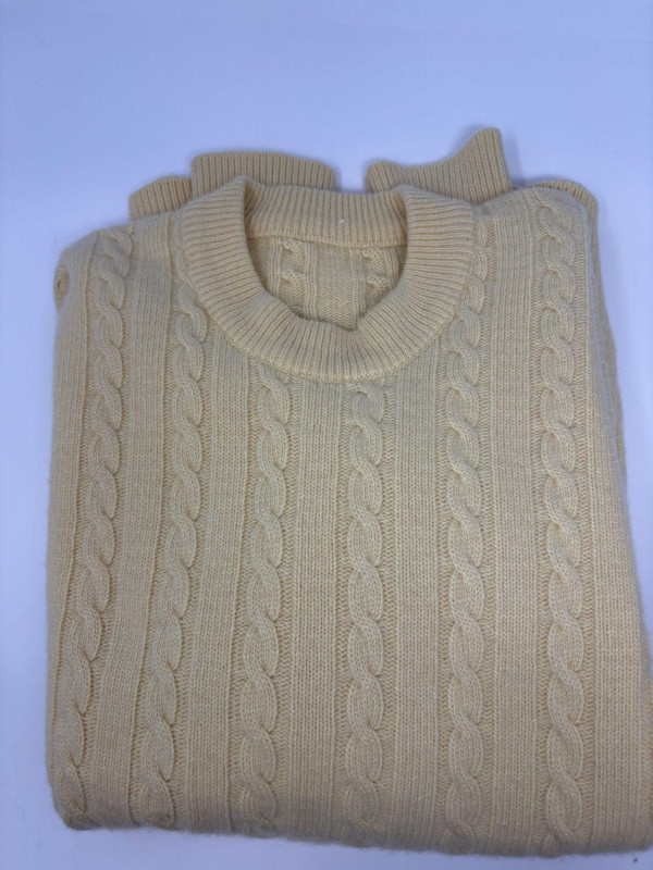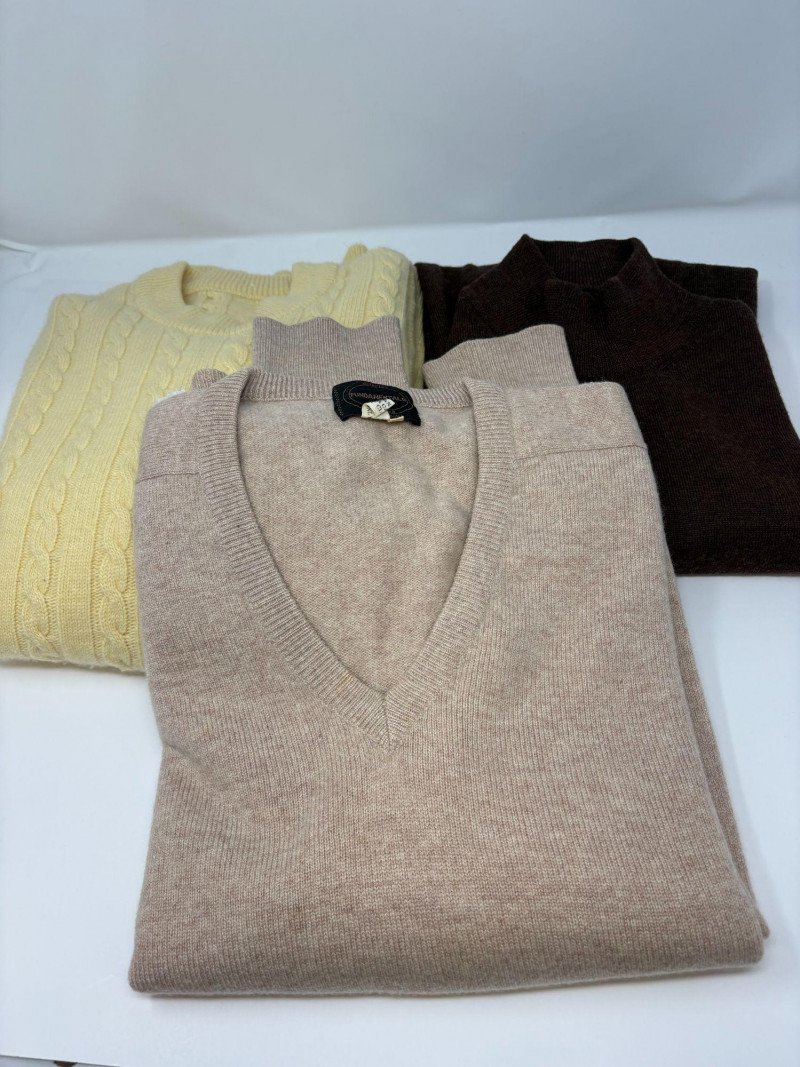 A trio of soft, timeless sweater essentials in complementary tones. This lot includes a yellow cashmere cable‑knit sweater in size Large, offering classic texture and a warm, cheerful hue; a beige heather cashmere V‑neck in size Extra‑Large, ideal for effortless layering; and a chocolate heather fine merino wool turtleneck, size Large, rich in color and perfect for elevated cold‑weather styling. Together, they create a versatile, luxurious set ready for everyday comfort or refined seasonal wear.