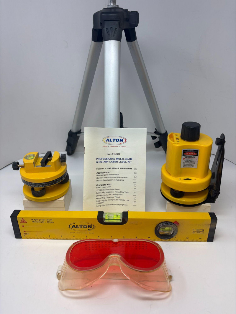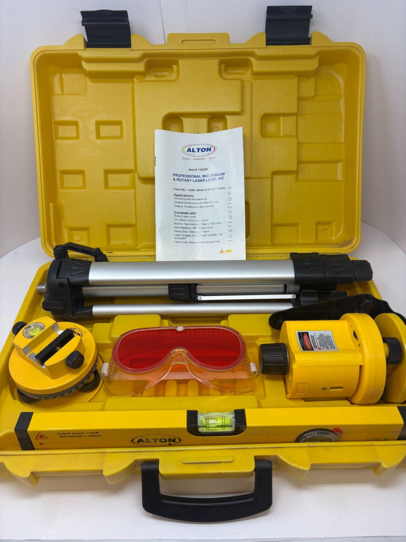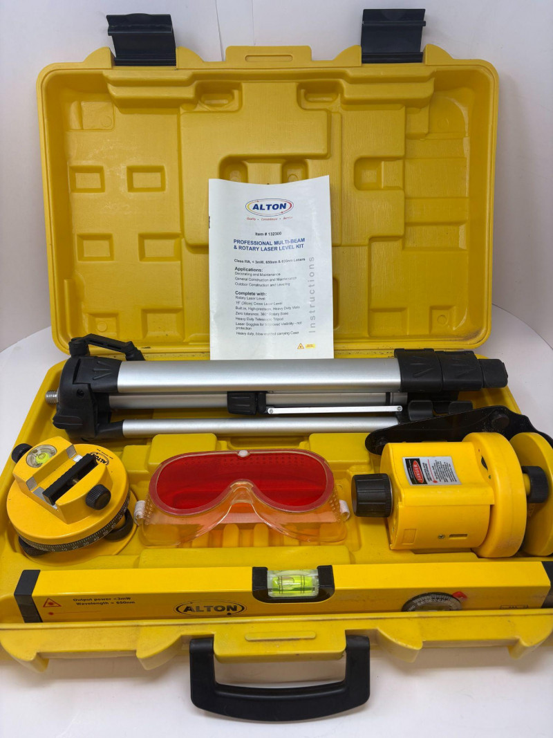 A complete Alton Professional Laser Level Kit, offered as one lot and containing six coordinated pieces that store neatly inside the original molded yellow carry case. Ideal for construction, surveying, alignment, and precision layout work. Includes (6 pieces total): Laser level unit Adjustable mounting bracket Measuring rod/leveling staff Red protective safety goggles Instruction manual Hard‑shell Alton branded carry case A practical, ready‑to‑use professional kit with all components present and fitted to the case.