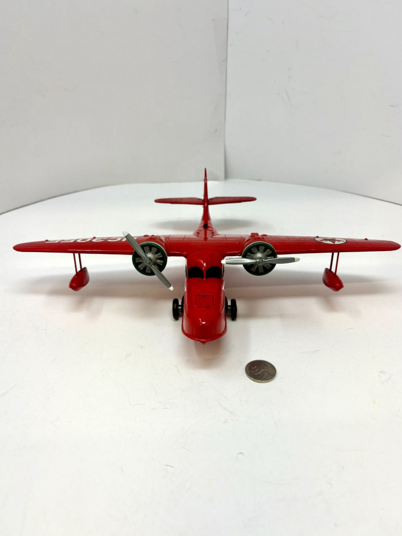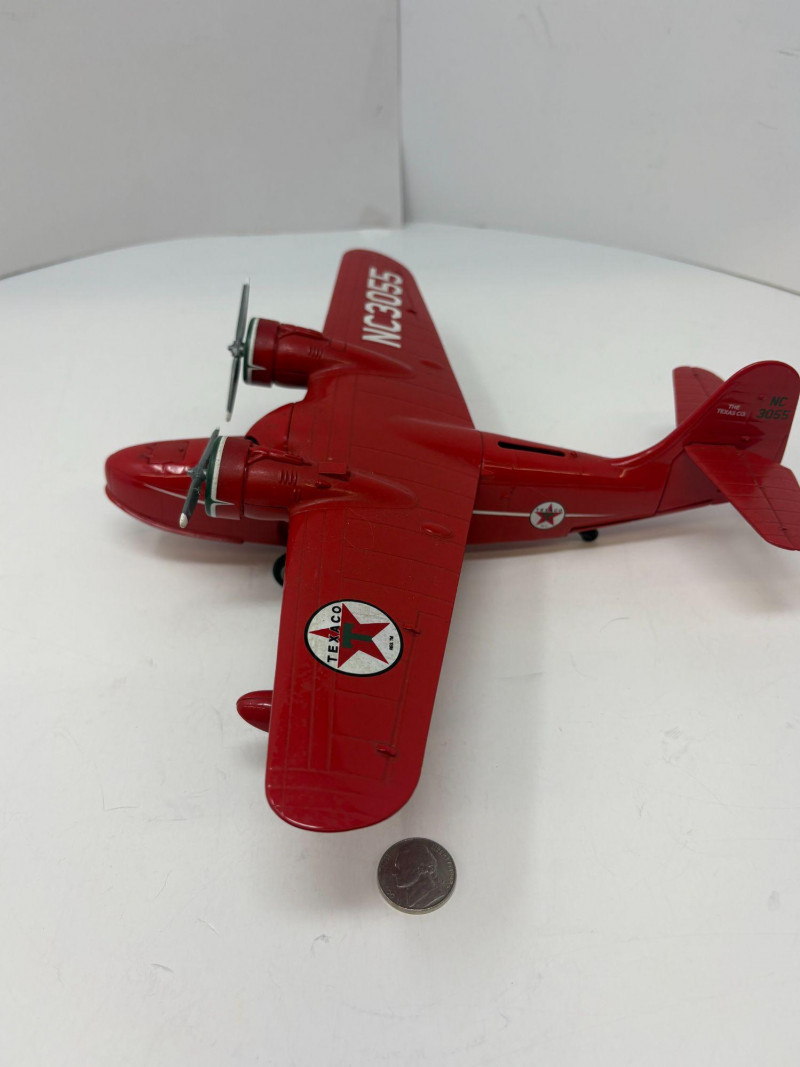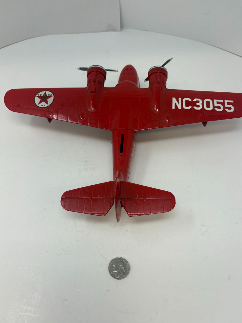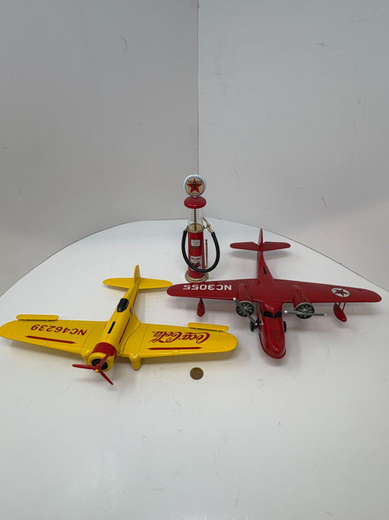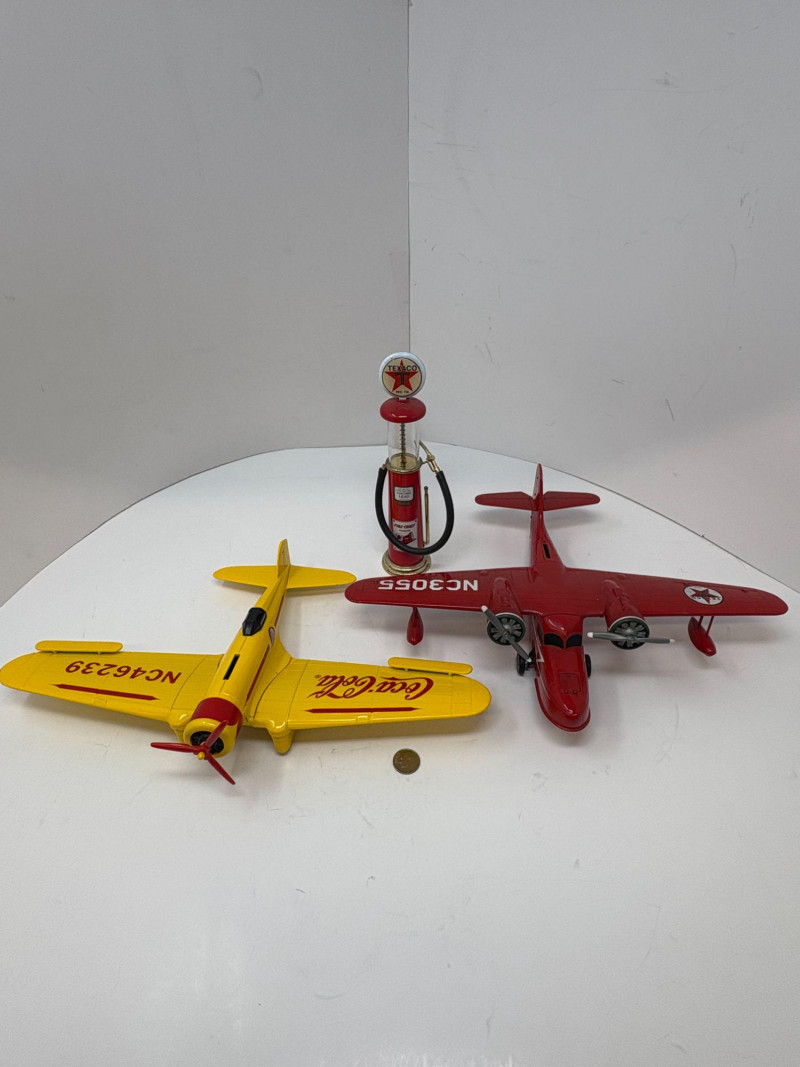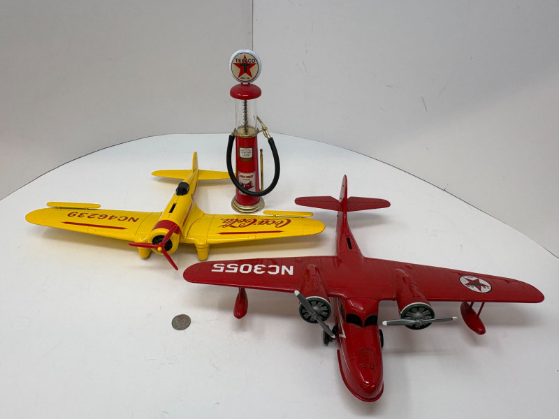 A trio of vintage‑style advertising collectibles featuring two die‑cast airplane banks and one classic Texaco visible gas pump. Each piece offers strong display presence and nostalgic branding, ideal for collectors of Coca‑Cola, Texaco, or Ertl‑produced memorabilia. Produced by The Ertl Company (embossed underside) Functional coin bank Approx. 6½" H × 12½" W Tail number: NC 462239 Bright yellow finish with Coca‑Cola branding Registration: NC3055 Functional coin bank Classic red Texaco livery Approx size 12" x 9.5" Approx. 8" H × 1½" W Fire‑Chief Gasoline styling Red body with Texaco star globe Perfect scale companion to the planesIncluded in This Lot