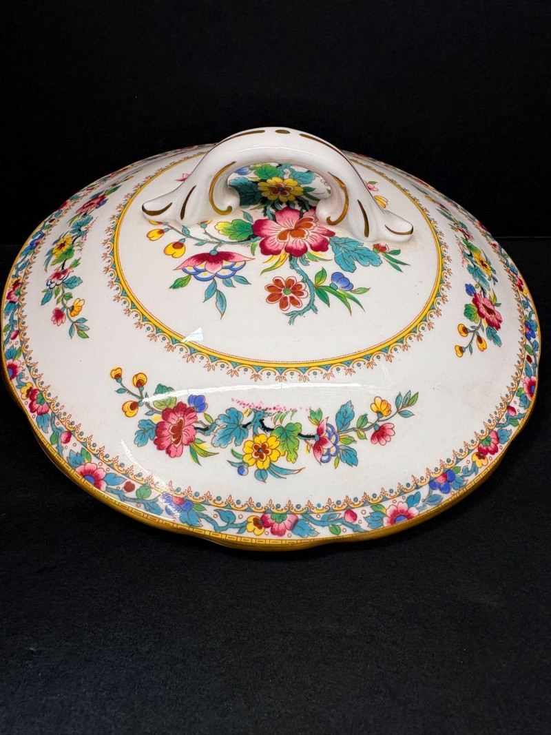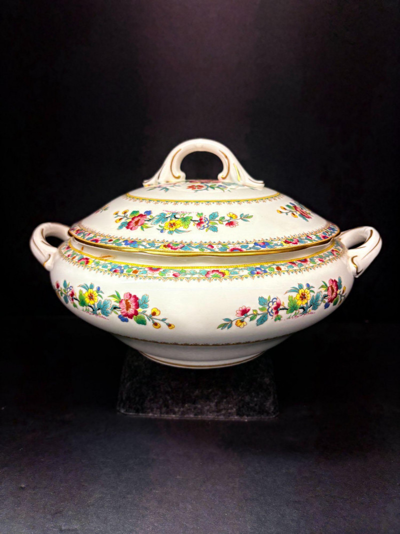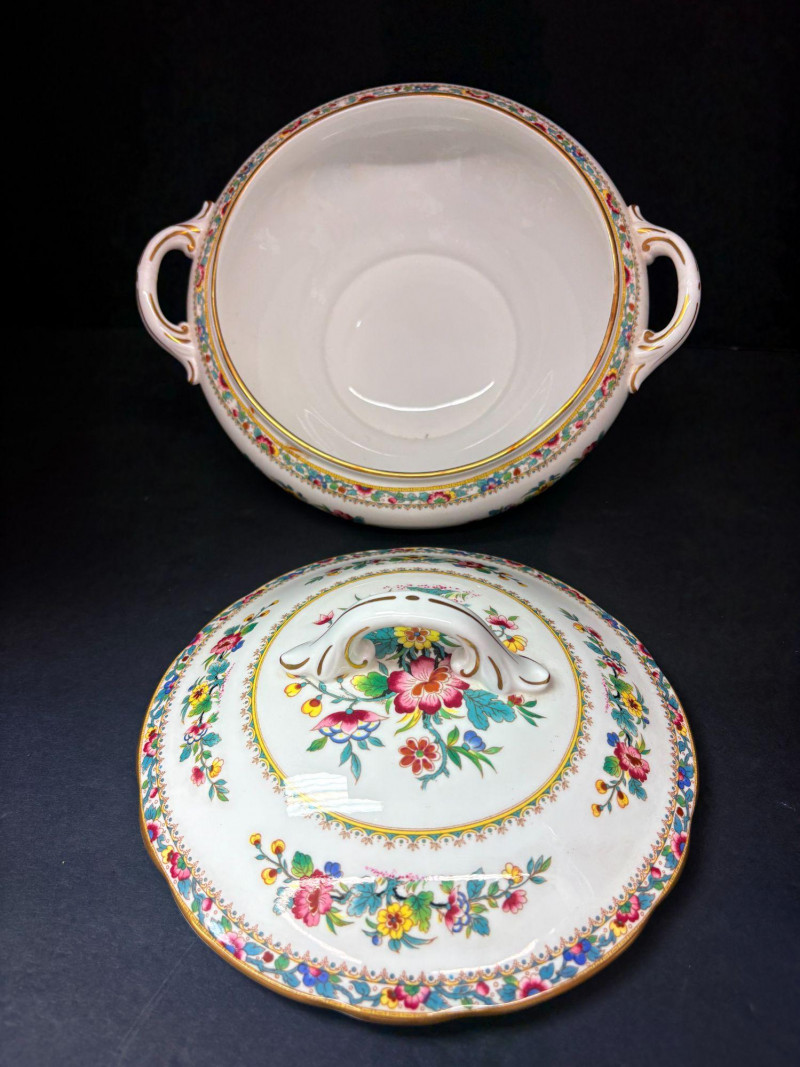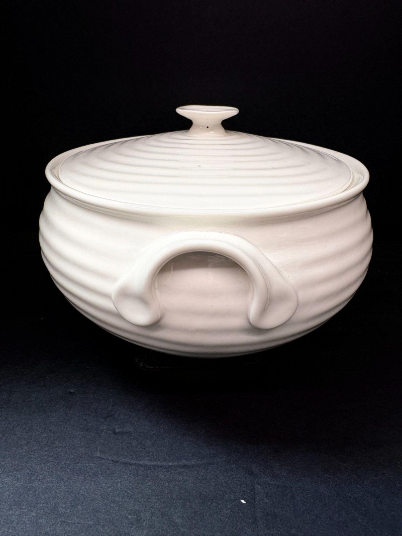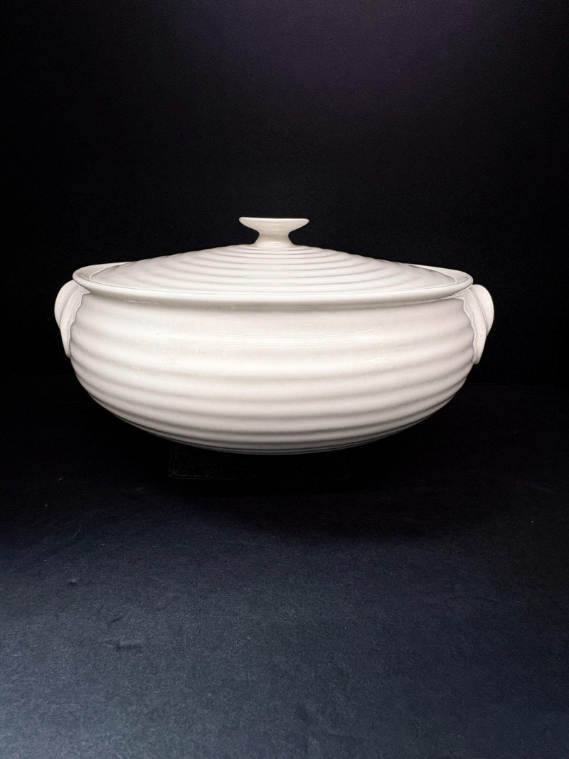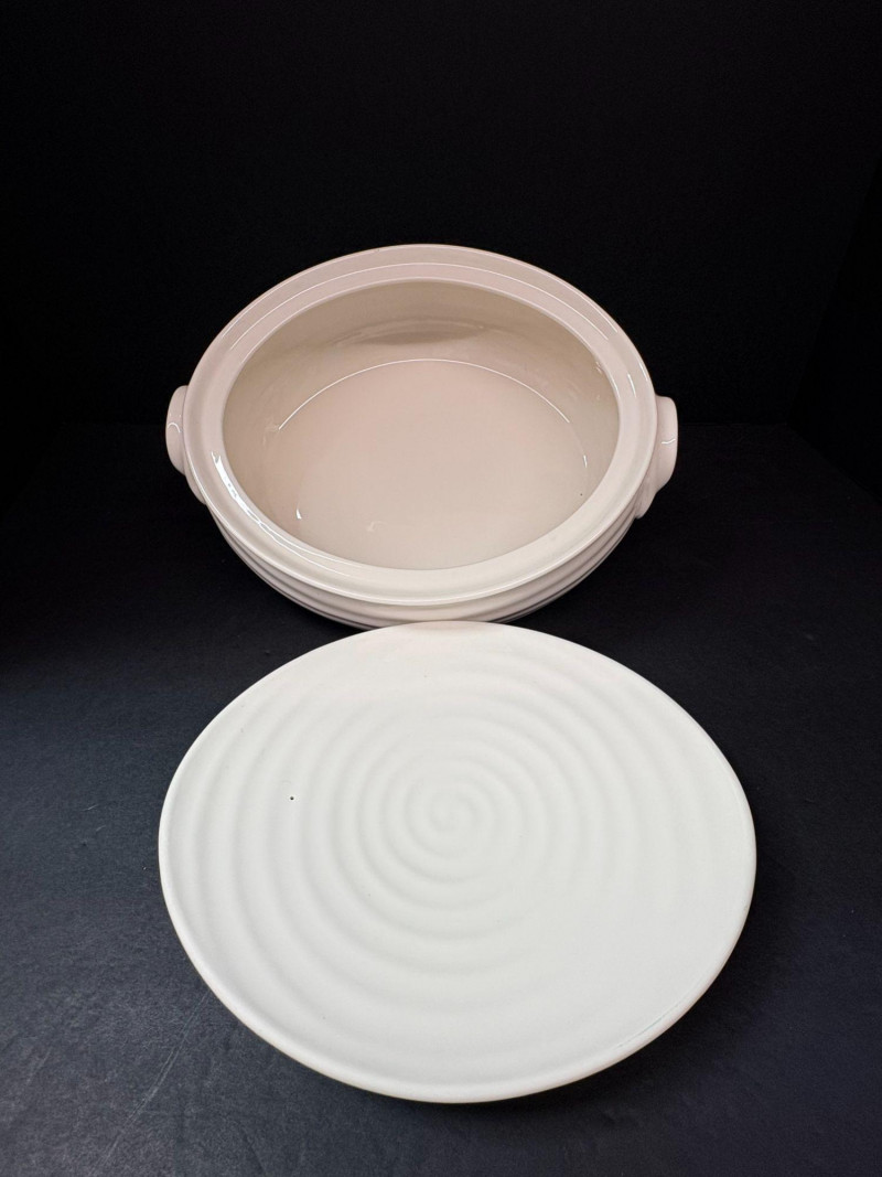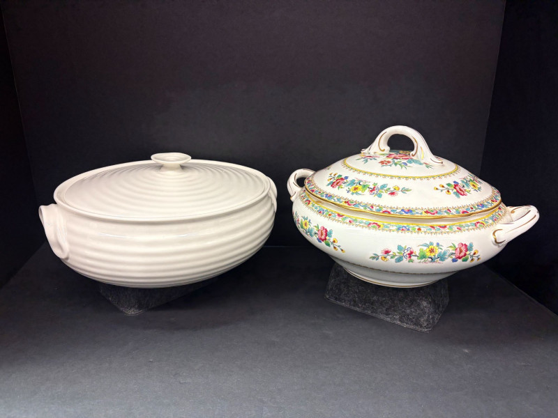 A two‑piece casserole pairing, blending classic English porcelain with modern oven‑to‑table design. The first is a Coalport Ming Rose covered casserole, showcasing the pattern’s signature multicolor florals and delicate 24K gold rim. Its rounded form measures approximately 10" long, 7.5" wide, and 6.5" high with lid, an elegant presentation for serving or display. Complementing it is a crisp white Sophie Conran for Portmeirion small oval covered casserole, crafted in the line’s signature rippled porcelain. Dishwasher, microwave, freezer, and oven‑safe, it measures approximately 8.5" long, 5.5" wide, and 4.5" high with lid — a versatile, contemporary piece suited for everyday use. A mix of traditional Coalport artistry and modern Portmeirion practicality, ready for kitchen or collection.