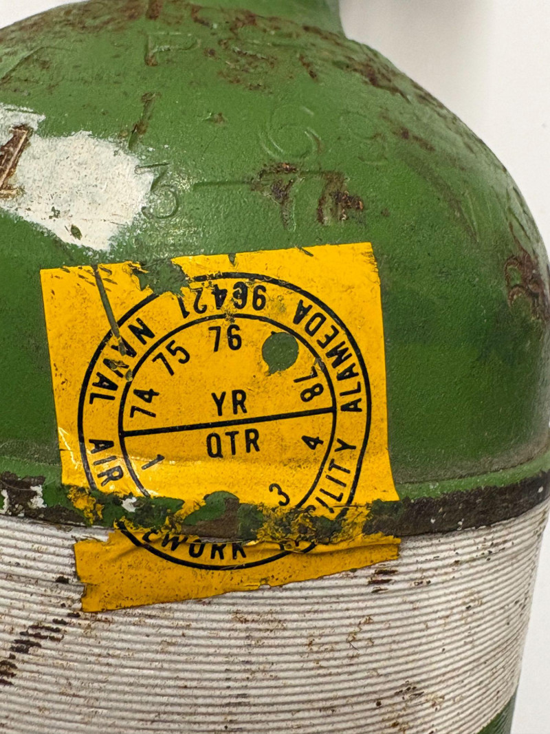 The first tank is a slim aviator‑style cylinder measuring approximately 14.5 inches tall and 4 inches wide, marked with manufacturer stamps and hydrostatic test dates from the 1970s.