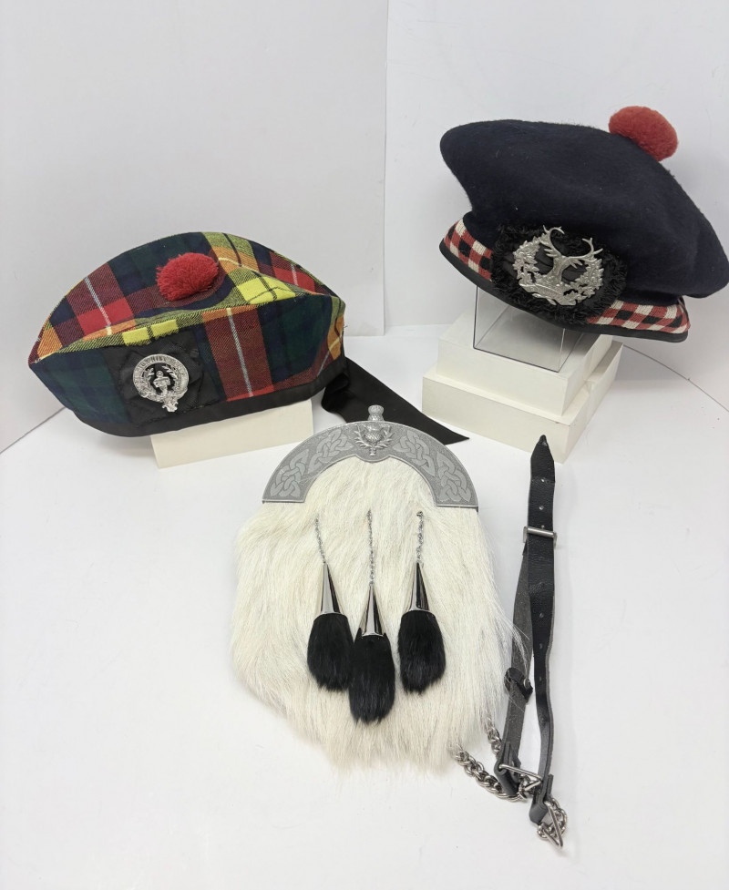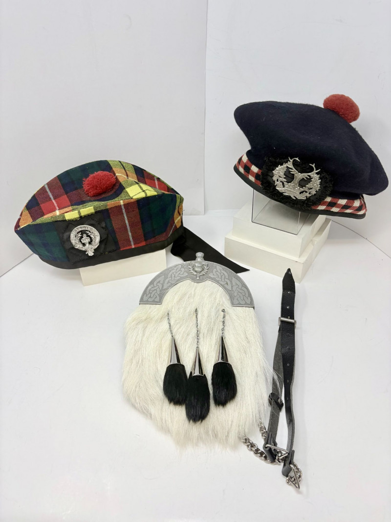 Lot # 128 - Scottish Highland Dress Trio-Leather Sporran & Two Traditional Bonnets