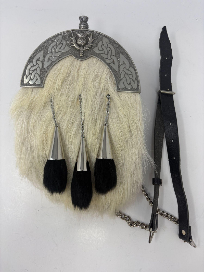 A three‑piece selection of traditional Scottish Highland dress, blending mid‑century military heritage with classic ceremonial style. This curated trio includes a black leather sporran with chain belt, a tartan Balmoral bonnet with red toorie, and a 1955‑dated bonnet marked “B. HOOT,” offering collectors an appealing mix of authenticity, craftsmanship, and display value. Black Leather Sporran
