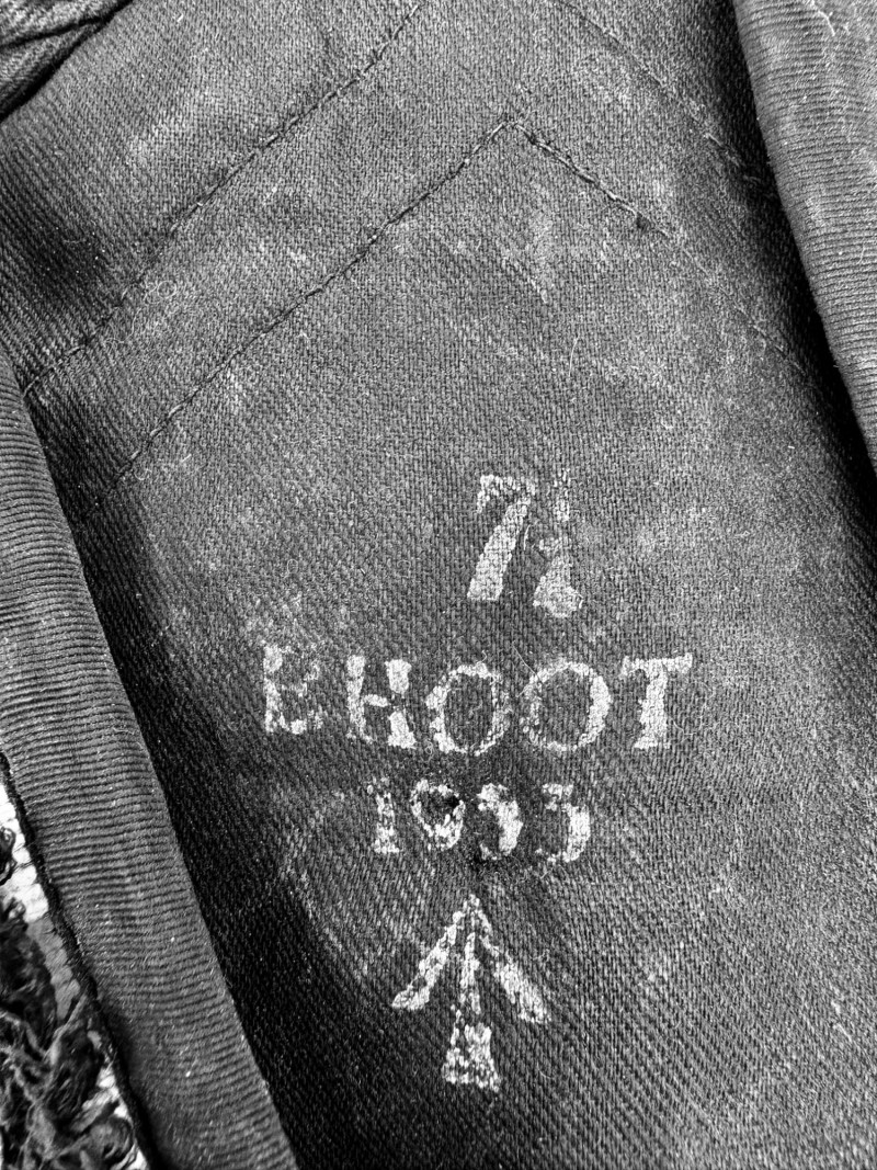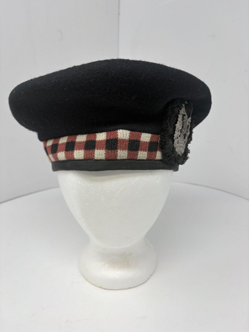 Dark wool bonnet with interior stamp: “7¼ – B. HOOT – 1955.” A desirable dated example for collectors of regimental attire.