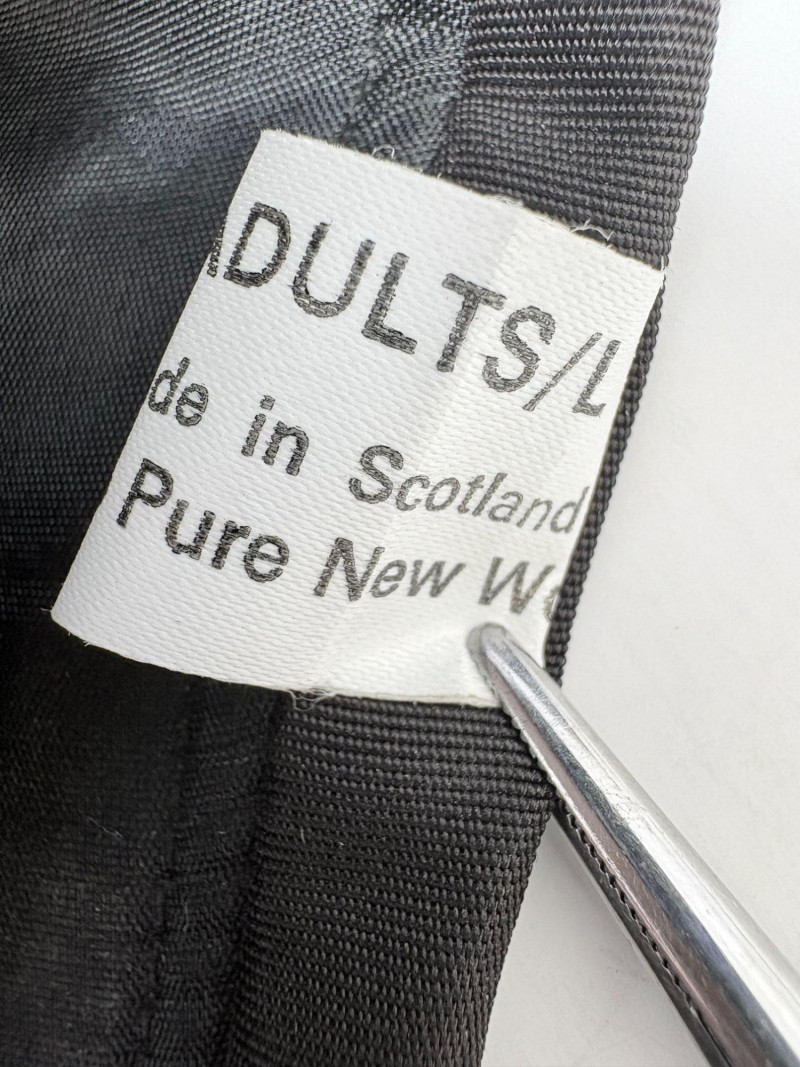 Pure wool Balmoral bonnet in classic tartan with red pom and black ribbons; interior label reads “Adults/L – Made in Scotland – Pure New Wool.”