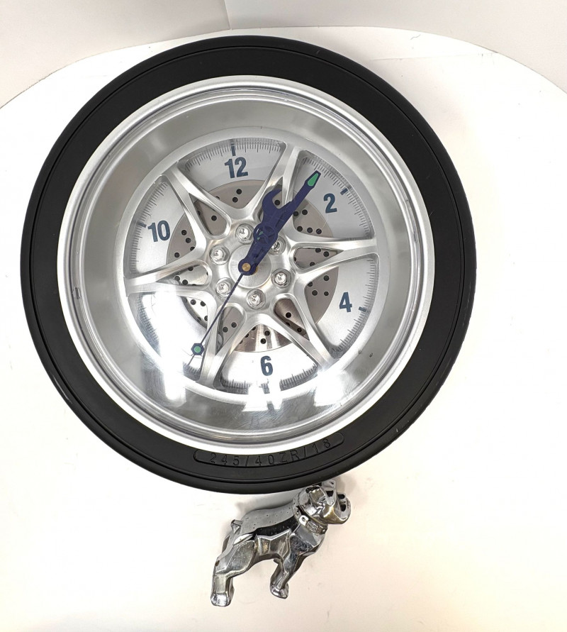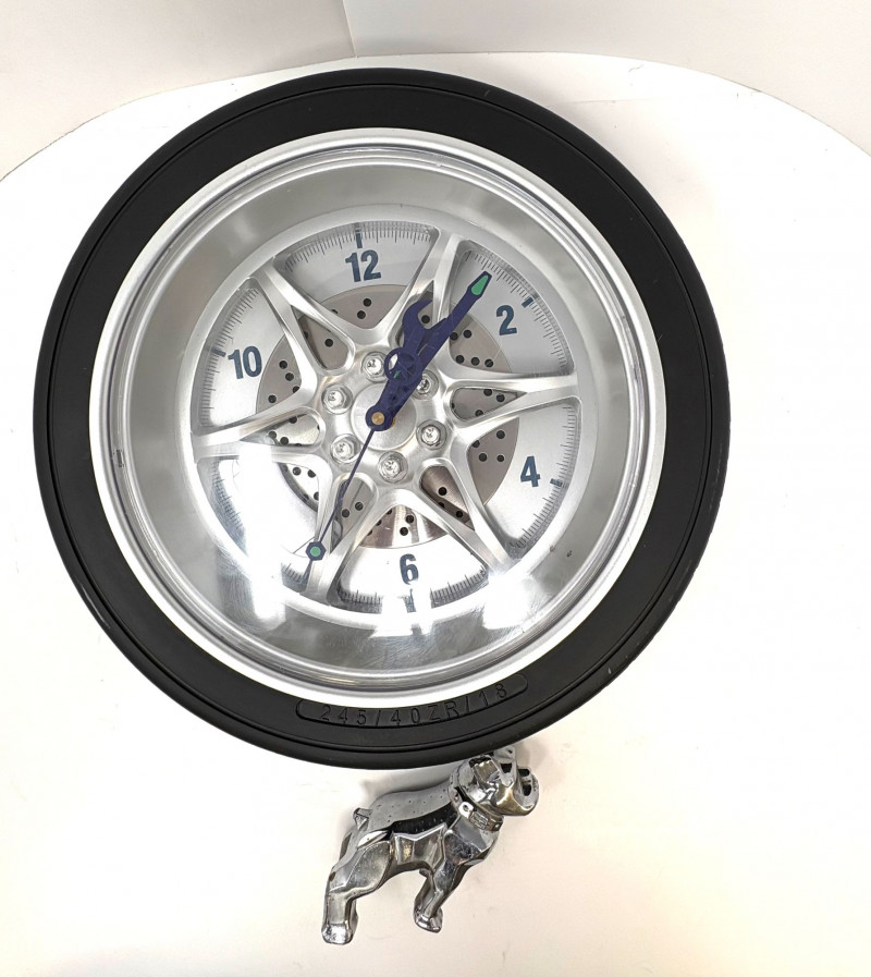 A two‑piece automotive‑themed lot featuring a large wheel‑design wall clock and a vintage metal Mack Truck bulldog. 1. Wheel Wall Clock
