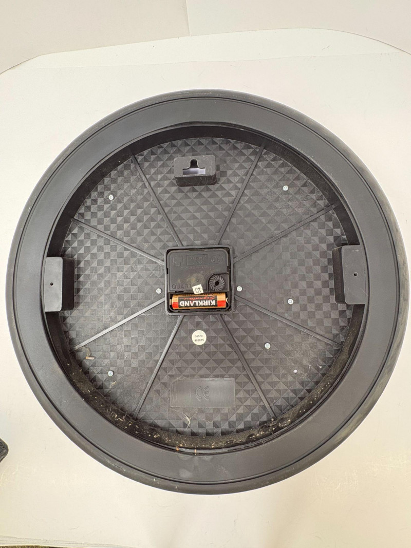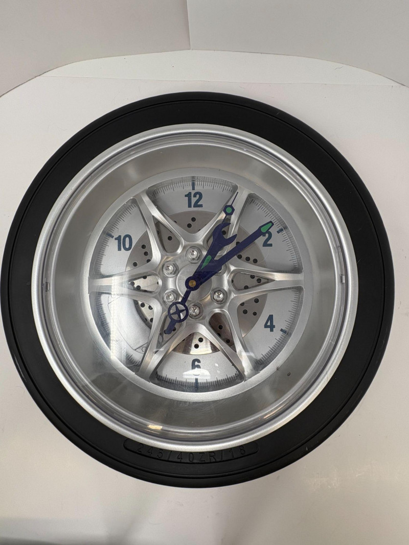 A novelty wall clock styled as a chrome automotive wheel with bold numerals and classic clock hands. Measures approximately 13¾" round. Battery‑operated movement with rear access panel. A standout décor piece for garage, shop, or man‑cave displays. 2. Metal Mack Truck Bulldog