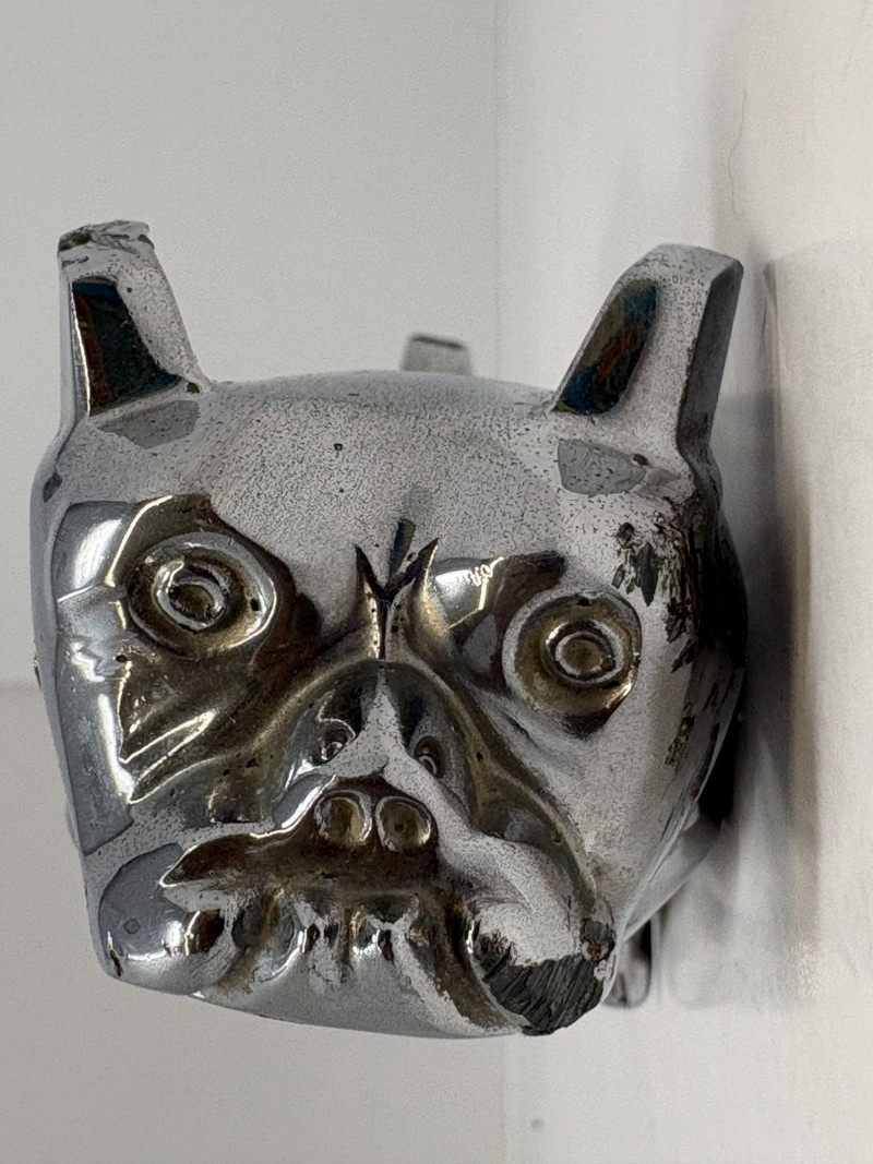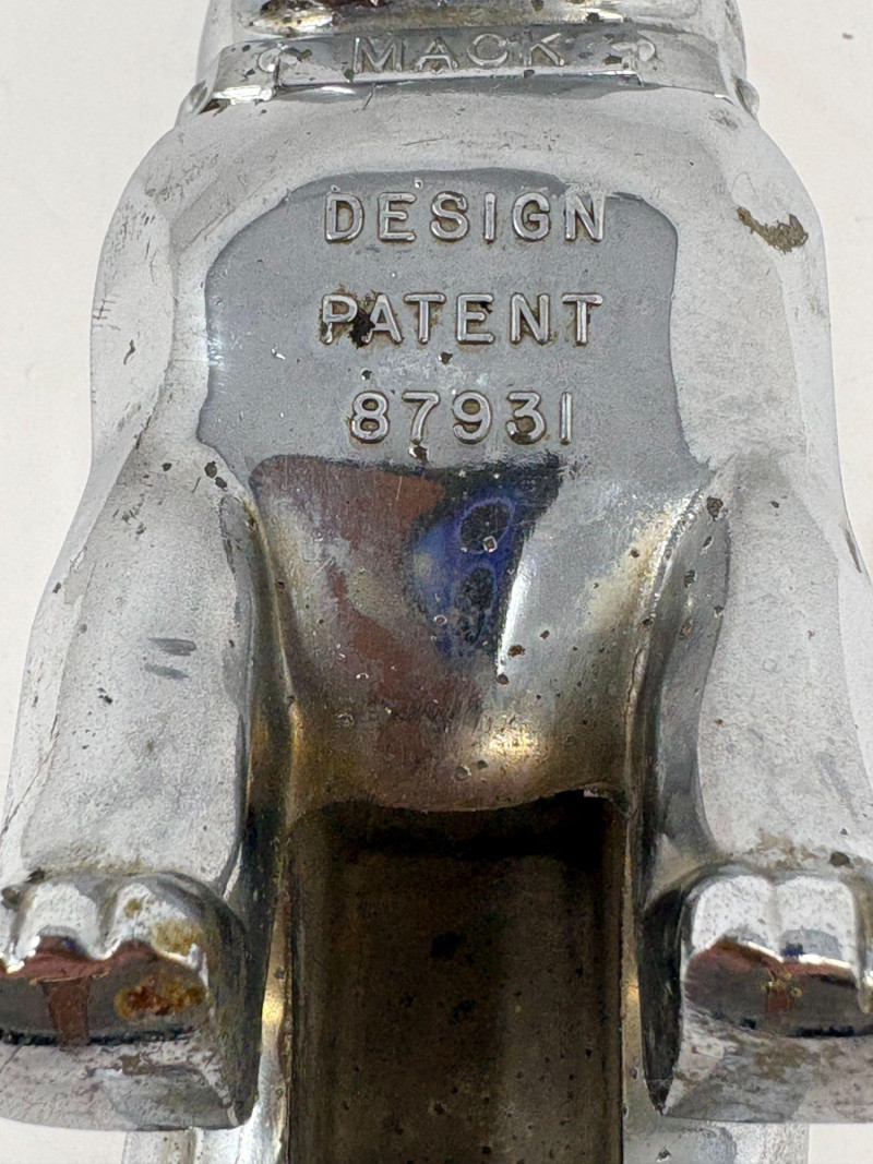 A solid metal Mack bulldog figurine marked “Design Patent 87931” on the reverse. Measures approximately 4½" long × 4½" high. Displays well alongside the clock or as a standalone collectible for trucking and Mack memorabilia enthusiasts. A fun pairing for collectors of automotive décor, trucking history, or vintage novelty pieces.