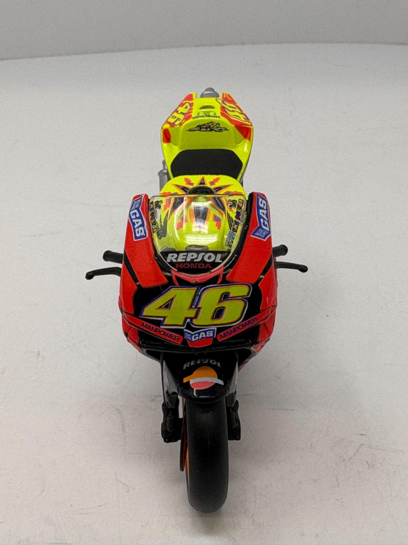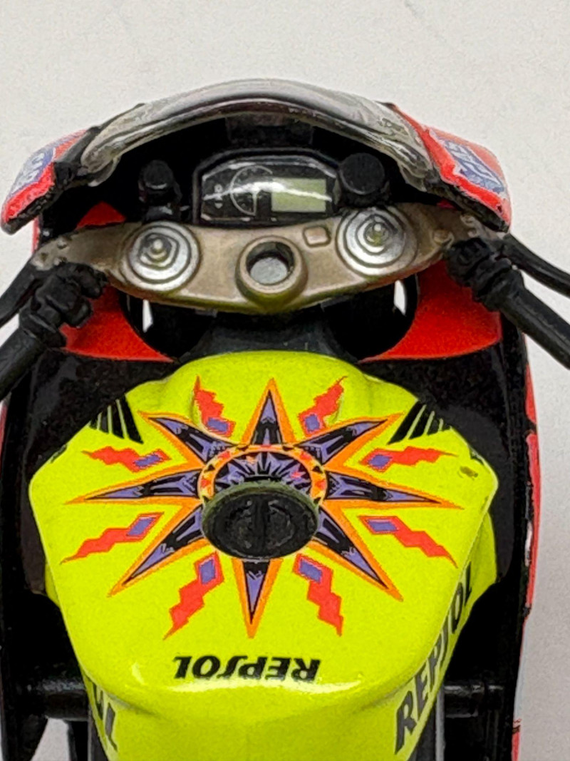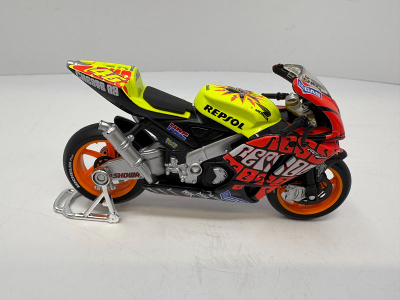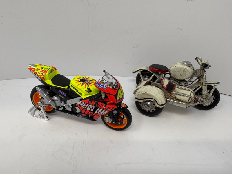 A compact two‑piece set featuring a vibrant Repsol Honda racing bike and a classic Indian‑style cruiser with wide stance and retro detailing. Both models offer strong display presence and make an appealing addition to any collector’s shelf. Repsol Racing Bike – 4 1/2" L × 1 1/2" W × 2 3/4" H
