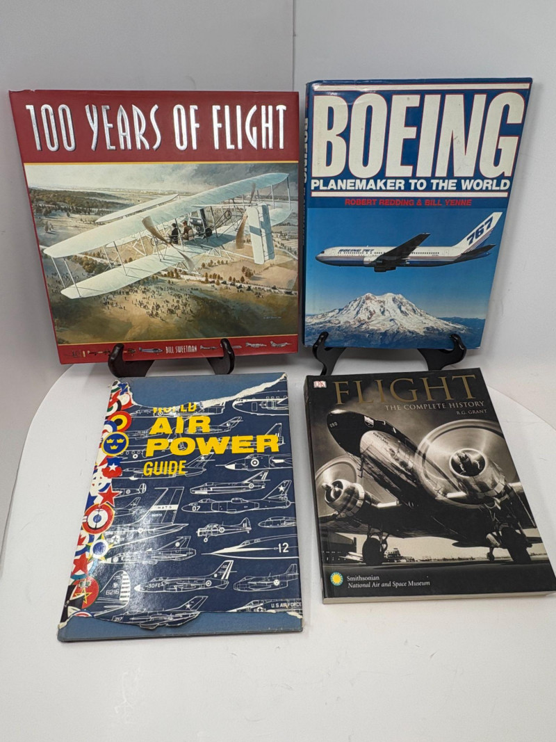 A four‑volume lot celebrating the evolution of flight and American aerospace achievement. This lot brings together richly illustrated works spanning early aviation, modern aircraft, and the legacy of Boeing. Ideal for collectors, enthusiasts, and display. Includes: “100 Years of Flight” — A comprehensive visual history of aviation milestones from the Wright brothers forward. “Flight: 100 Years of Aviation” — A large-format, image‑driven chronicle of global aviation progress. “The U.S. Air Power Guide” — Softcover reference featuring U.S. military aircraft, specifications, and historical context. “Boeing: Planemaker to the World” by Robert Redding & Bill Yenne — Hardcover volume detailing Boeing’s commercial, military, and space programs, with full contents shown in photos.