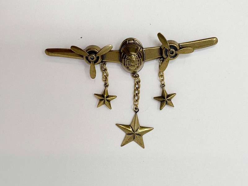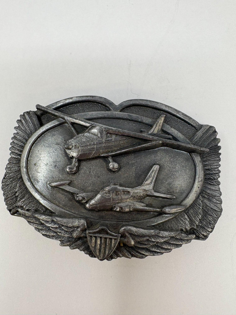 A six‑piece aviation‑themed grouping featuring three vintage belt buckles and three coordinating pins, all drawn from mid‑century to late‑20th‑century aviation motifs. The lot includes American Aviation commemoratives, military‑style insignia, and classic winged emblems. Includes: American Aviation Belt Buckle — approx. 3¼ in. x 2¼ in. Bronze Military‑Style Buckle — approx. 3 in. x 2 in. Gold Eagle Buckle — approx. 3¼ in. x 2¼ in. Gold Wings & Stars Pin — approx. 1½ in. Colorful Airplane Pin — approx. 1 in. Round Military‑Style Pin/Button — approx. ¾ in. Please see photos for design details and condition.