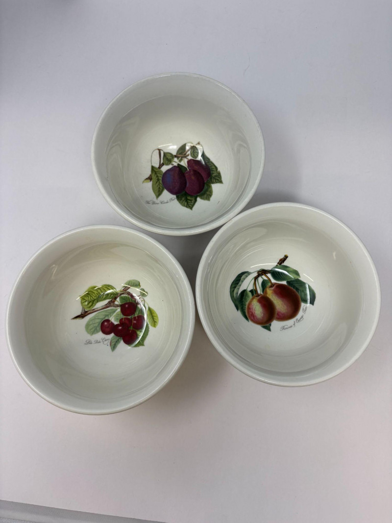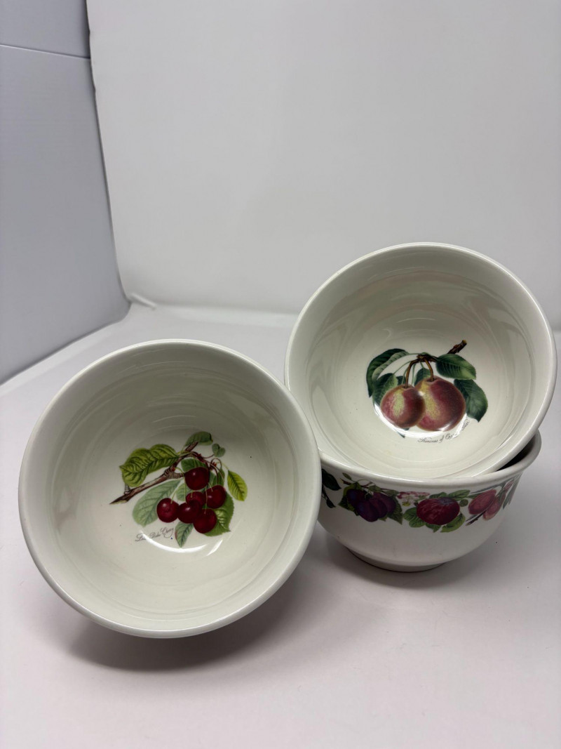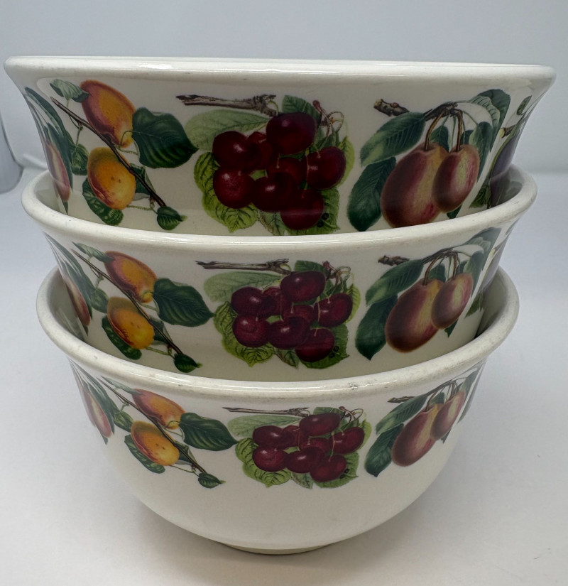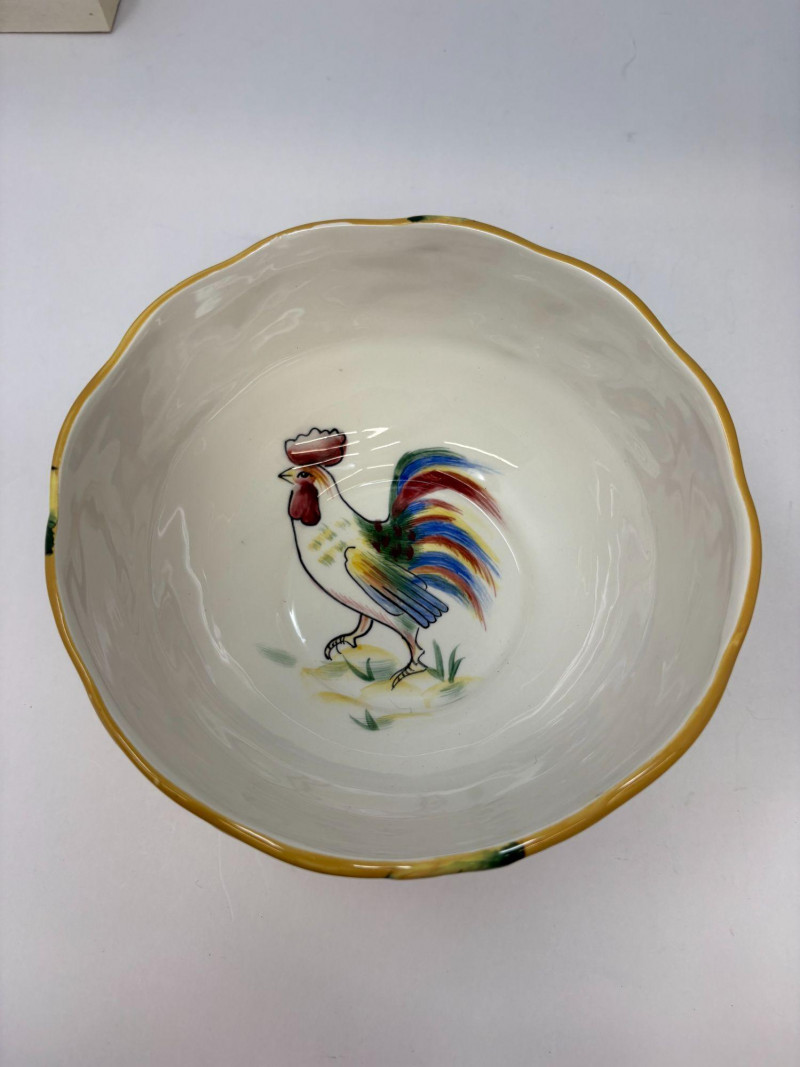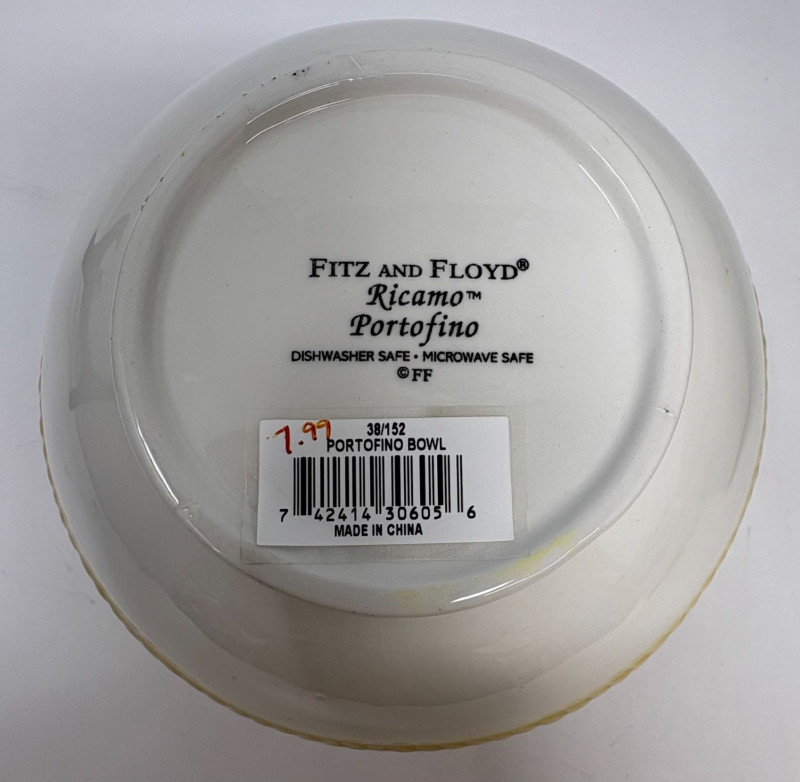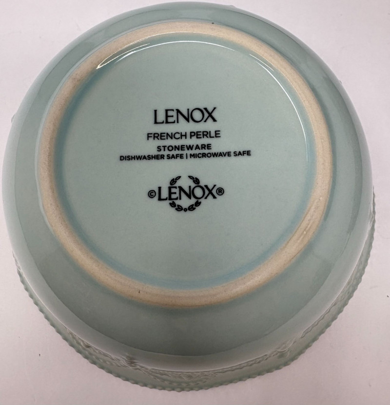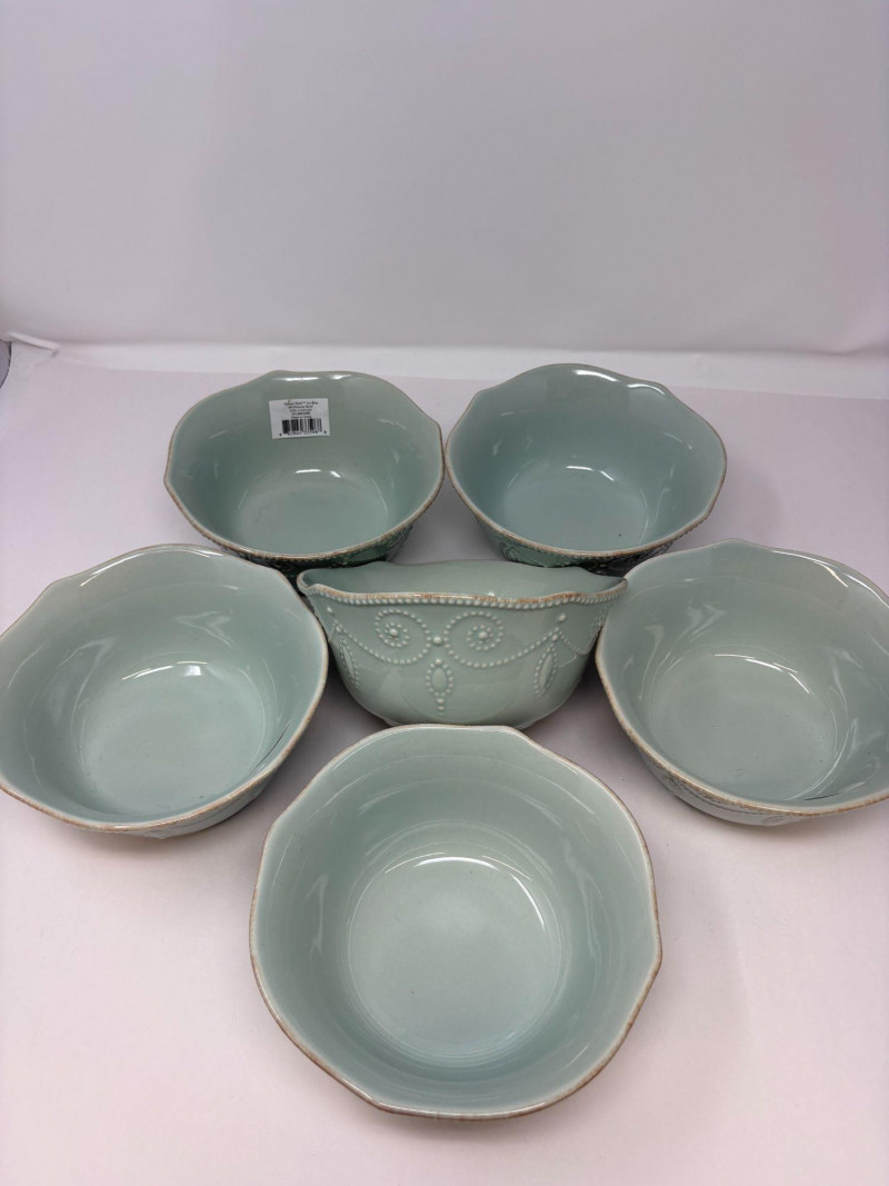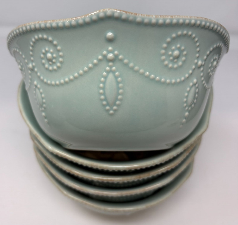 The first is a set of six Lenox French Perle bowls, finished in the signature soft blue‑green glaze with scalloped rims and beaded detailing—an elegant, versatile design that transitions effortlessly from everyday dining to elevated presentation. Paired with them is a Fitz and Floyd Portofino grouping, including three small fruit‑motif bowls and one larger coordinating bowl. This line is known for its vibrant hand‑painted detailing and Mediterranean character, bringing warmth and color to any table. Together, these pieces offer a charming blend of classic Lenox refinement and the lively artistry of Fitz and Floyd.