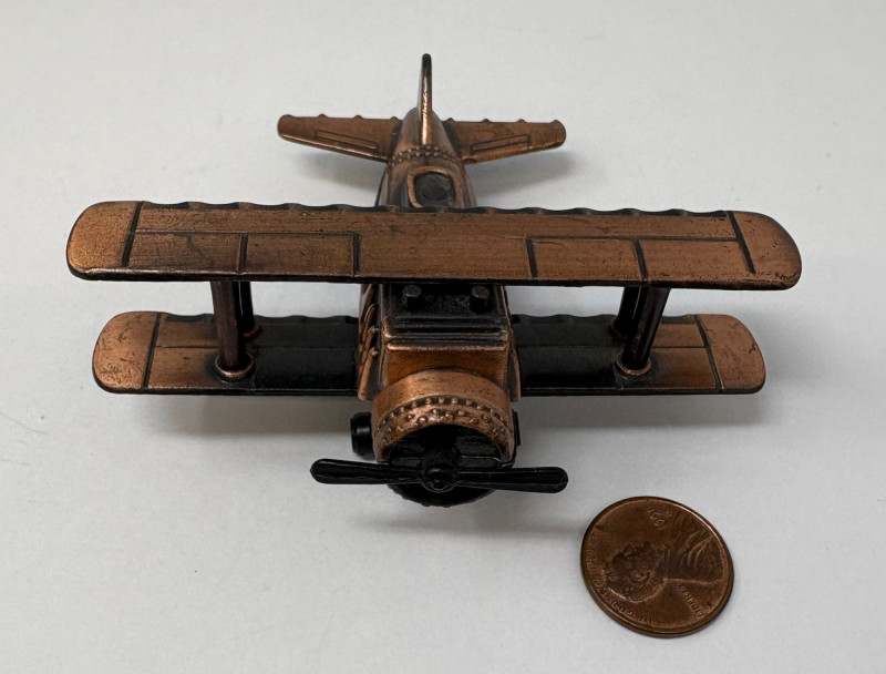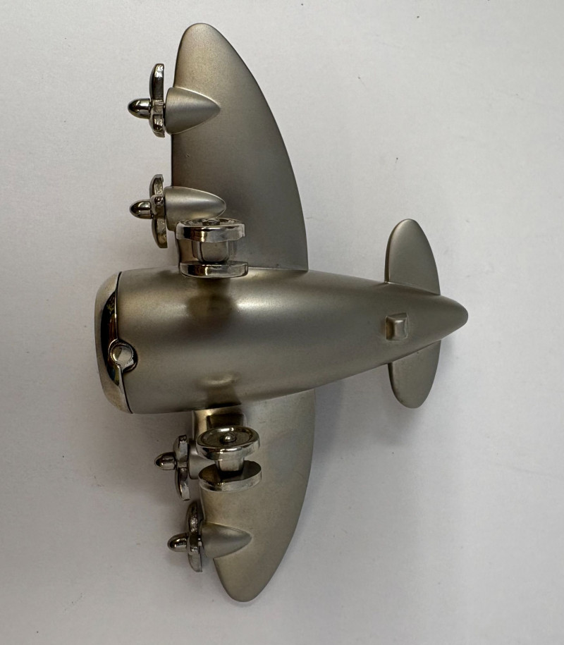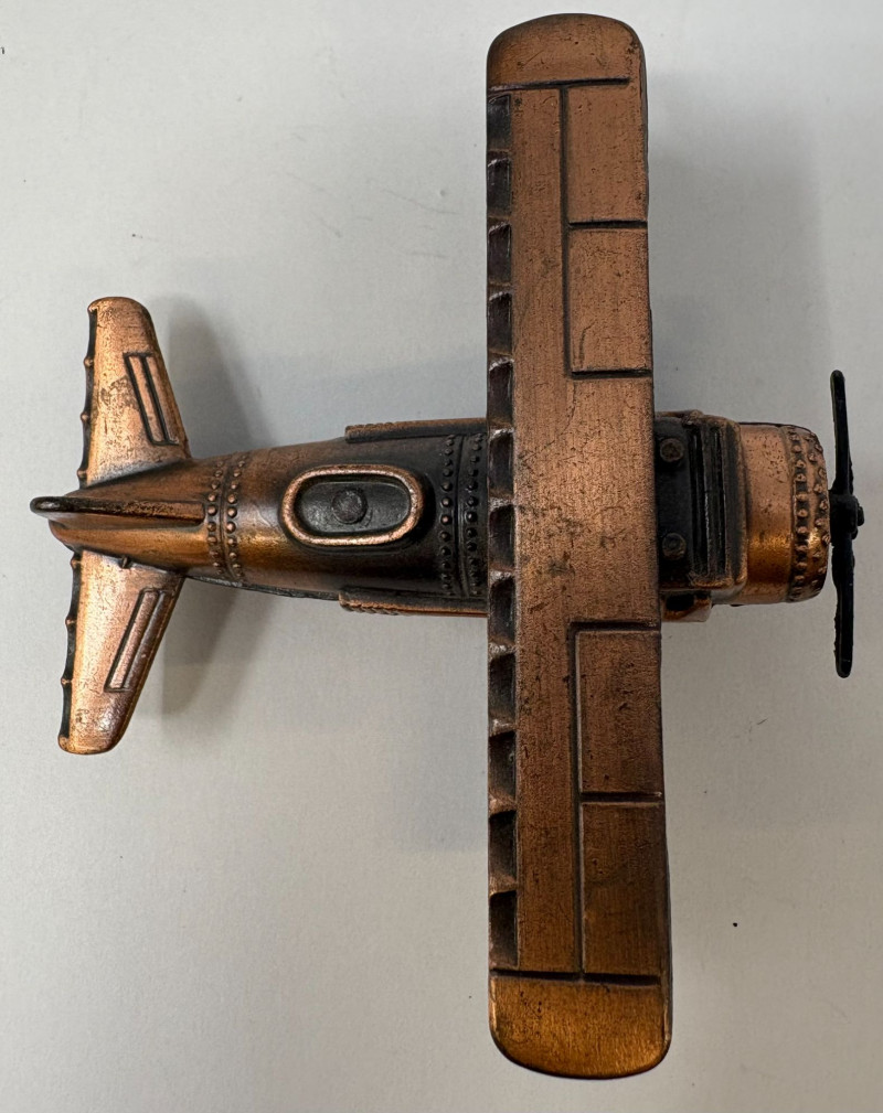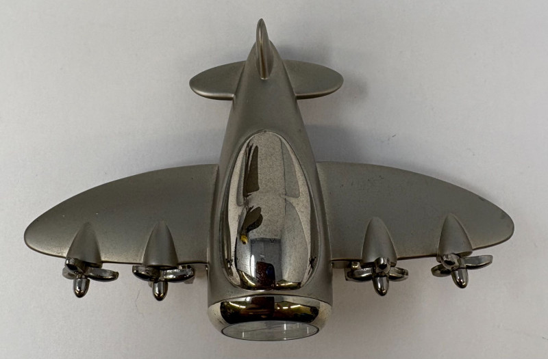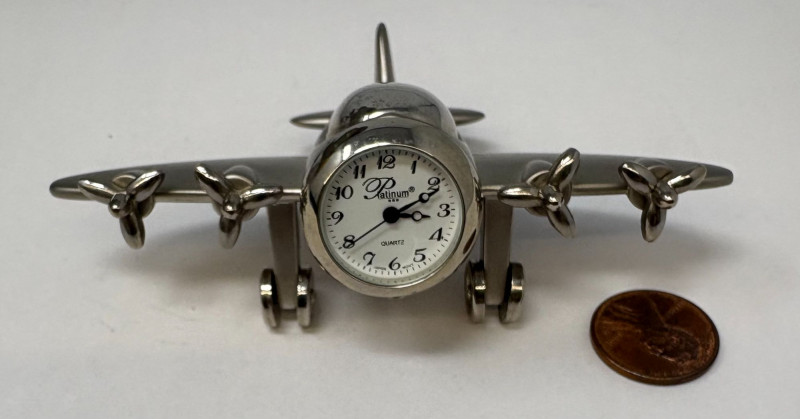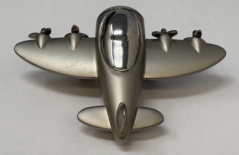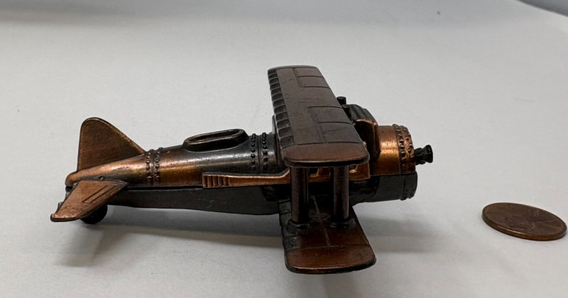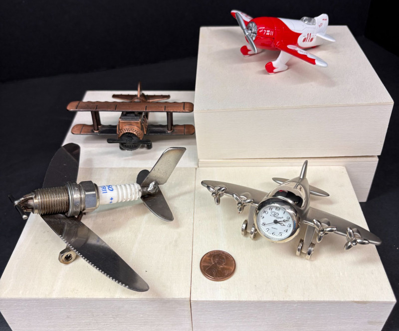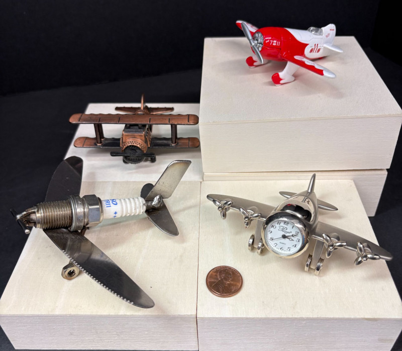 A four‑piece assortment of miniature airplanes, all crafted iwith varied finishes and details. One features a built‑in clock (untested), and another includes a white insulator marked “W.T.E.”, adding a touch of industrial charm. The red-and-white aircraft is glossy painted Polymer, offering a bright contrast to the silver and bronze tones of the others. Metal Airplane with Clock: 3½" L × 3½" W Metal Airplane with White Insulator (“W.T.E.”): 3½" L × 3½" W Small Metal Airplane: 3" L × 3" W Red Glossy Polymer Airplane: 3½" L × 3½" W A compact, character-rich grouping ideal for aviation collectors, desk décor, or a small curated display.Approximate Measurements