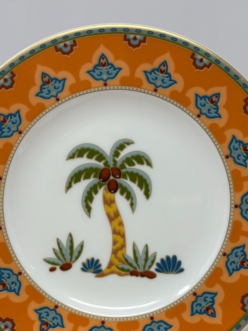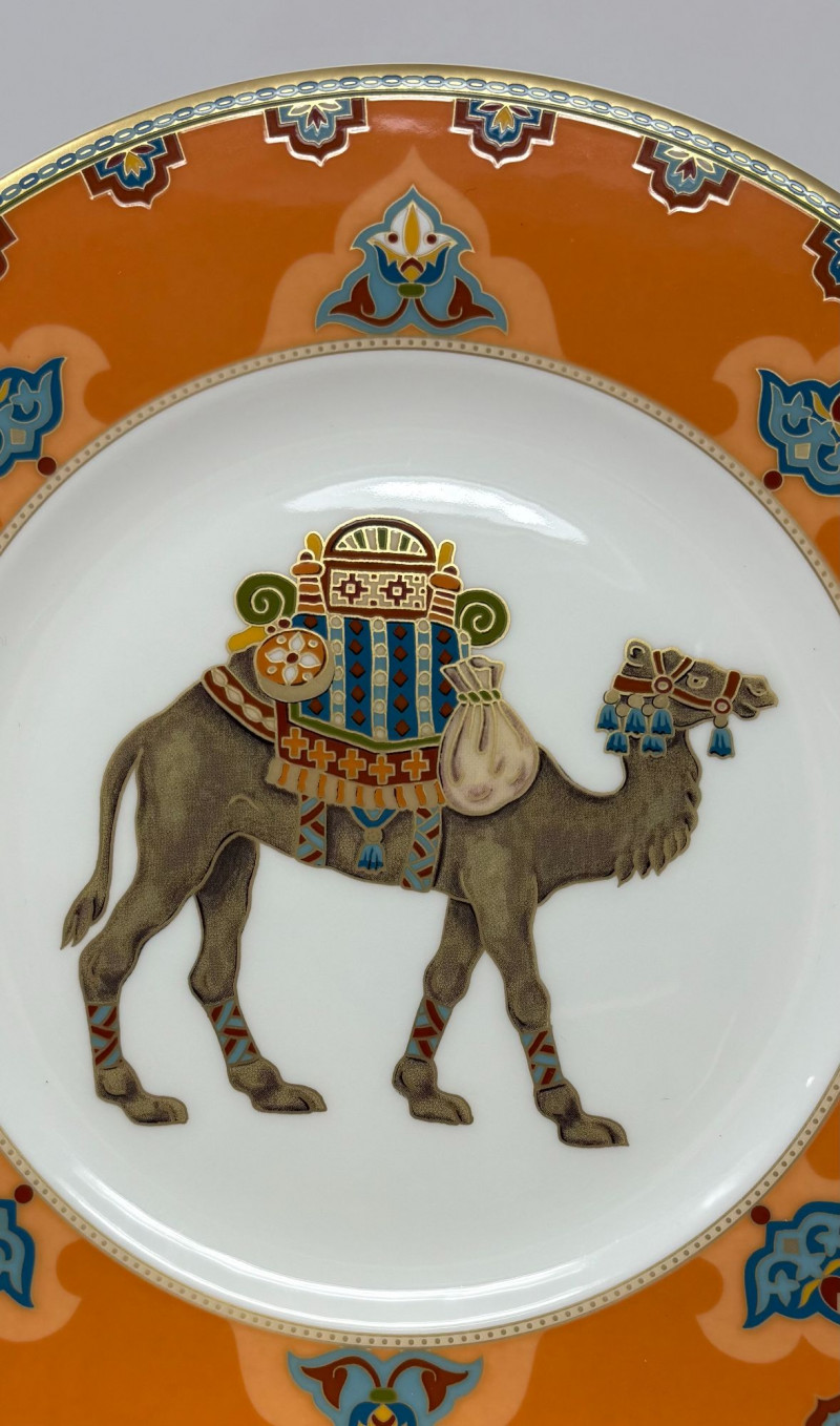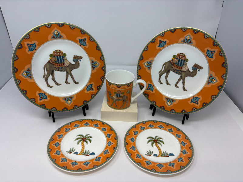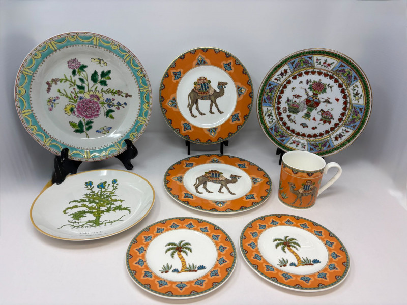 An eight‑piece assortment anchored by five Villeroy & Boch Samarkand Mandarin camel‑motif pieces, celebrated for their jeweled borders, warm mandarin palette, and distinctive caravan imagery. Paired with three floral and botanical plates, this grouping blends global elegance with decorative charm. 2 dinner plates 2 dessert plates 1 mug Globe Thistle / Echinops ritro botanical plate Floral famille‑rose style plate Additional floral decorative plateIncludes — 5 Villeroy & Boch Samarkand Mandarin Camel Pieces: