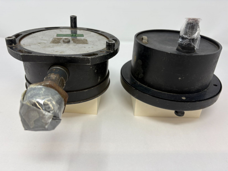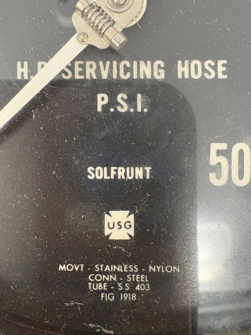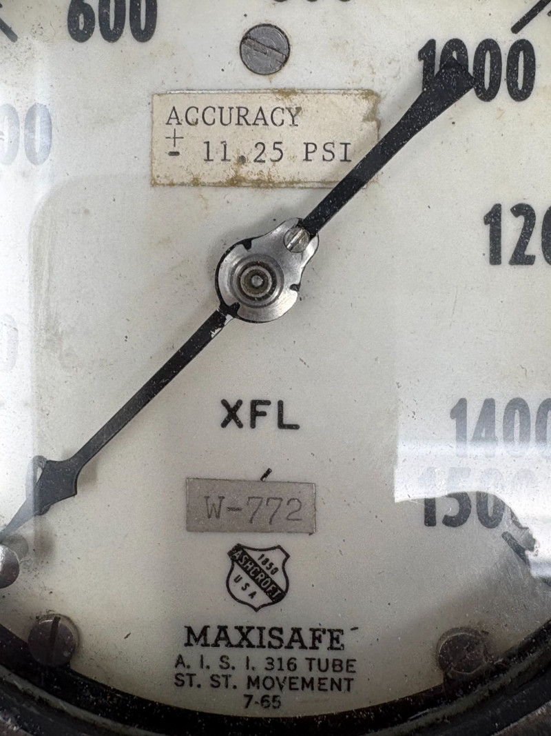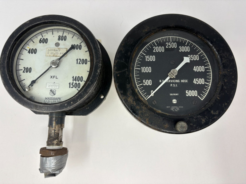 Compact two‑gauge set featuring a Maxisafe USA 1500‑PSI dial with stainless housing and servicing‑hose fitting, paired with a Solfrunt PSI gauge showing classic industrial styling. Both pieces retain authentic workshop character and make strong functional or display components. Untested. Maxisafe: 9" H × 6" W × 3¼" D Solfrunt: 6" H × 5" W × 1" DApprox. Sizes