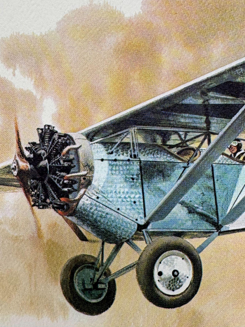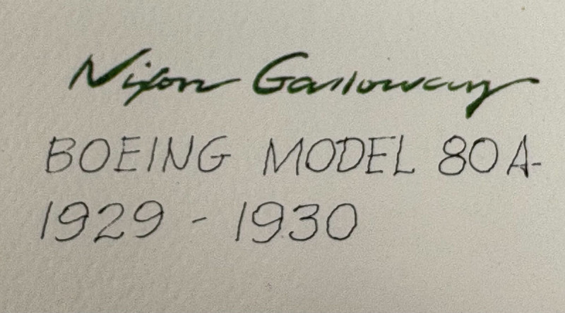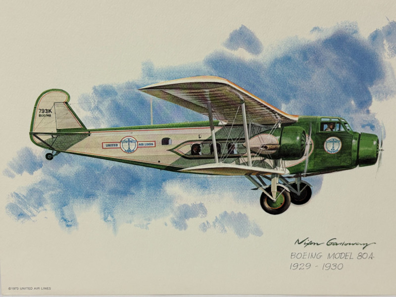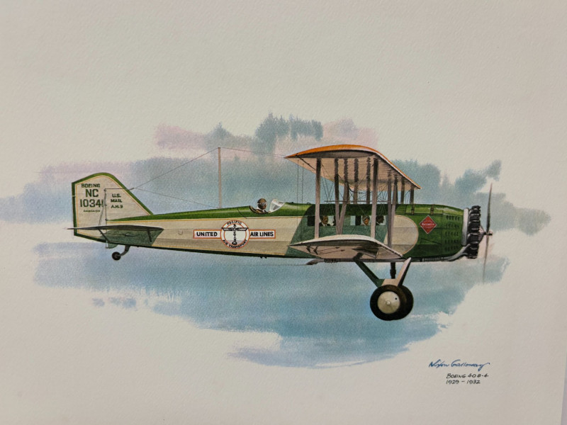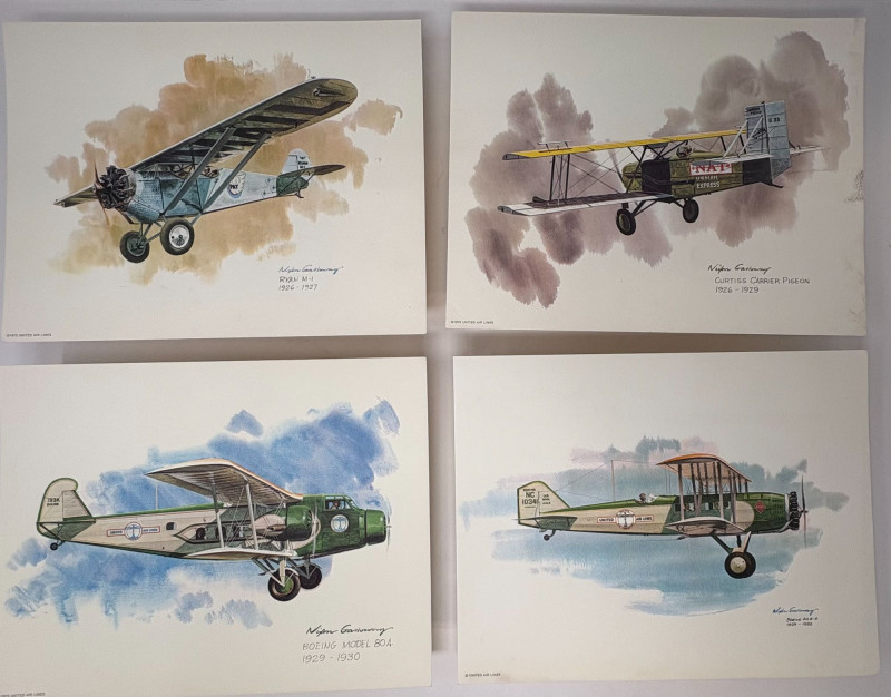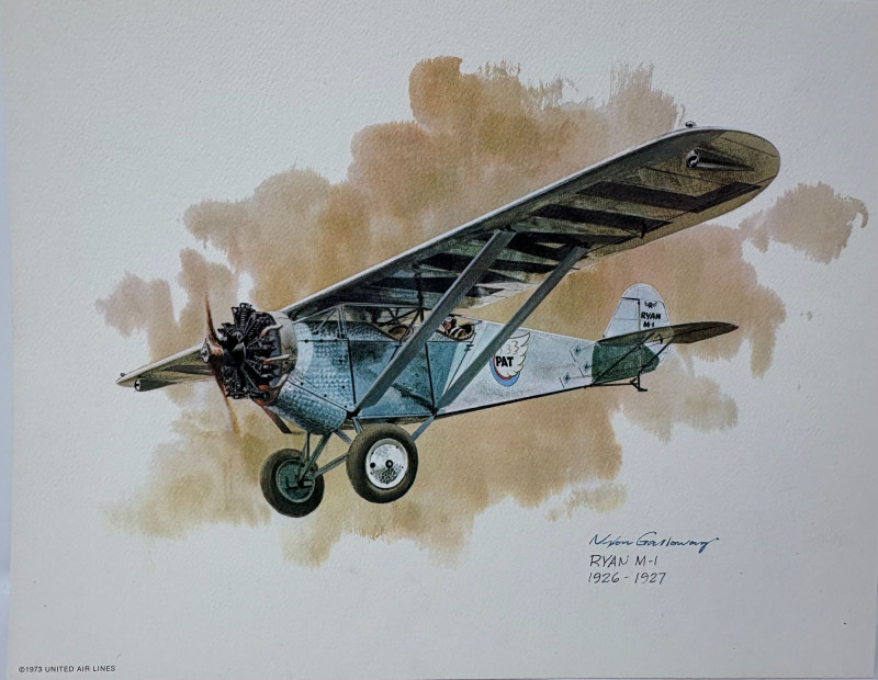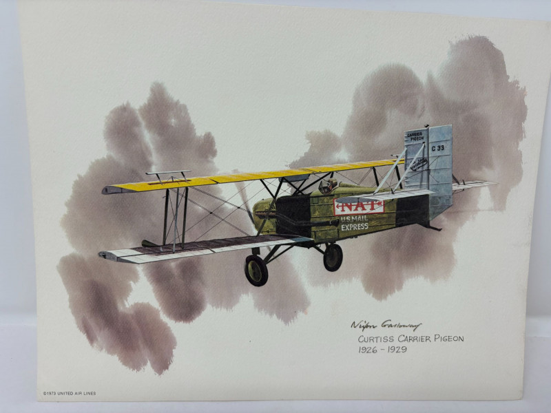 Four historical aviation art prints illustrated by Nixon Galloway and produced for United Air Lines in 1973. Each piece highlights an iconic early‑airmail or early‑passenger aircraft, rendered in Galloway’s distinctive period style with historical notations. Ideal for collectors of airline history, airmail memorabilia, or mid‑century aviation art. Ryan M‑1 (1926–1927) Curtiss Carrier Pigeon (1926–1929) Boeing Model 80A (1929–1930) Boeing 40B‑4 (1929–1932) Each print features aircraft identification, service years, and United Air Lines branding consistent with the 1973 production series. 8½" high × 11" wideIncluded Prints