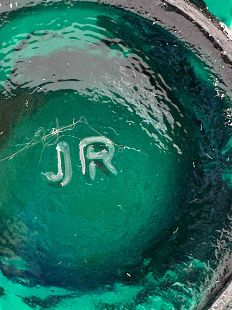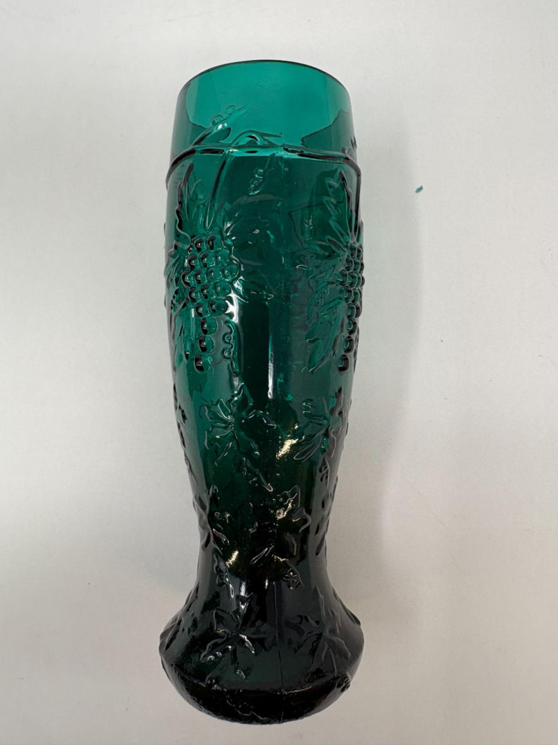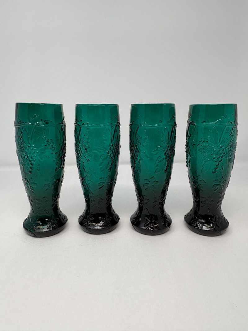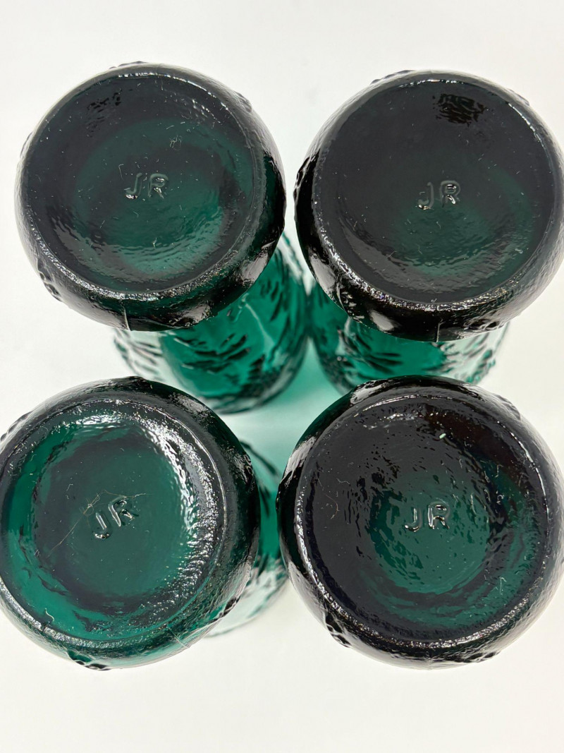 A quartet of emerald‑green pressed‑glass wine glasses, each featuring a textured bowl, short stem, and sturdy round foot. Their rich jewel‑tone color and mid‑century styling make them ideal for display, barware, or vintage glass collections. All four pieces are uniform in size and marked “JR” on the base. Height: 6" Width at Rim: 2" Depth: 2"Measurements