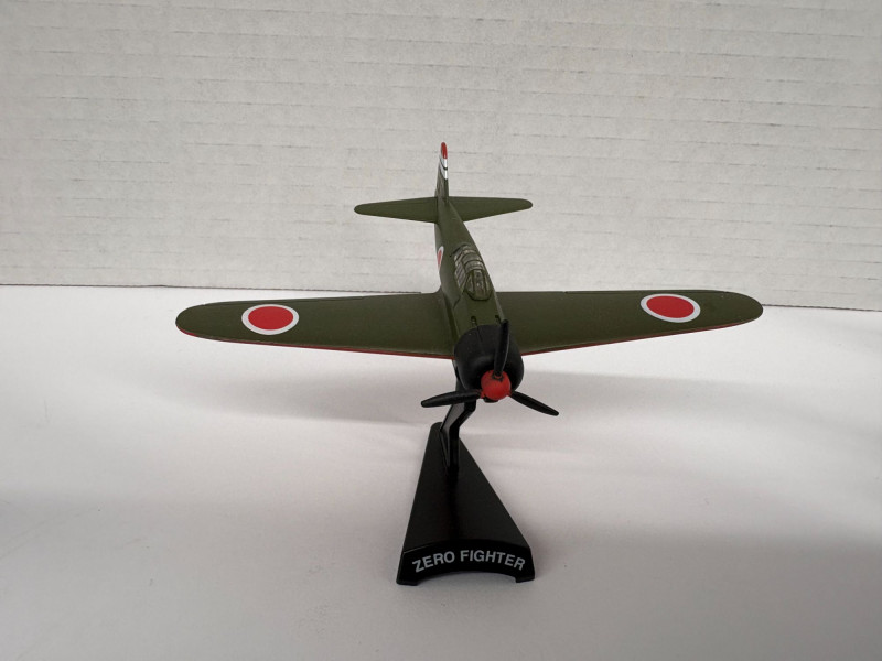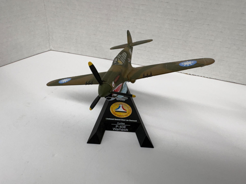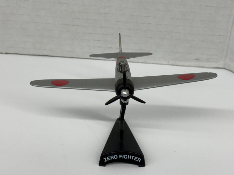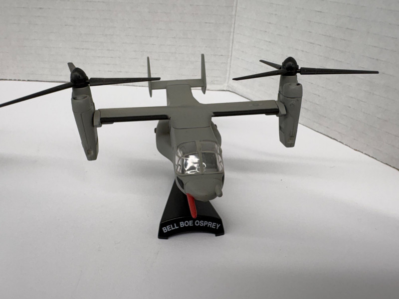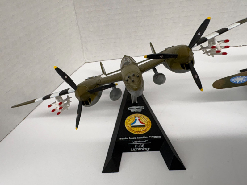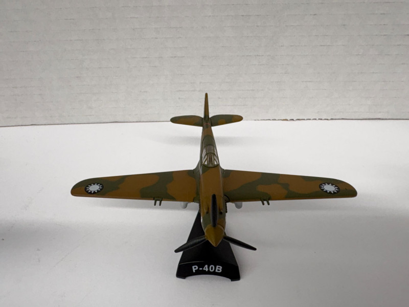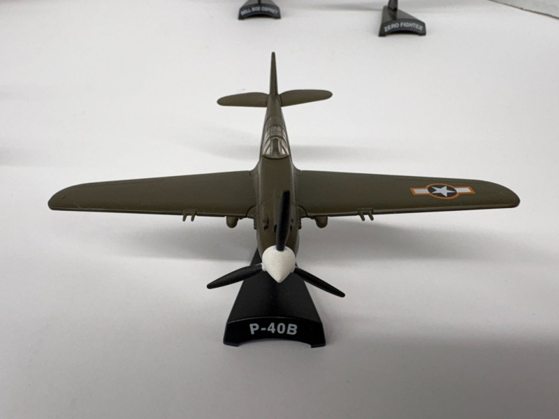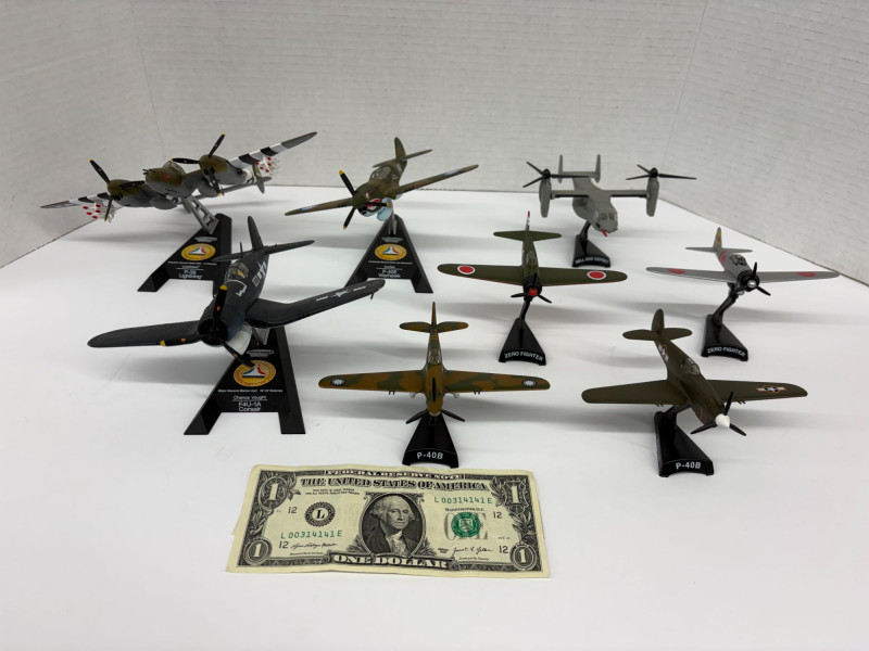Group of eight vintage-style airplane models, each mounted on a labeled display stand. Includes: F4U-1D Corsair (approx. 3½"), P-38 Lightning (approx. 3½"), B-25 Mitchell (approx. 4"), P-40B Warhawk (approx. 4", two models), Zero Fighter (approx. 4", two models), and Bell Boeing Osprey (approx. 5"). A compact, ready-to-display assortment spanning classic WWII fighters, a twin-engine bomber, and a modern tiltrotor aircraft—ideal for a desk, shelf, or aviation-themed décor. The dollar bill is not included!