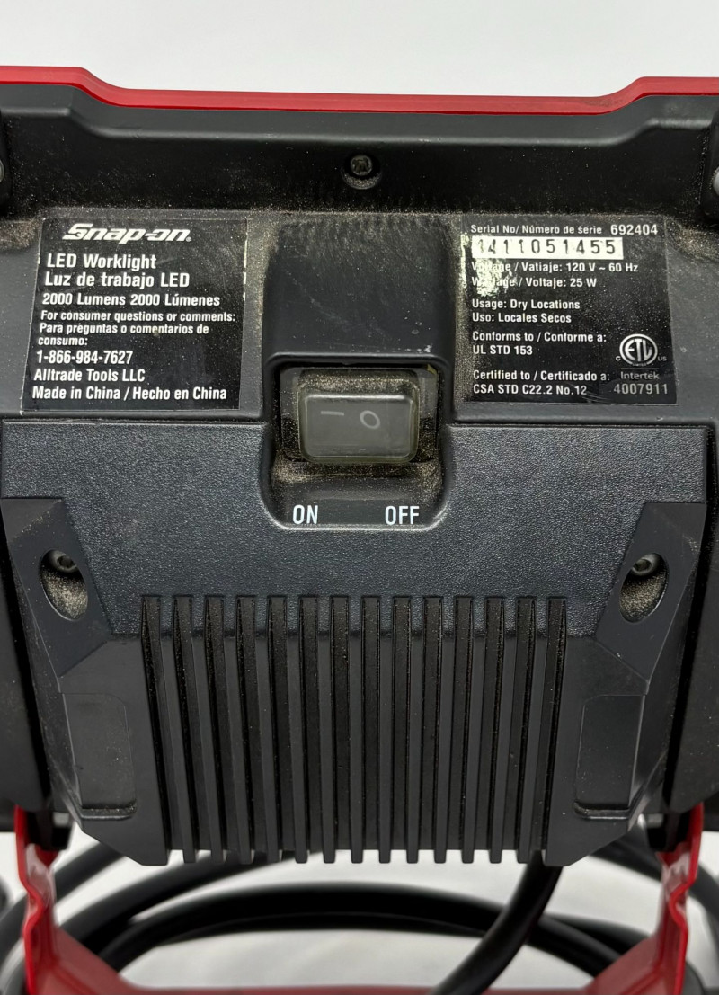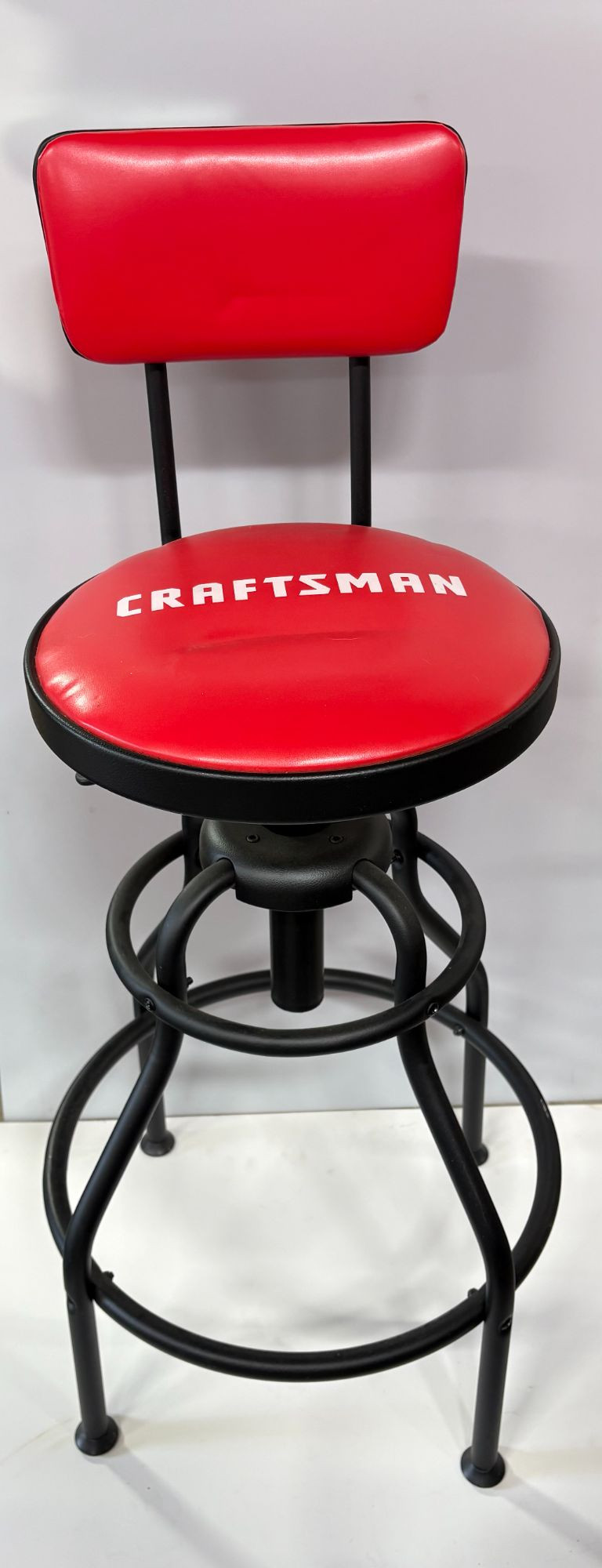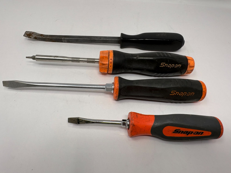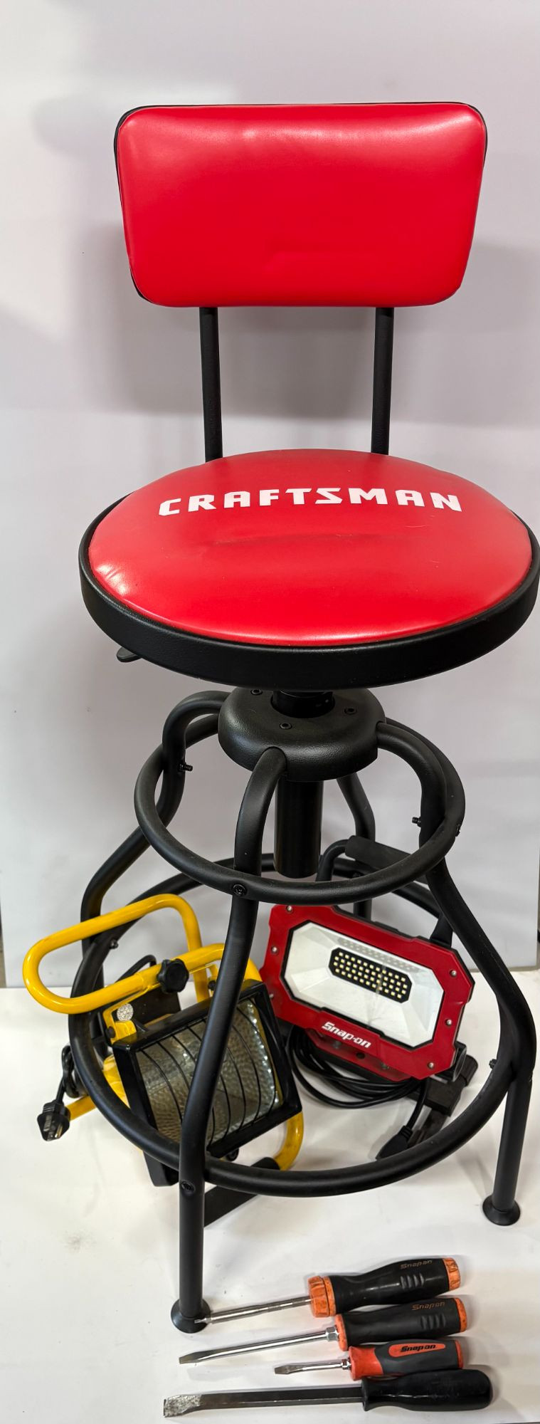 The Craftsman stool offers a sturdy round seat with supportive backrest and metal base, measuring approximately 17" H × 18" W. Completing the lot are a Snap‑On work light, a set of four Snap‑On screwdrivers, and a yellow portable work light, each photographed individually for clear condition reference. A versatile grouping ideal for workshop use, detailing bays, or tool‑bench upgrades. Craftsman height‑adjustable shop stool – approx. 17" H × 18" W Snap‑On work light Four Snap‑On screwdrivers Yellow portable work lightPieces Included