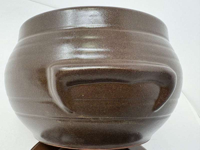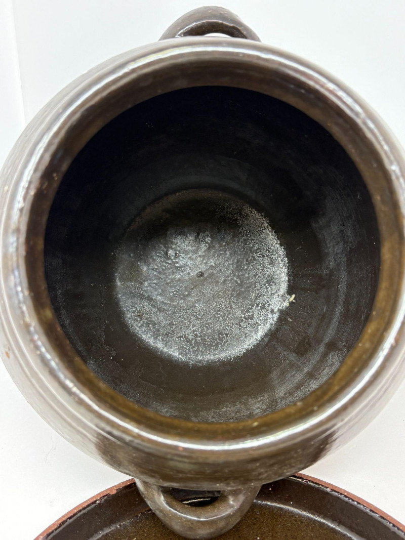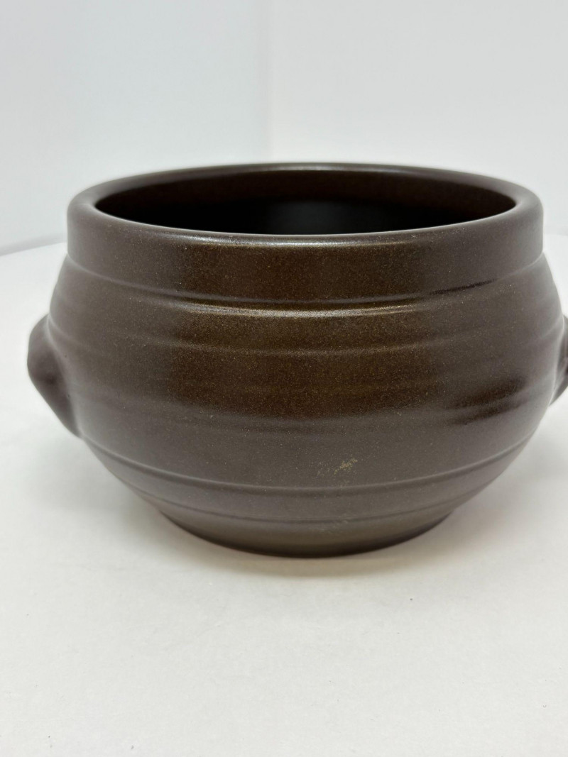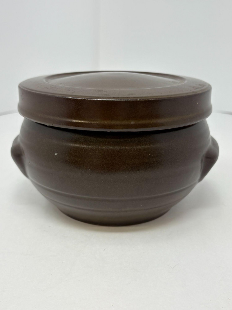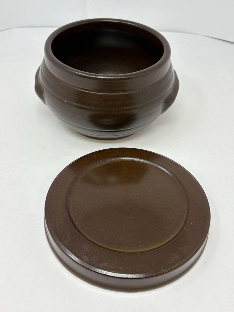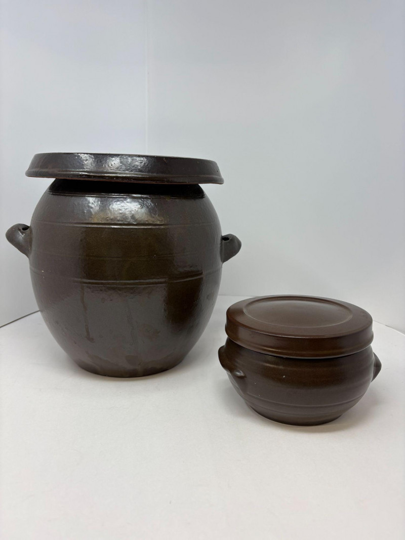 A duo of traditional Korean onggi fermentation pots, ideal for kimchi, pickling, or rustic kitchen décor. Each vessel features classic earthenware construction with rich brown glazing and hand‑formed character. Pot 1: approx. 9 in. tall, 8 in. diameter Pot 2: approx. 7 in. tall, 6 in. diameter A charming, functional pair that brings heritage craftsmanship and warm, organic texture to any space.