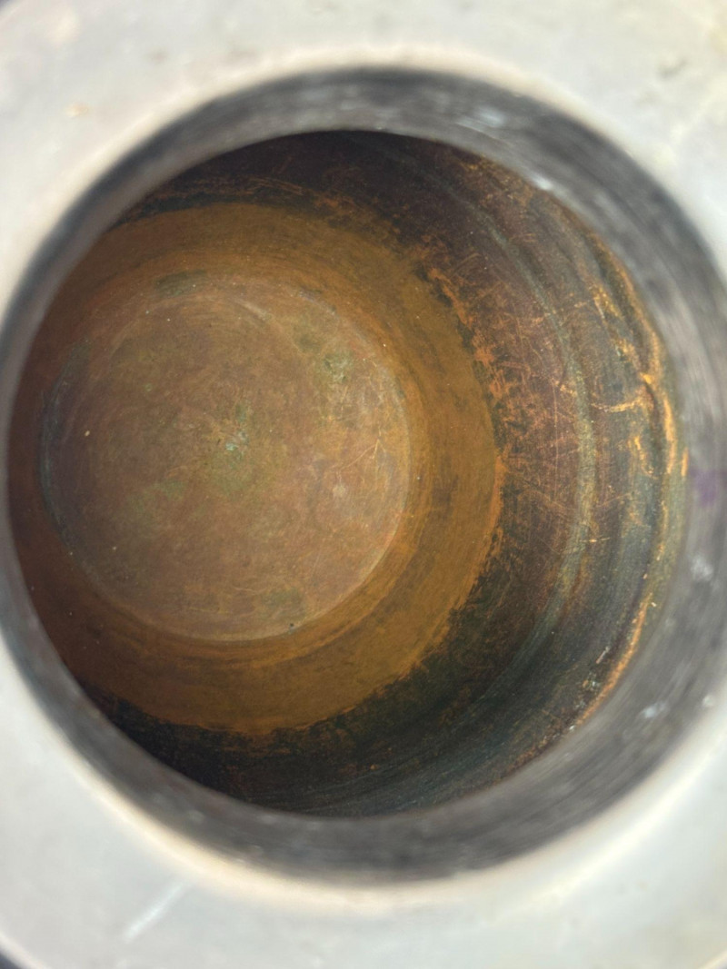 The dark metal urn/vase offers a sleek, reflective silhouette with a gently flared rim and a naturally patinated interior, standing 11"H x 6" diameter.