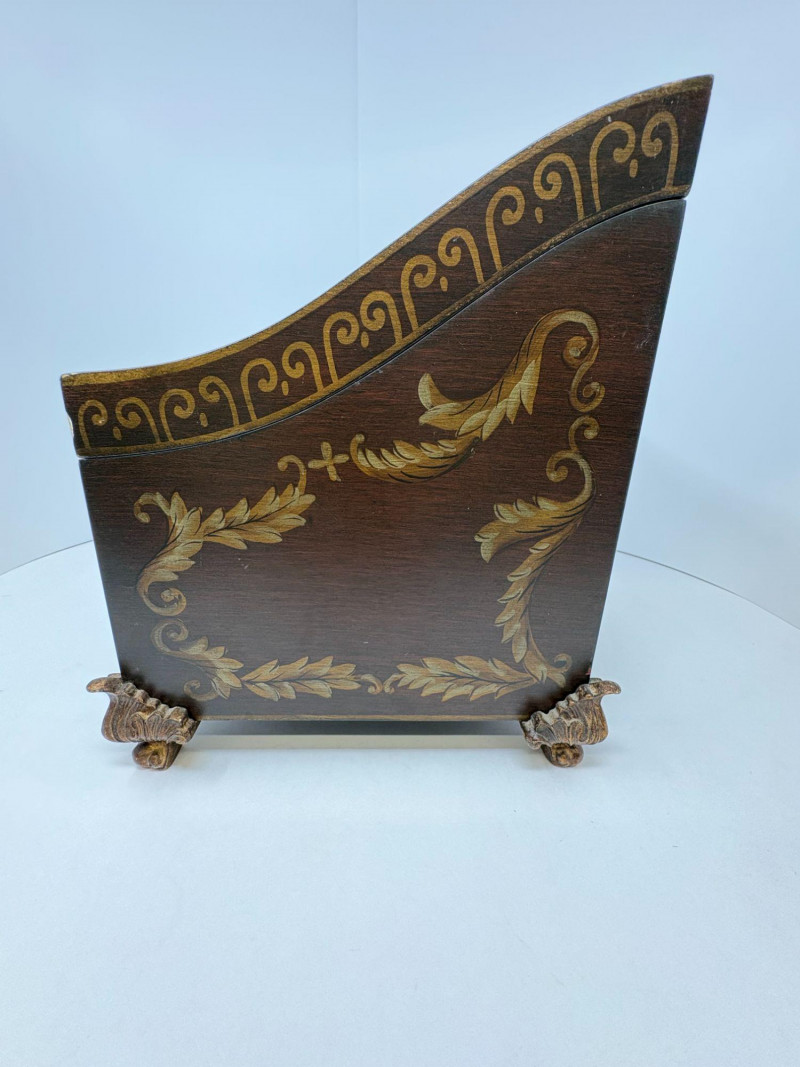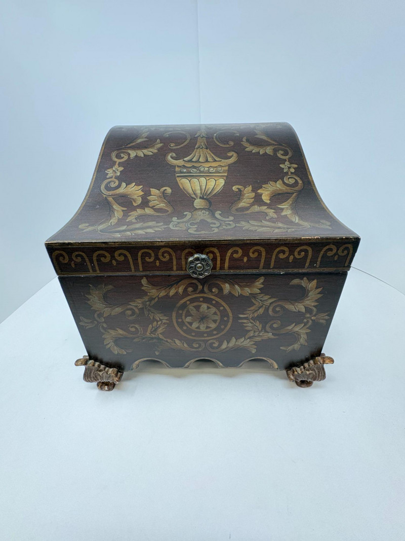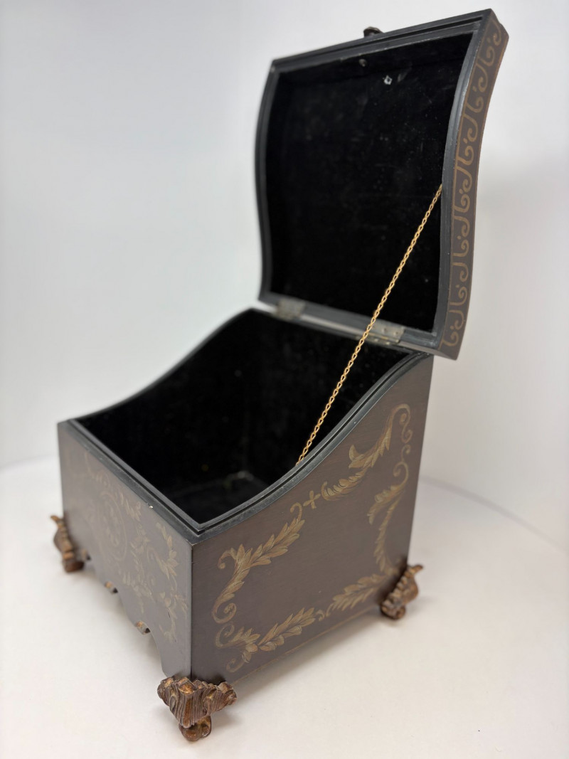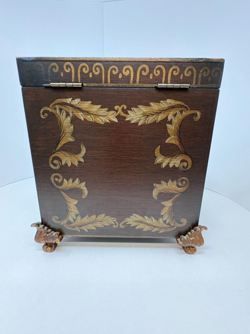 Complementing it is a richly embellished storage box featuring raised gold scrollwork, decorative feet, and a hinged lid with support arm. The box measures 10.5"H x 8"W x 10"D, with a clean black interior ideal for keepsakes or display styling.