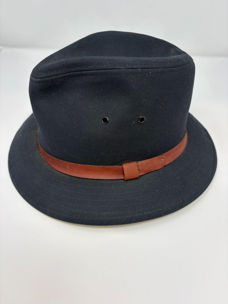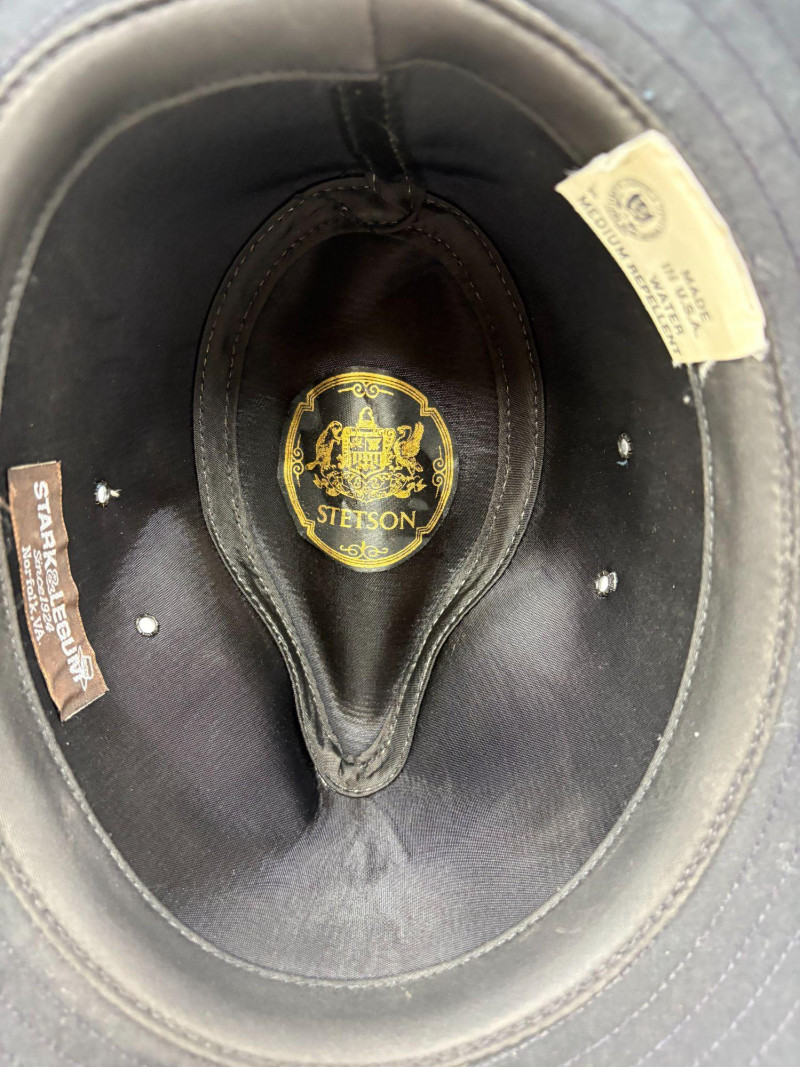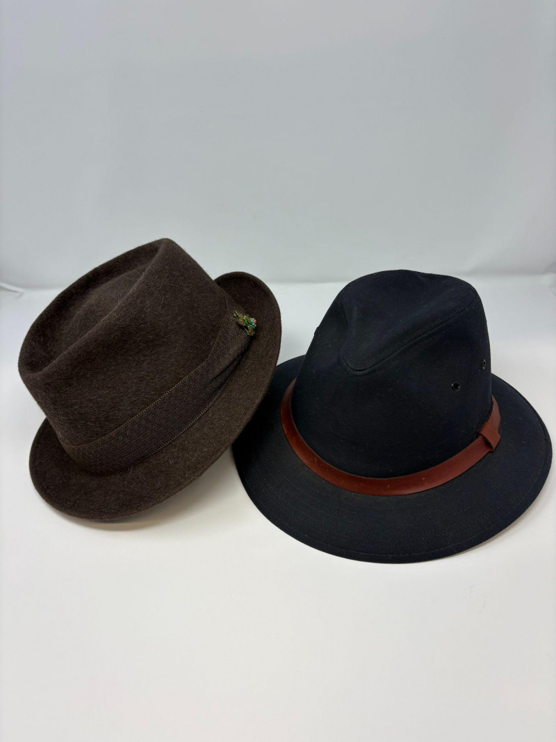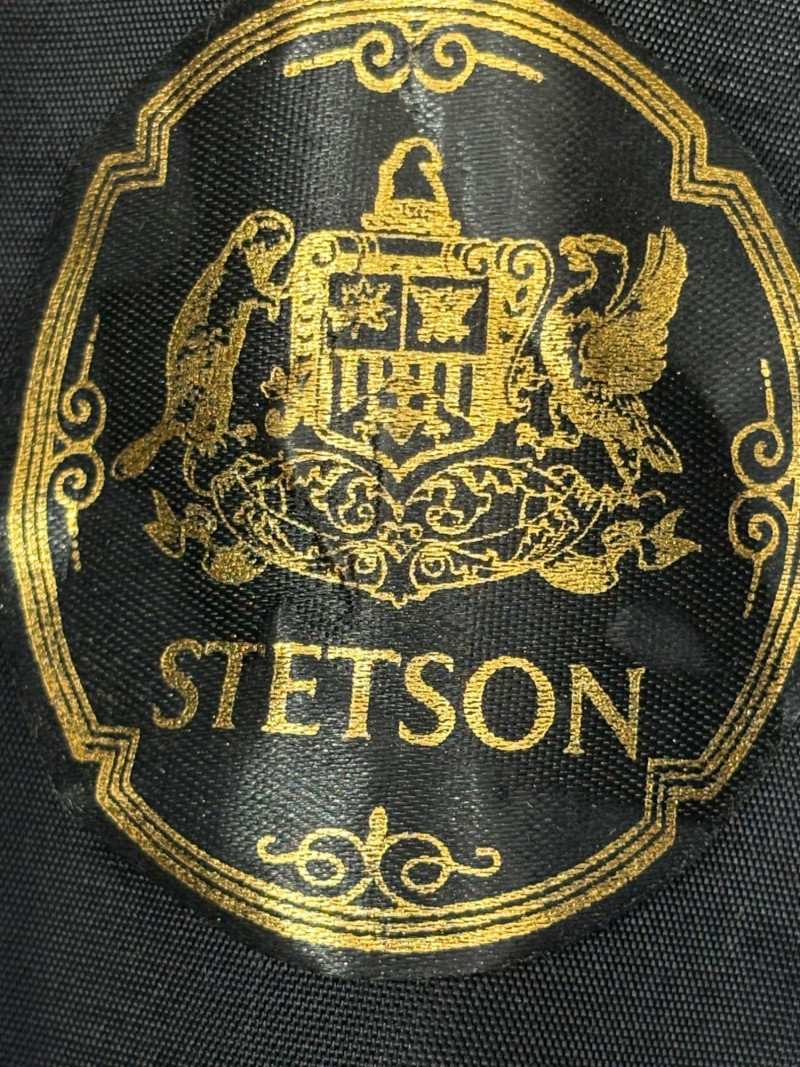 A handsome duo of authentic Stetson hats, each showcasing the brand’s classic American craftsmanship. Brown Felt Royal Stetson Fedora —Size large. The hat is in excellent condition. No signs of wear. The inside sweat band is in perfect condition, as is the satin lining. The felt is a 'fur felt' with visible hairs stamped into the finish. The ribbon hat band is also in excellent condition. Warm brown felt with a traditional brim, tonal hatband, and decorative accent. Interior features the signature satin lining and gold Royal Stetson crest, consistent with mid‑century production. A refined, collectible piece with rich color and character. Black Stetson Fedora —Size medium. Deep black paired with a contrasting brown band for a sharp, versatile profile. Interior is marked with the “STETSON — Made in U.S.A.” label, confirming authentic domestic manufacture. Naturally water‑resistant due to the wax/oil finish. Waxed cotton/oil finished cotton. Both hats present well and offer the quality, structure, and heritage styling that define Stetson’s long‑standing reputation.