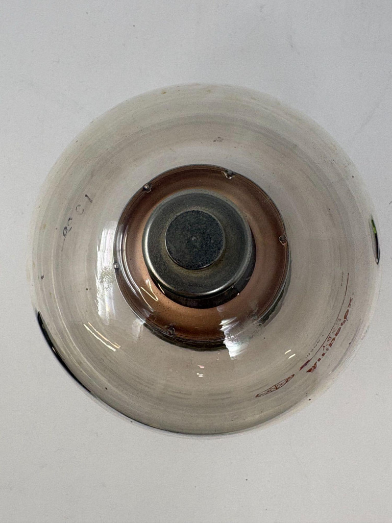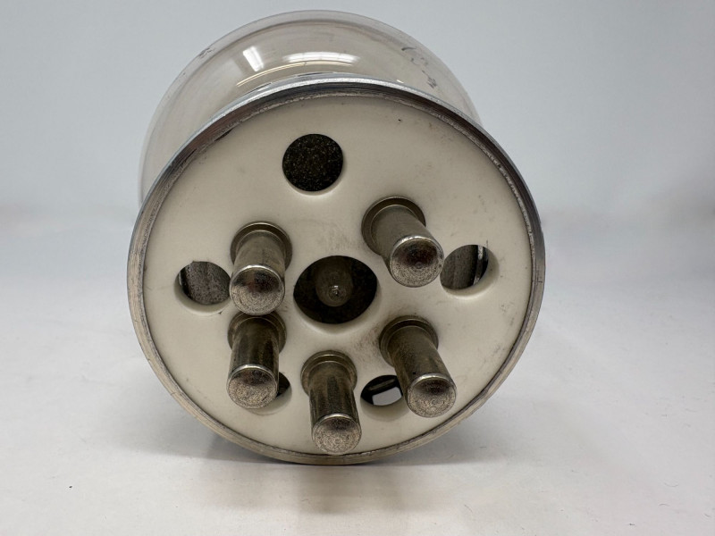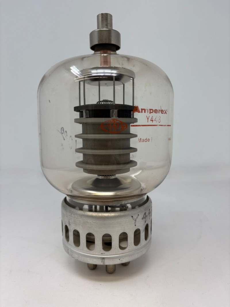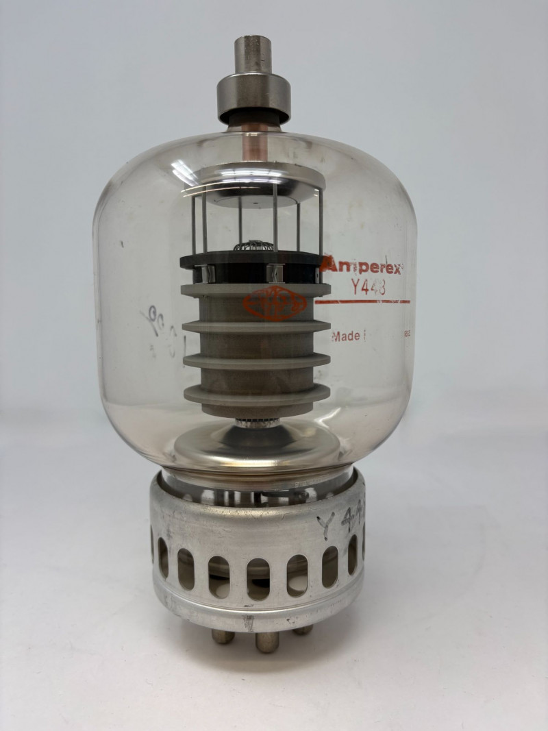A vintage Amperex 3‑500Z electron tube, prized in high‑frequency RF amplification and admired by collectors for its sculptural industrial form. This impressive glass triode showcases its internal grid and plate architecture with bold clarity, paired with its original Amperex markings and serial number. A substantial display piece for radio enthusiasts, vacuum‑tube collectors, or anyone drawn to mid‑century engineering aesthetics. Approx. size: 9 in H × 5 in W