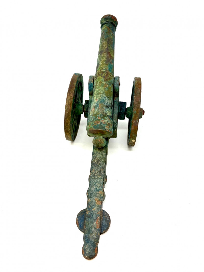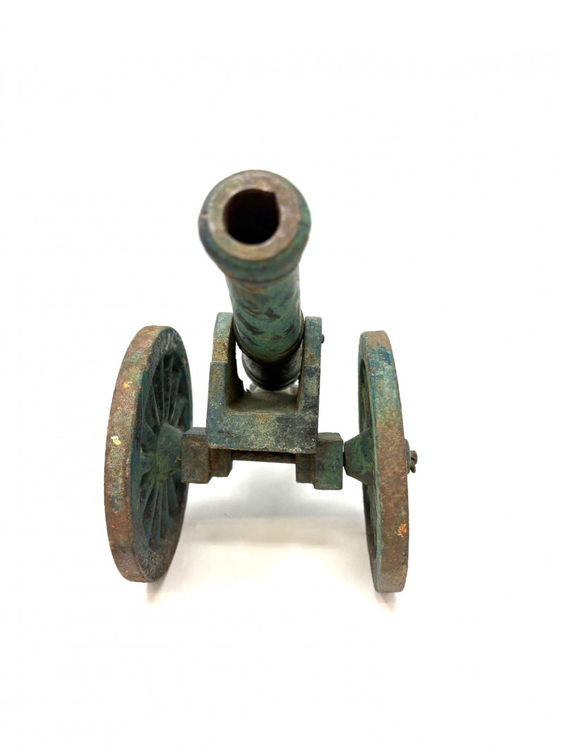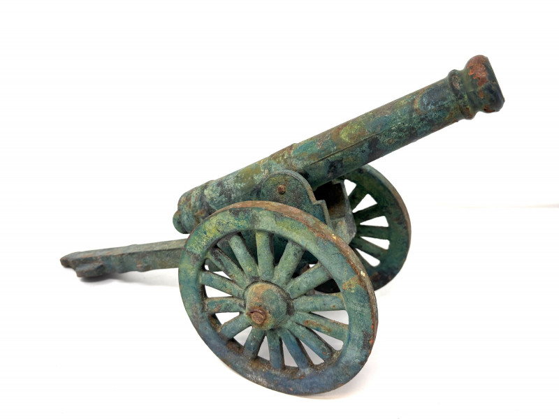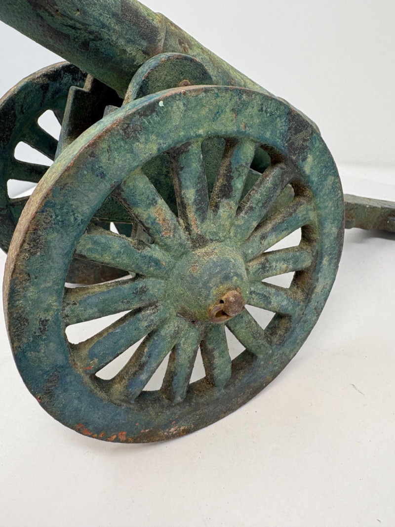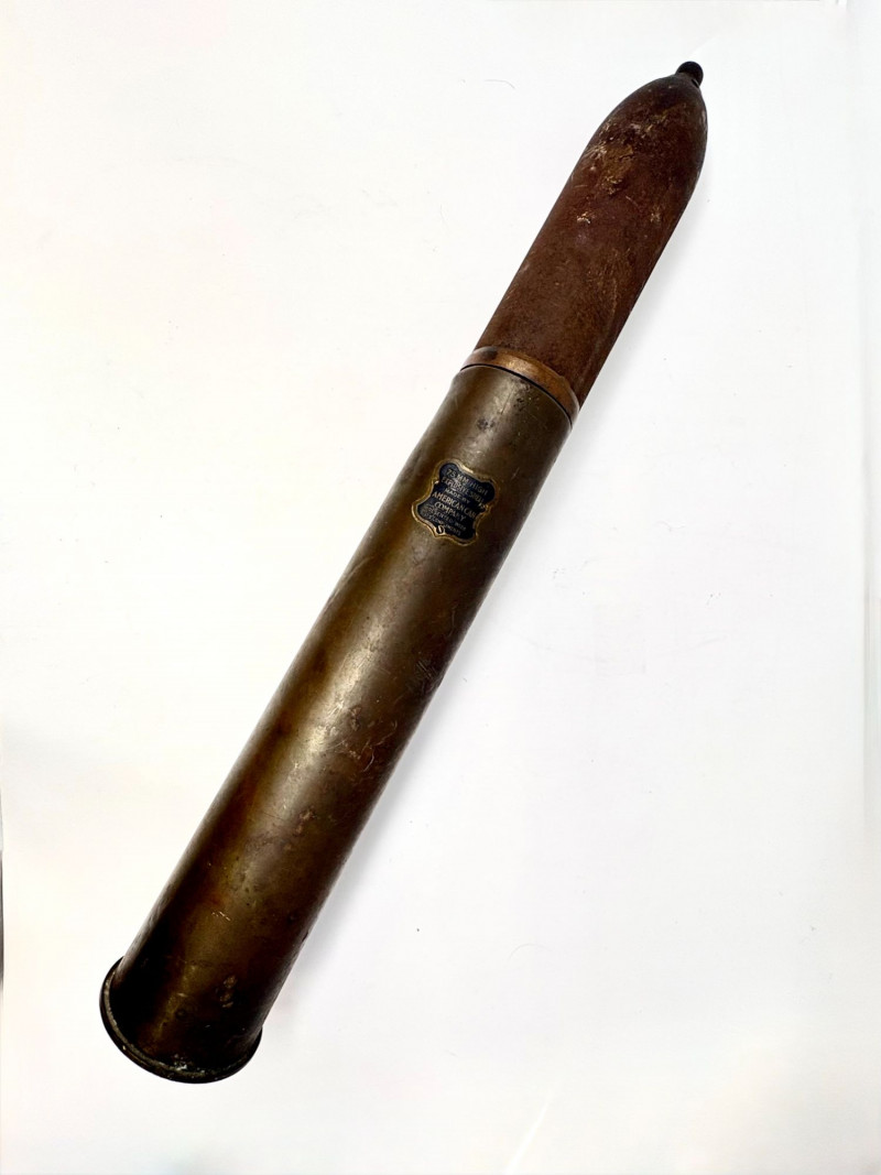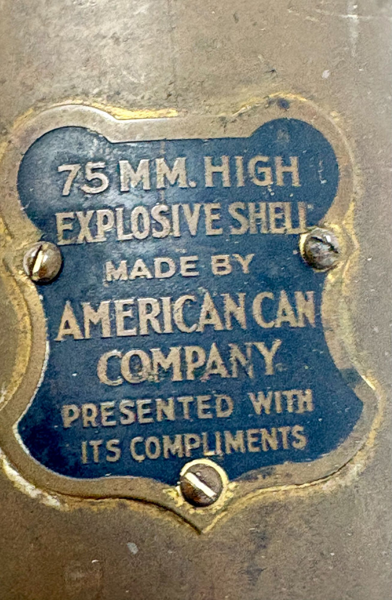 The shell, produced by the American Can Company, retains its brass presentation plaque reading “75 MM High Explosive Shell… Presented With Its Compliments.” Standing an impressive 25" tall with a 3 3/4" diameter, it offers both military significance and strong decorative presence. Paired with it is a compact cast‑iron cannon, measuring approximately 5" long x 4" tall, with classic spoked wheels and aged patina—an ideal companion piece for shelf or desk display. Together, the set presents a blend of wartime history and early 20th‑century craftsmanship.A two‑piece historical display featuring an original WWI 75mm High Explosive Presentation Shell and a vintage cast‑iron cannon model.