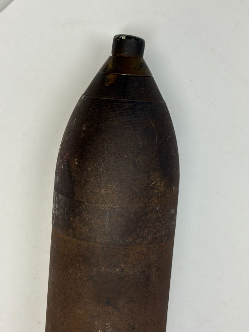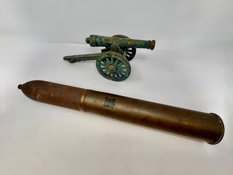Lot # 183 - WWI 75mm Presentation Shell & Cast‑Iron Cannon Display – 2‑Piece Lot
