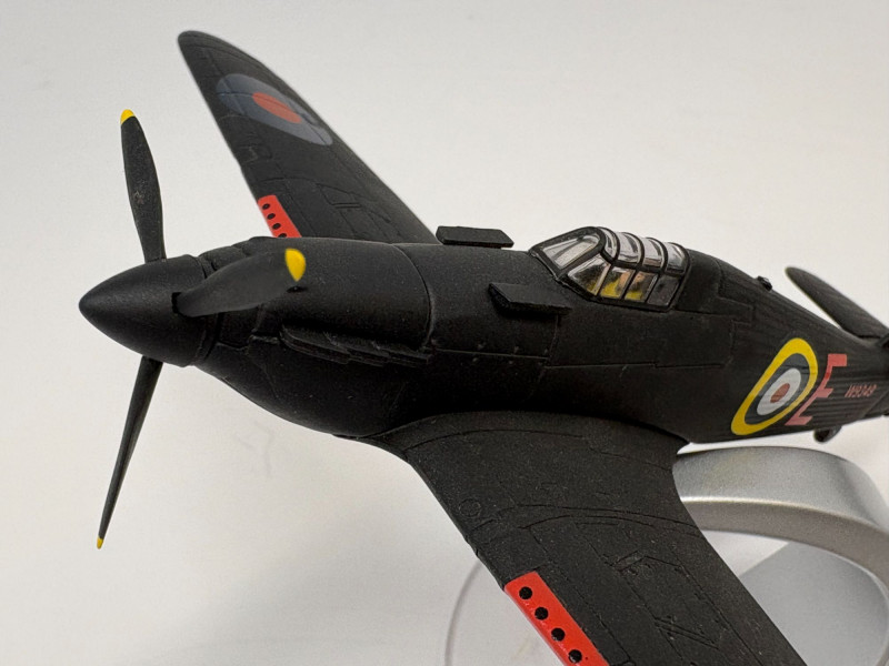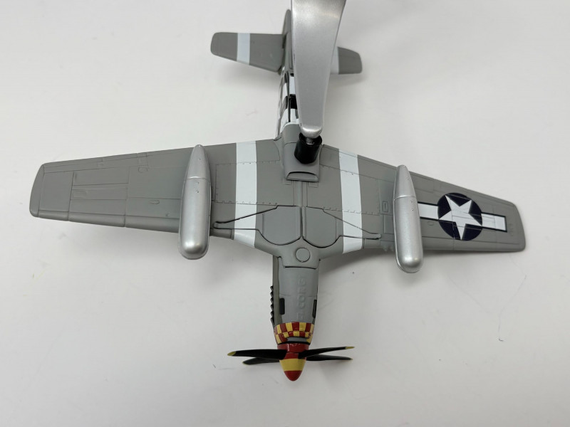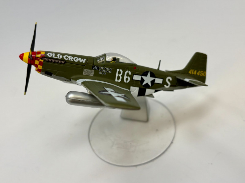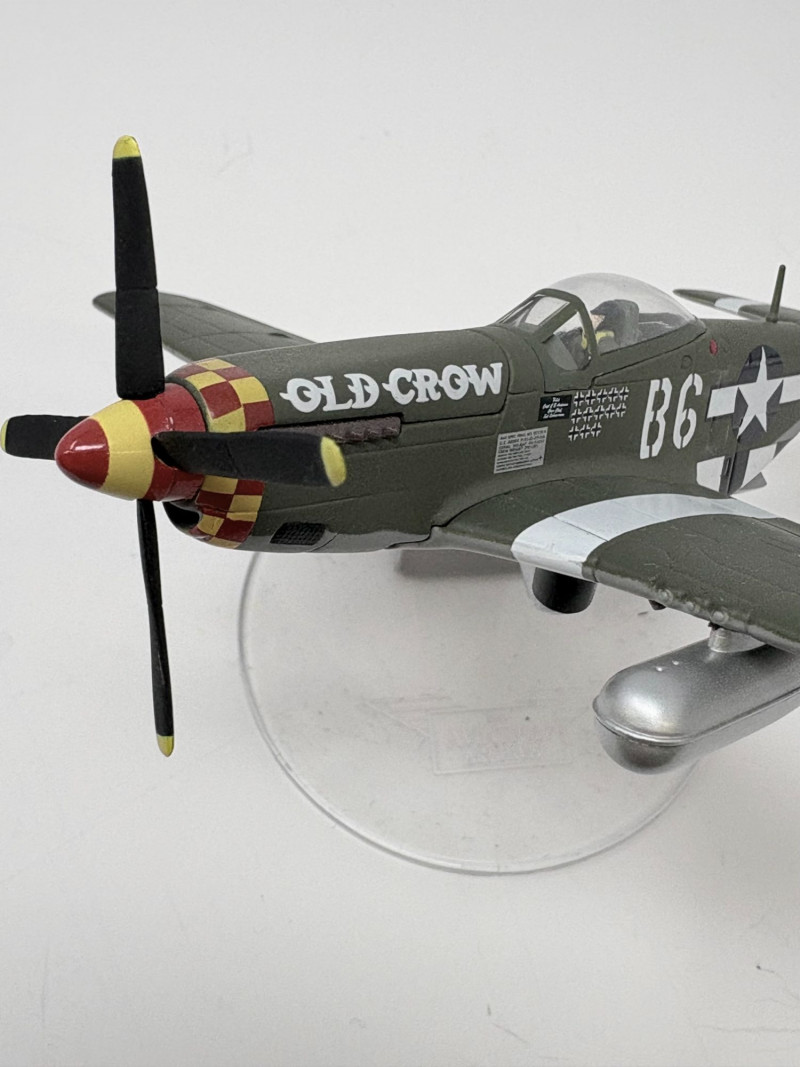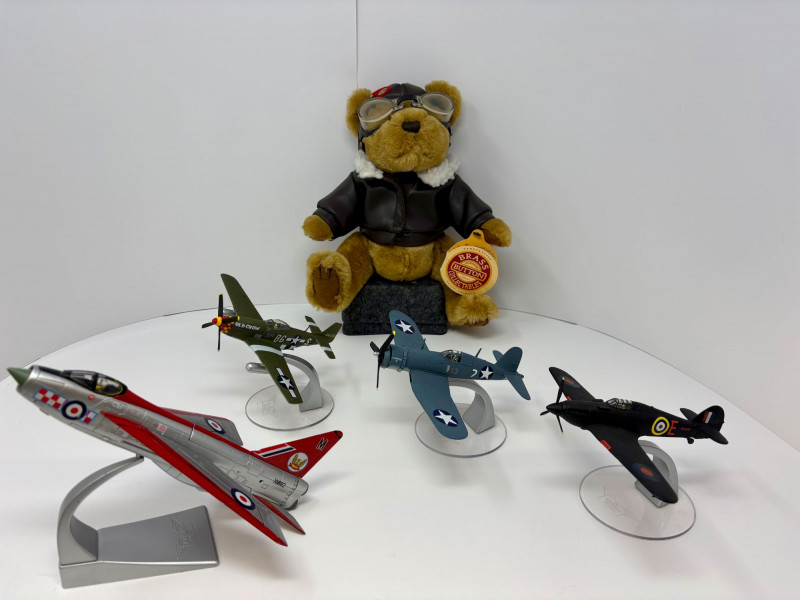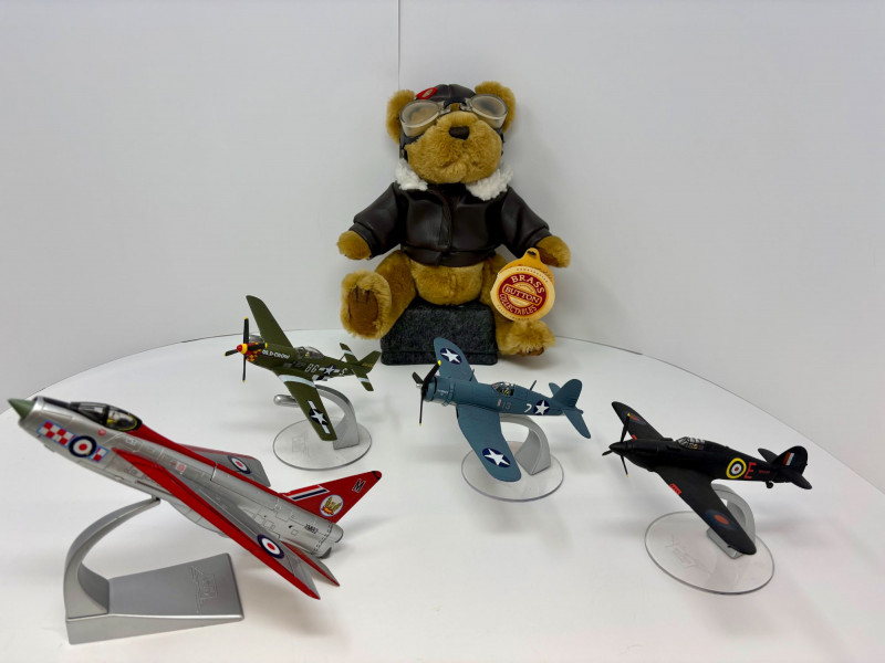 A playful mixed lot featuring a soft 10" teddy bear paired with four classic WWII‑style aircraft models, each approximately 4½" long. Includes a P‑51D Mustang “Old Crow,” Spitfire, P‑40 Warhawk, and P‑47 Thunderbolt. A compact, ready‑to‑display grouping that blends warmth and aviation history
