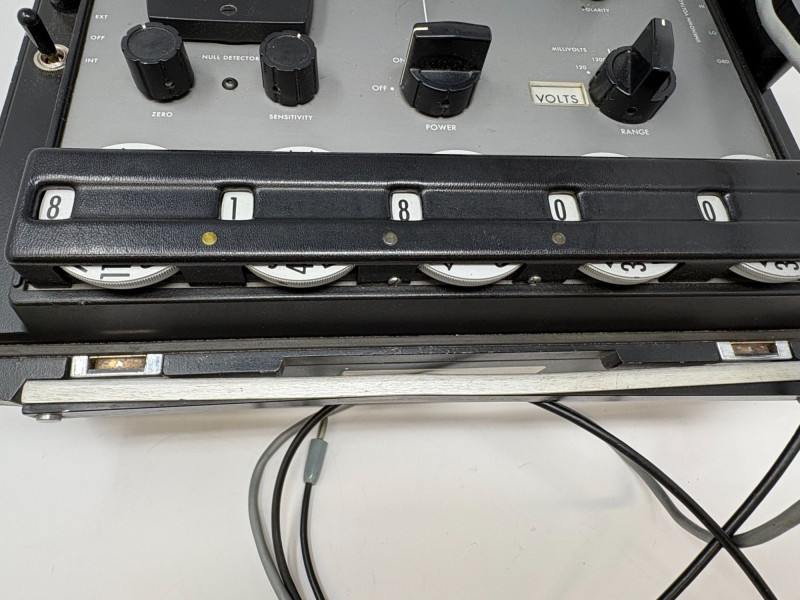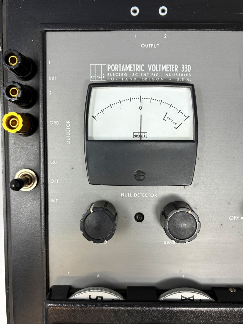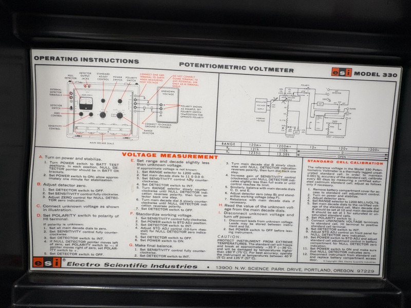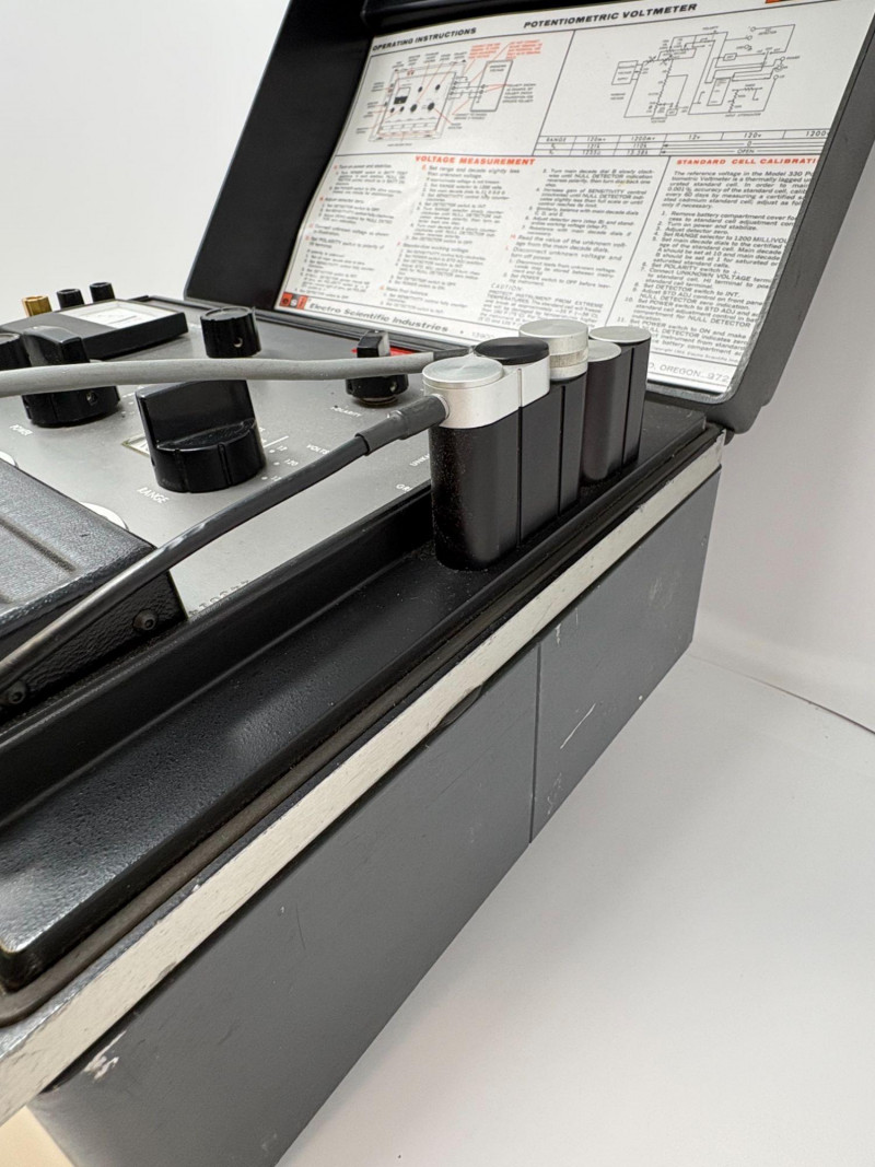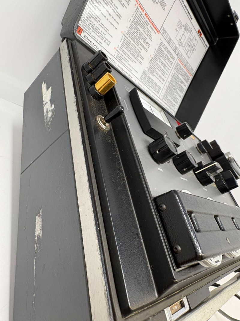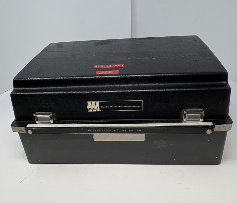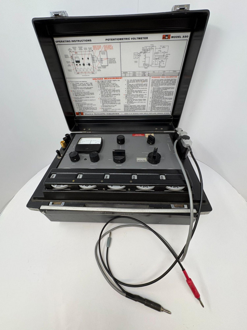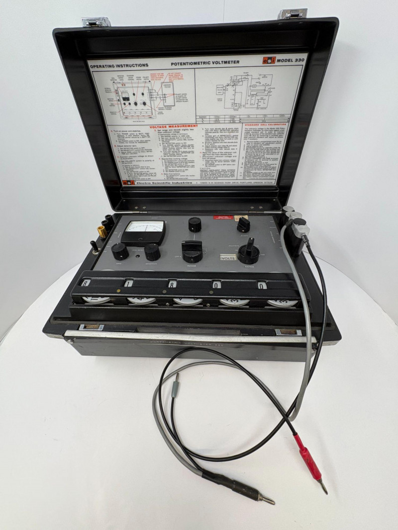 A vintage laboratory‑grade Photometric Voltmeter by Electro Scientific Industries, Model 330, housed in its original hard case with integrated lid instructions. The unit features its full control panel with gauge, selector knobs, and original red/black test leads, presenting as a well‑preserved example of mid‑century precision measurement equipment. Ideal for collectors of scientific instruments or period electronics. Untested Approx. size: 14"H × 11"W × 8"D