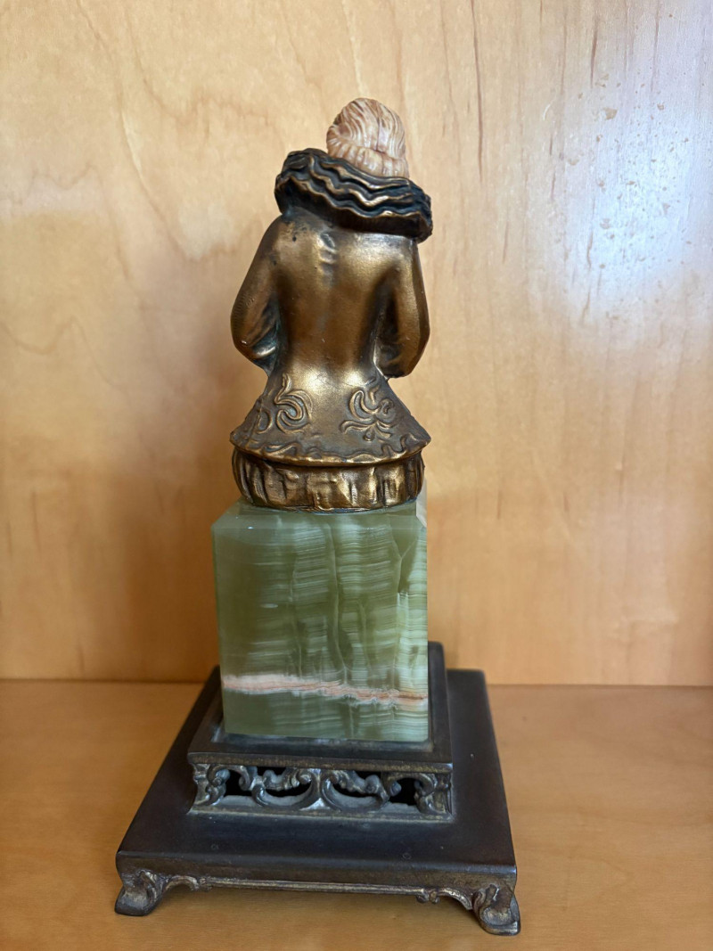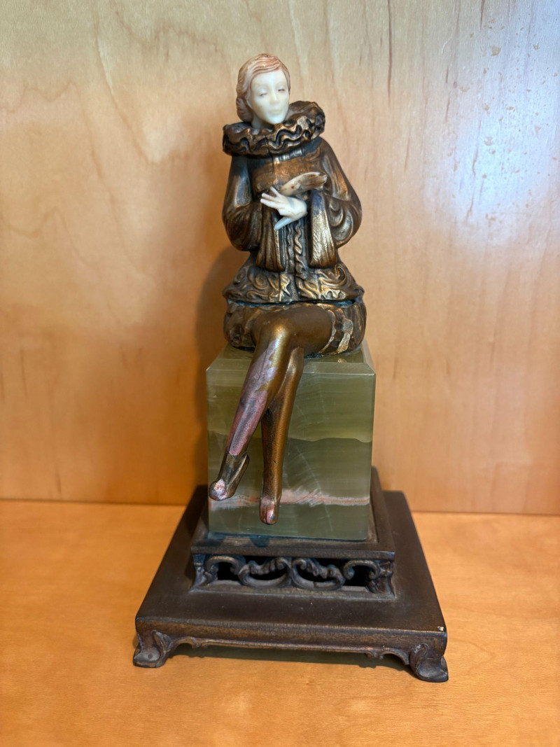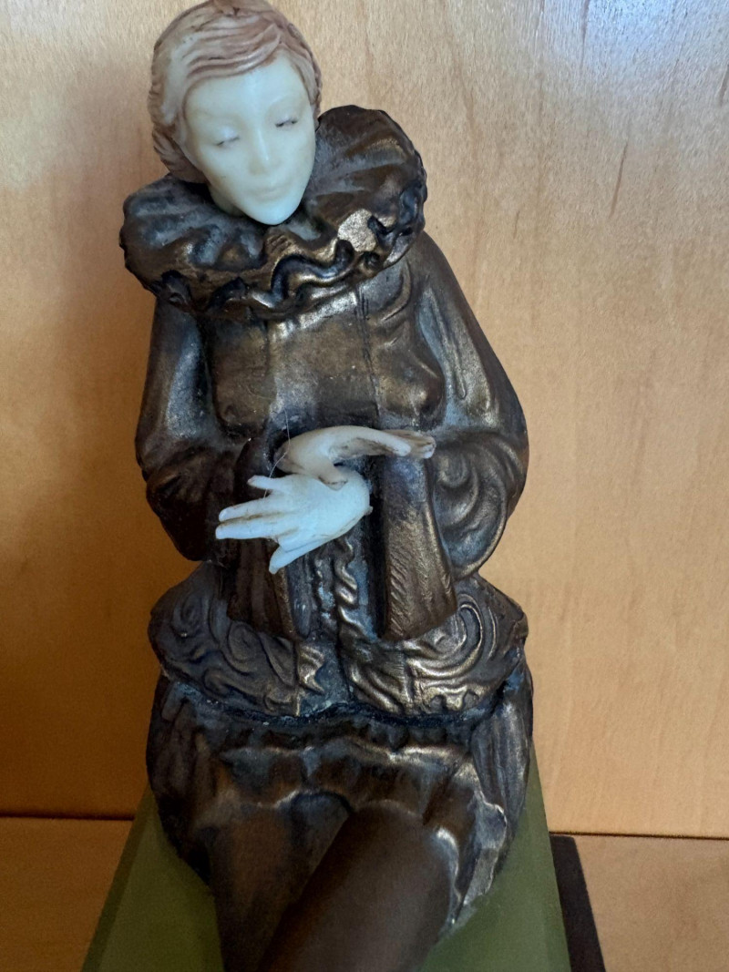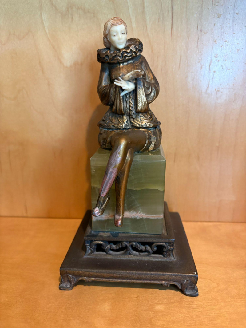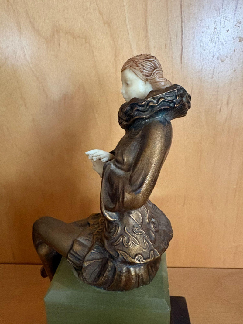 A finely modeled early 20th‑century Continental chryselephantine figurine depicting a seated theatrical performer in richly detailed, ruffled costume. The figure’s expressive pose, delicately carved ivory‑toned face and hands, and bronze‑finished attire evoke the style of the Parisian sculptors working in the manner of Paul Philippe and his contemporaries. Mounted on a green onyx plinth over a stepped black base, the piece presents beautifully from all angles, with crisp folds, textured surfaces, and a serene, contemplative expression. A striking decorative accent with the charm and craftsmanship characteristic of the Art Deco era. Subject: Pierrette, the melancholy female counterpart to Pierrot from Commedia dell'arte. *Please note sometime in the 20th century she lost her right index finger. Approx. 8" H × 4" W × 4" D.