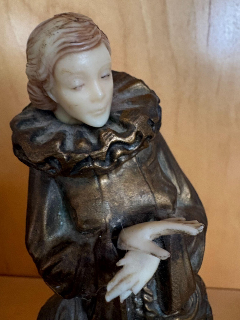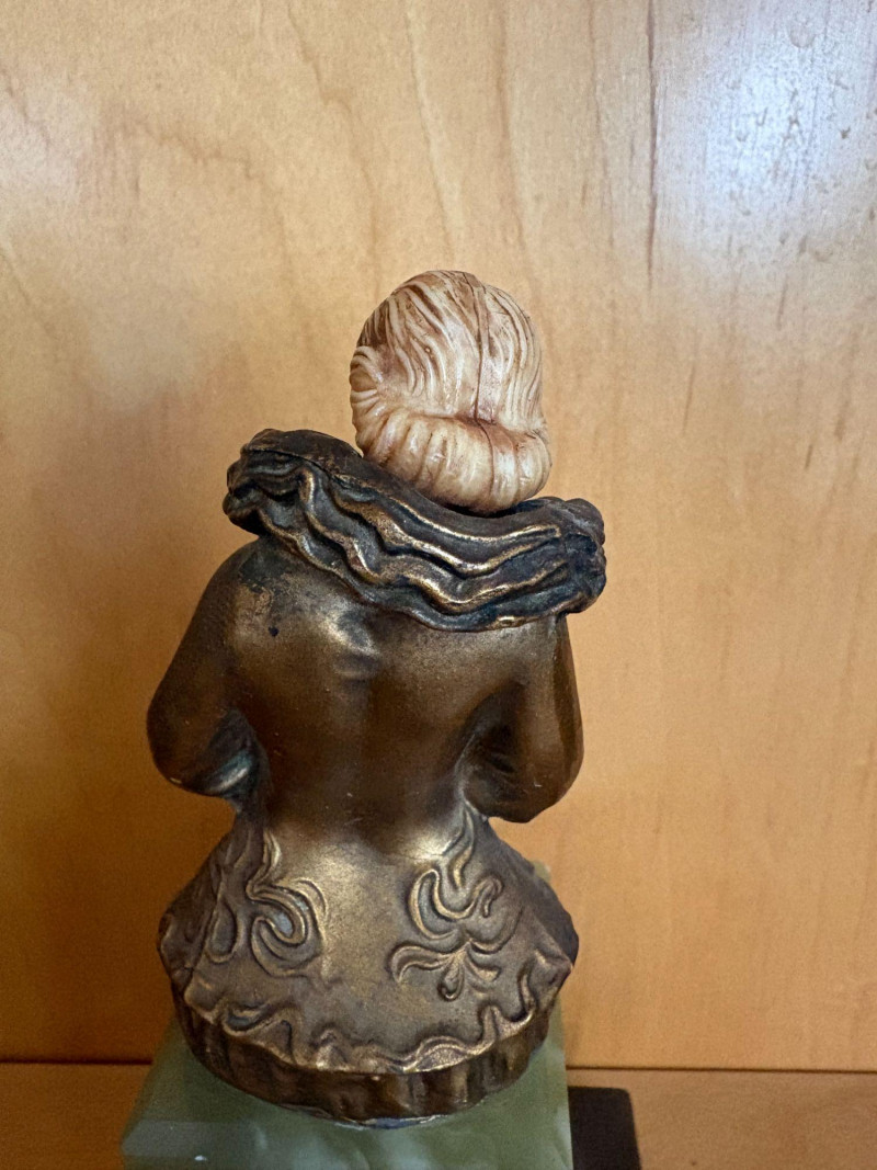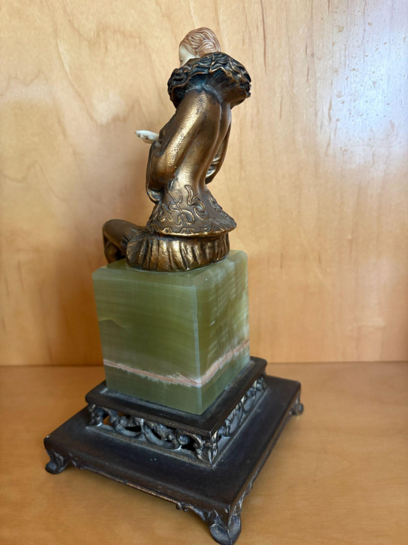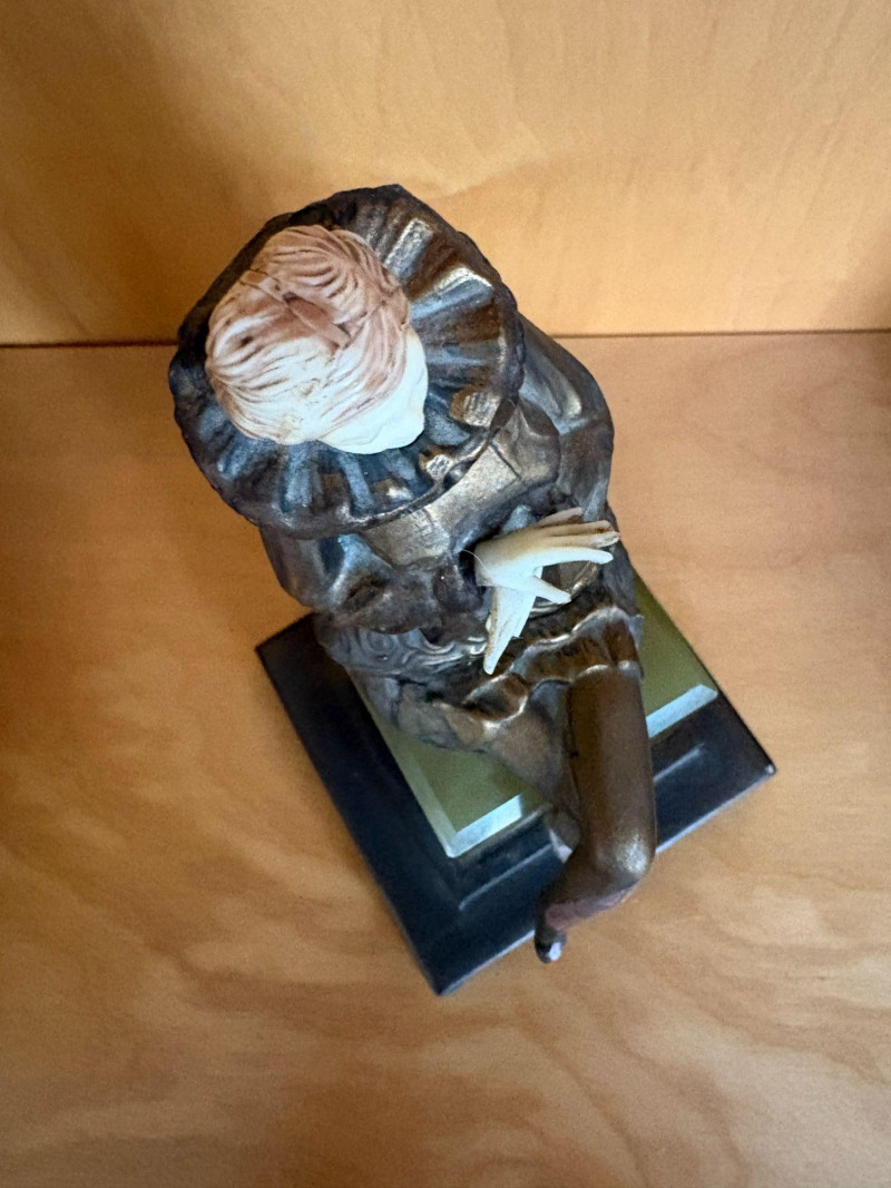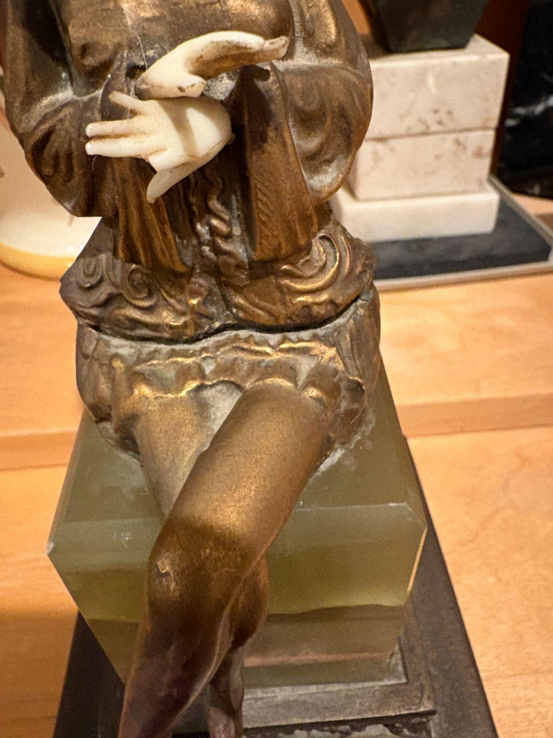 A finely modeled early 20th‑century Continental chryselephantine figurine depicting a seated theatrical performer in richly detailed, ruffled costume. The figure’s expressive pose, delicately carved ivory‑toned face and hands, and bronze‑finished attire evoke the style of the Parisian sculptors working in the manner of Paul Philippe and his contemporaries. Mounted on a green onyx plinth over a stepped black base, the piece presents beautifully from all angles, with crisp folds, textured surfaces, and a serene, contemplative expression. A striking decorative accent with the charm and craftsmanship characteristic of the Art Deco era. Subject: Pierrette, the melancholy female counterpart to Pierrot from Commedia dell'arte. *Please note sometime in the 20th century she lost her right index finger. Approx. 8" H × 4" W × 4" D.
