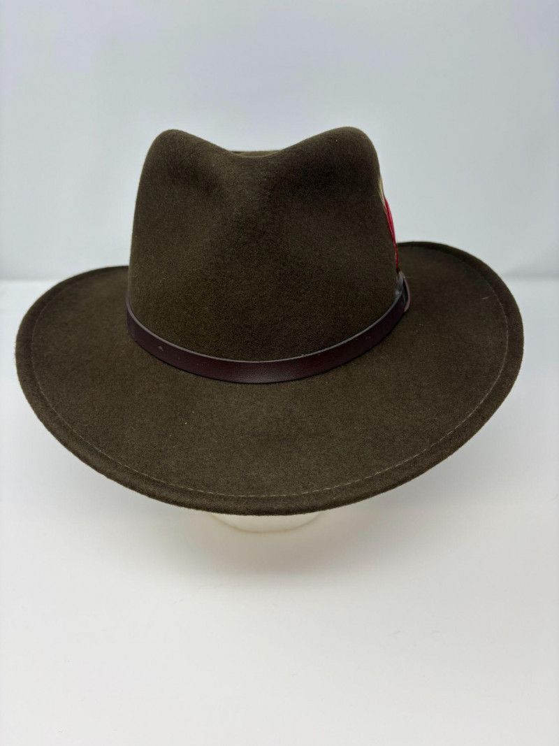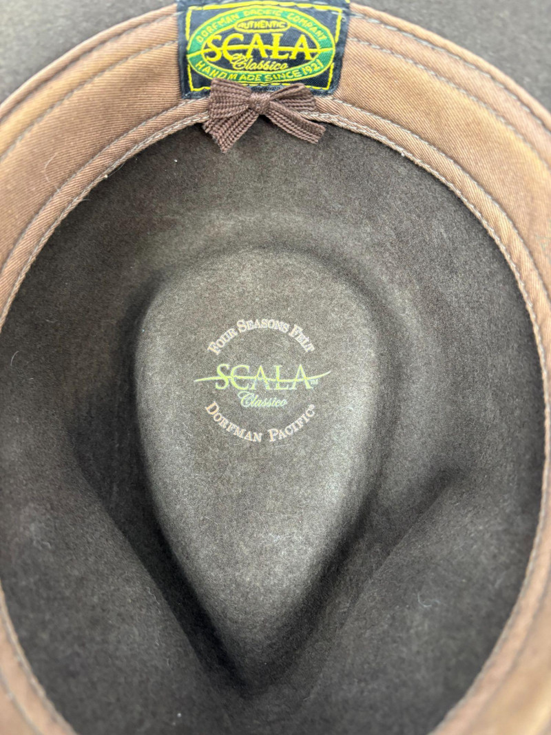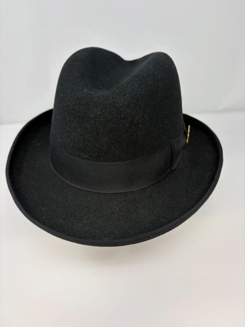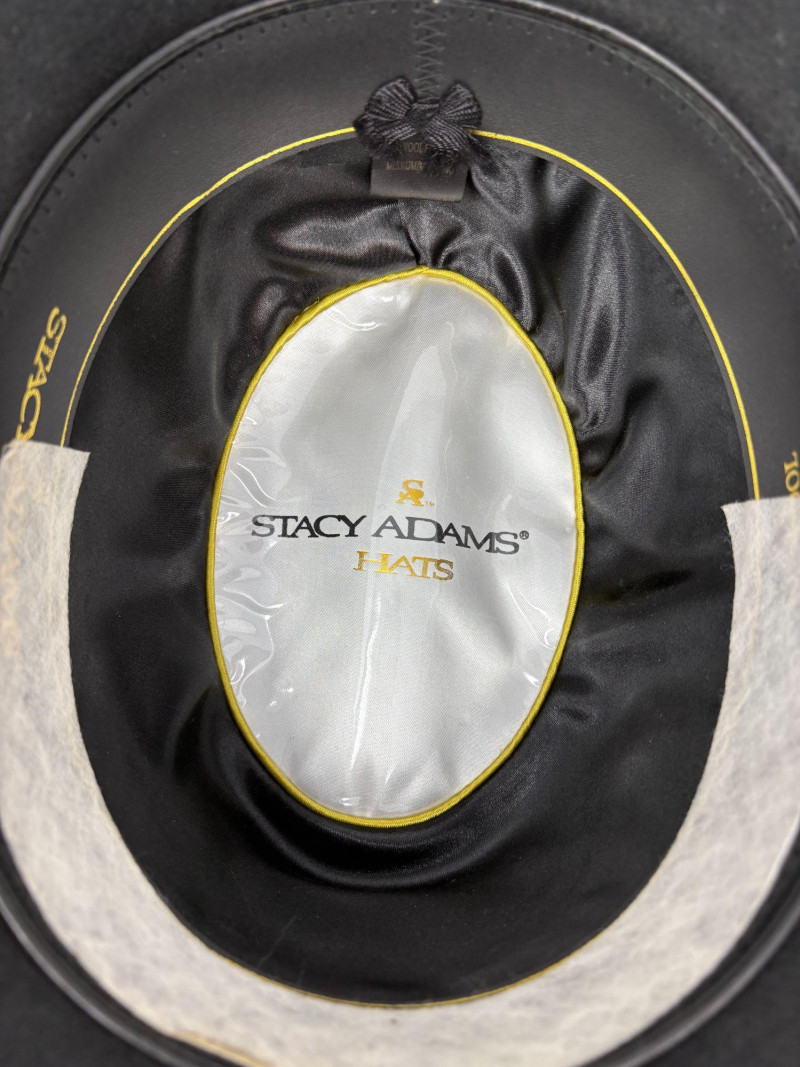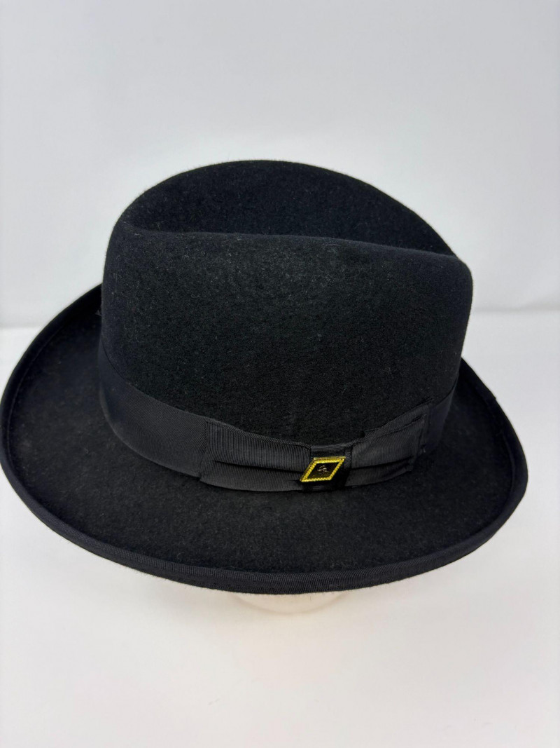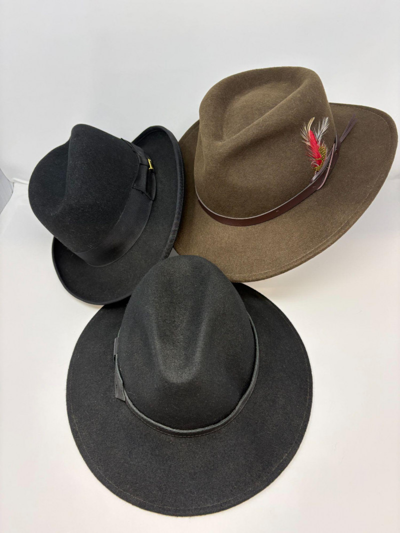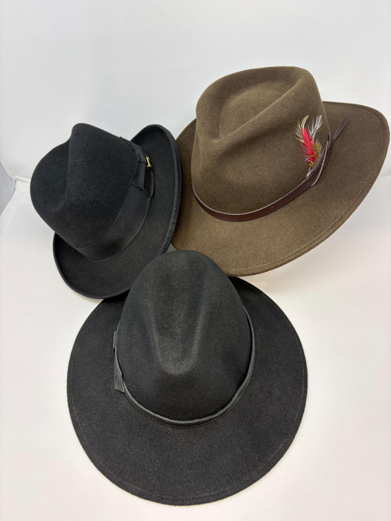 A collection of men’s wool fedoras ranging from mid‑century styling to later 20th‑century production. Standout pieces include the Italian‑made Scala Classico (Medium) and Galliano Sorbatti, (Medium) both noted for their quality felt, crisp crown lines, and well‑preserved interiors. The Stacy Adams (Large) example adds classic American flair, with structured brims and traditional hatband detailing. Overall condition is very good to gently worn, with clean linings and brims that hold their shape. A versatile mix of 1brown and 2 black, makes this a strong lot for collectors, stylists, seeking character, craftsmanship, and variety.