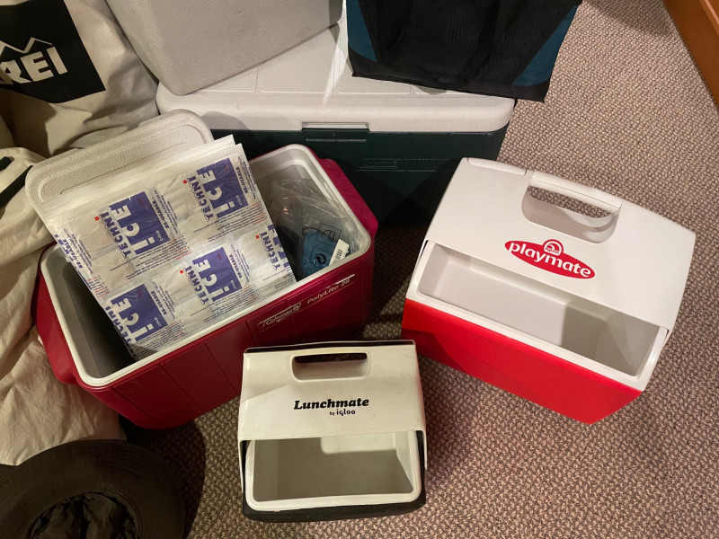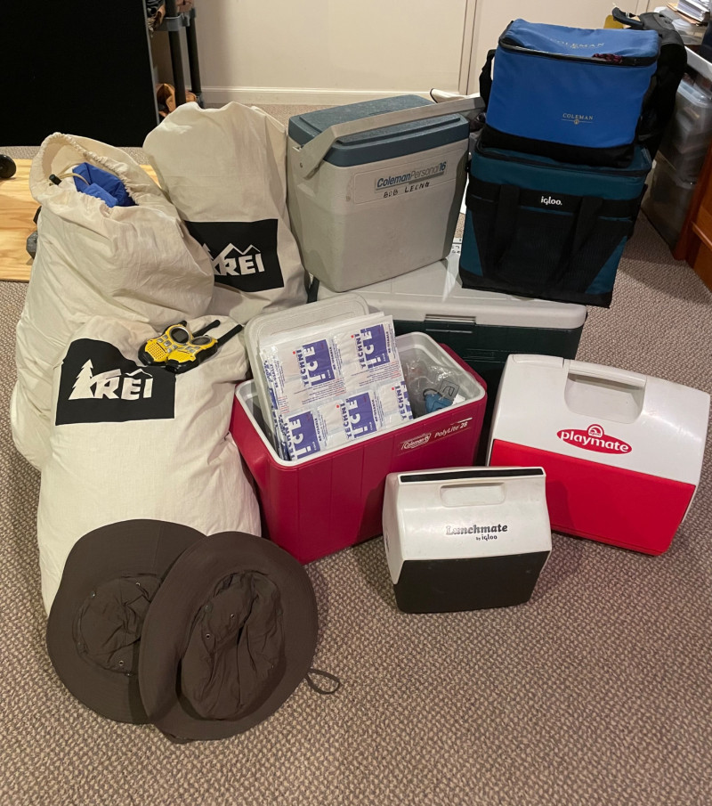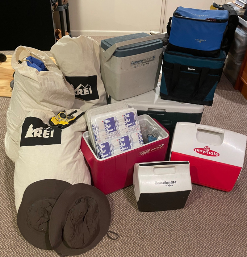 Brands include Coleman, Playmate, and Igloo Items are used; expect normal wear consistent with outdoor gear Walkie‑talkies are untested All items sold AS IS WHERE IS Working condition not guaranteed North Face Sleeping Bag - Blue with Storage Bag REI Sub Kilo Sleeping Bag-Black Silver with Storage Bag REI Sleeping Bag -Light Green and Black with Storage Bag 2 Motorola Walkie Talkie-Untested 2 Rain/Sun Hats Multiple Coolers varying sizes, Coleman, Playmate, and Igloo ✨ Included Items