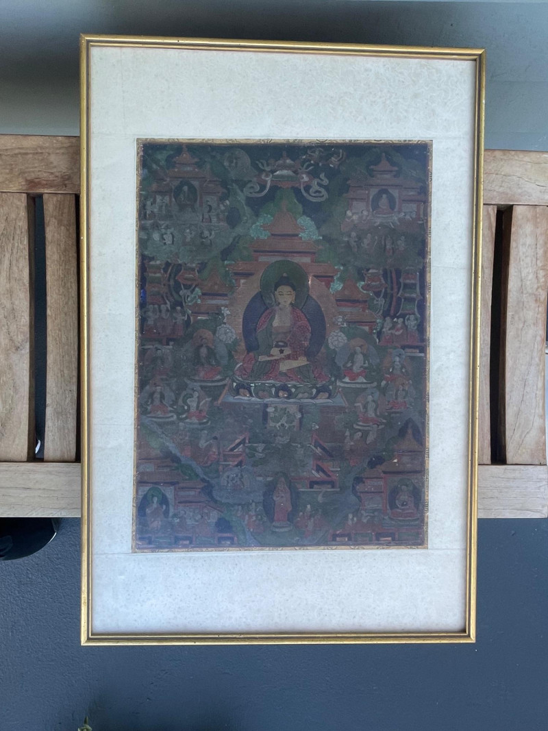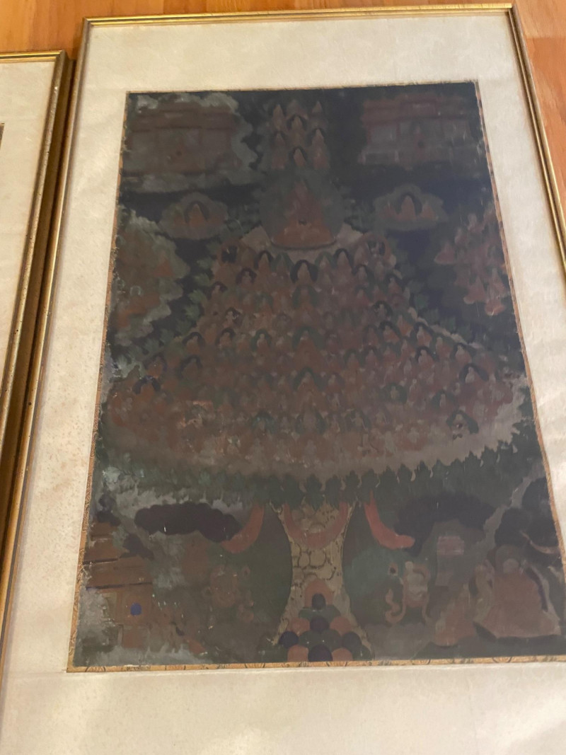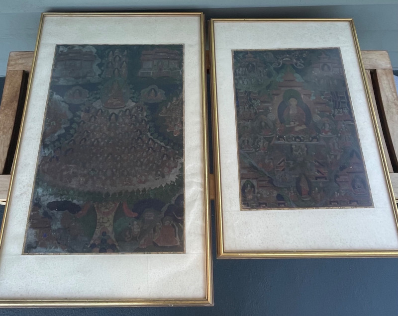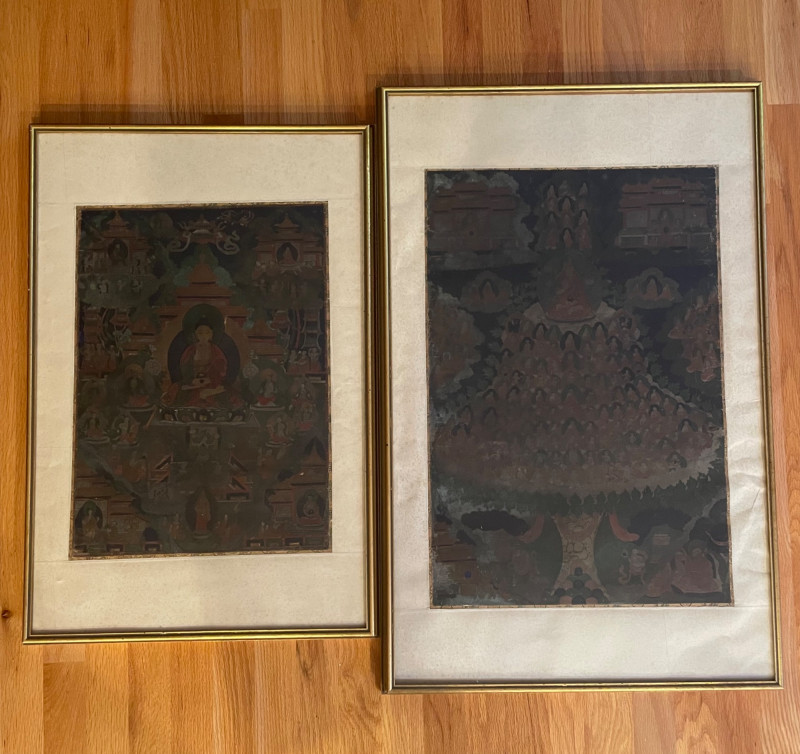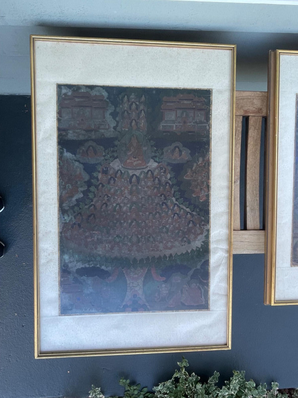 A serene pair of Buddhist‑style framed prints, ideal for creating a calming focal point in a meditation space, hallway, bedroom, or curated gallery wall. The two pieces complement one another beautifully—one larger, one smaller—offering balance and visual harmony. Set of two framed prints in a Buddhist‑inspired style Large print: approx. 32 1/2" x 21" Small print: approx. 27 1/2" x 18" Peaceful imagery suited for contemplative or minimalist décor Ready to hang The listing notes that all items show normal wear consistent with vintage or used artwork and are sold AS IS WHERE IS, with no guarantees on condition or completenessHighlights