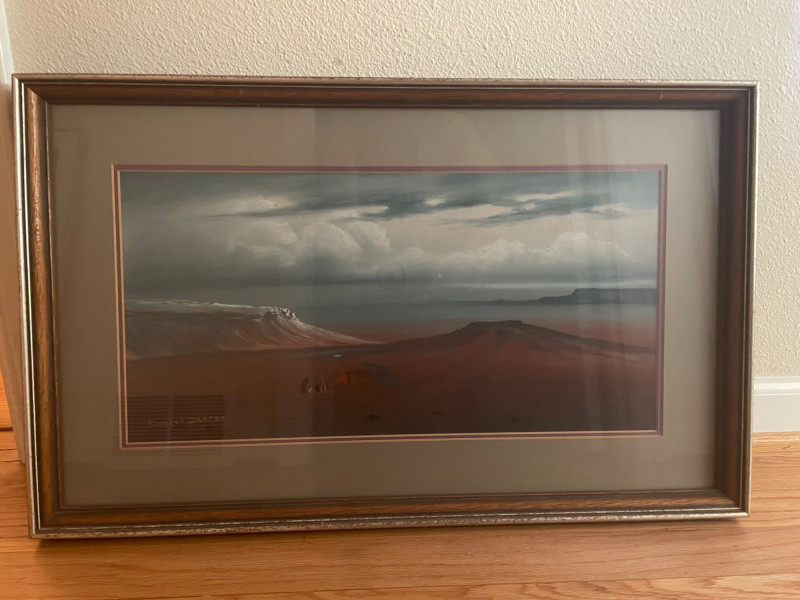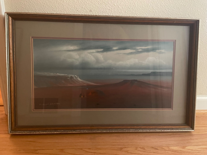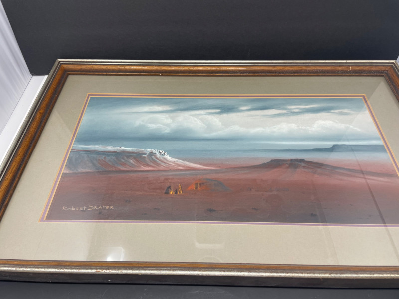 A paired lot featuring one confirmed Robert Draper Southwest‑style print alongside a second print by an unknown artist. Together, they offer complementary desert‑inspired imagery suitable for rustic, Western, or regional décor. Robert Draper Print Southwest‑style imagery characteristic of Draper’s work Framed and ready for display Known for warm palettes and desert landscapes Print by Unknown Artist Southwest or Western‑influenced subject matter Framed presentation Artist not identified on the piece Normal wear consistent with previously owned artwork.