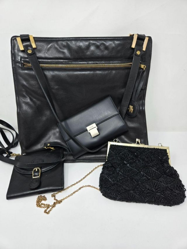 This curated lot features four black handbags and wallets in assorted styles and finishes: Ernest Leather Tote – Spacious with gold-tone hardware and front zipper pocket; ideal for daily carry DKNY Clutch – Sleek black design with silver clasp; perfect for evening outings Jay Herbert NY Crossbody – Compact with buckle detail; functional and stylish Beaded Evening Purse – Gold frame and chain strap; vintage charm with textured elegance Each piece is in excellent condition, with clean interiors and minimal wear.