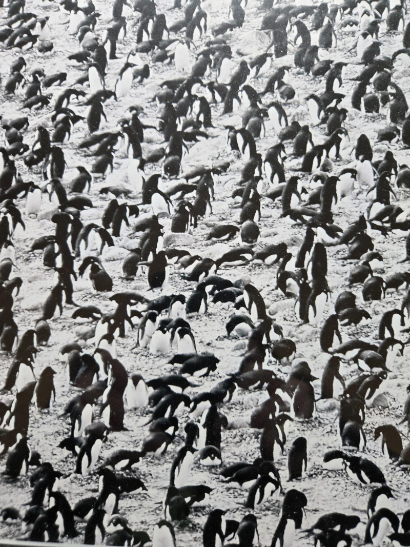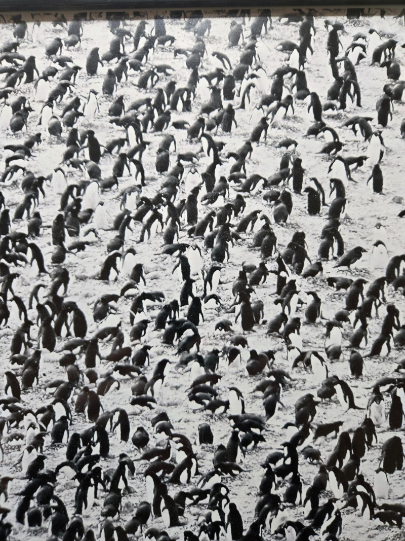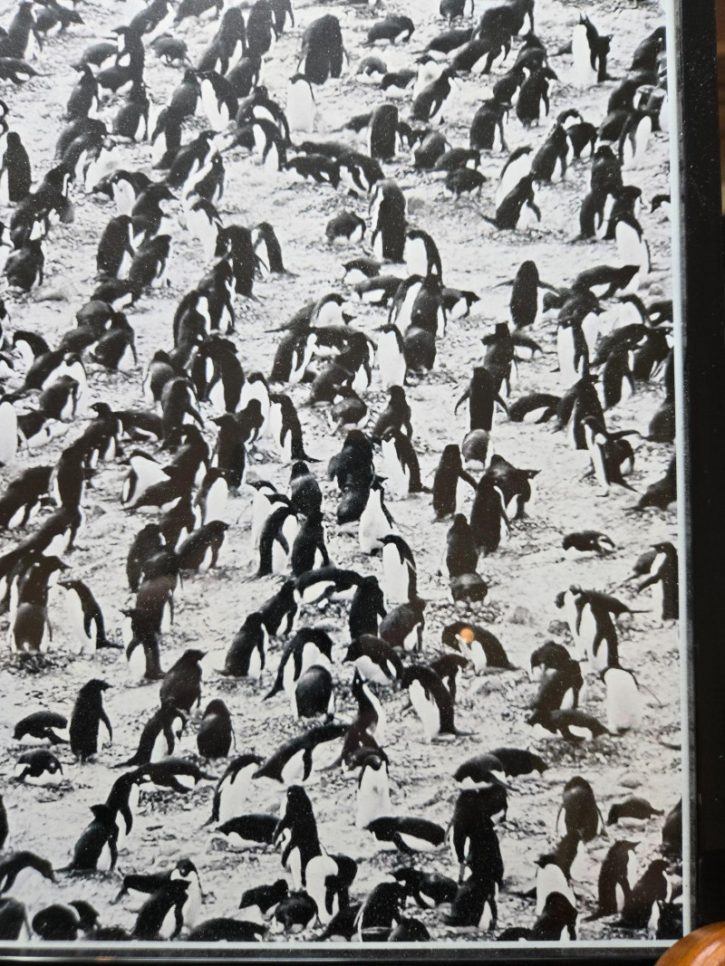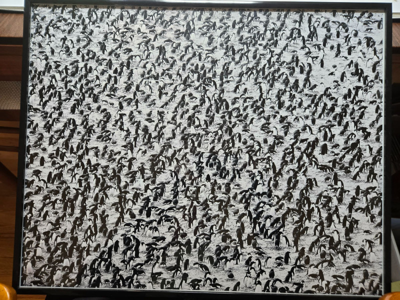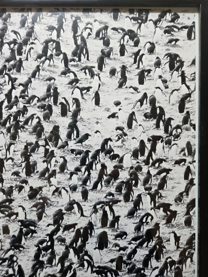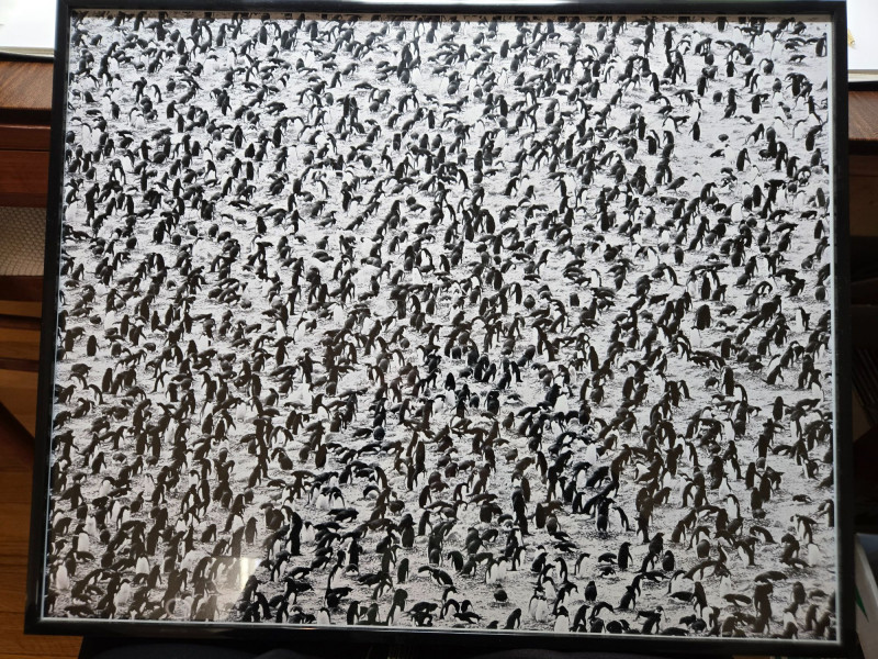 This framed print features a tightly packed group of penguins standing on a snowy or icy surface. The black-and-white plumage blends into the wintry background, creating a visual puzzle that challenges the viewer to count the individual birds. The composition is both humorous and intricate, capturing the charm of communal wildlife behavior. Subject: Penguin colony in snowy habitat Medium: Print on paper (framed) Style: Photographic realism with visual complexity Condition: Excellent; clean and professionally presented