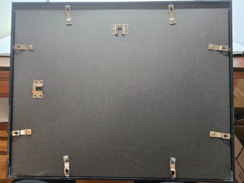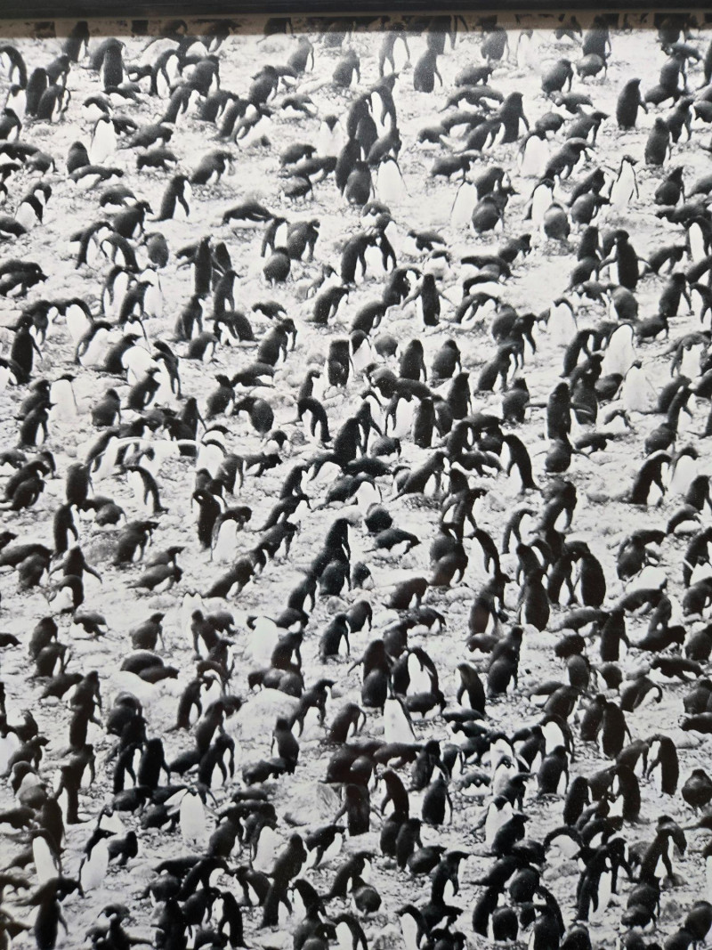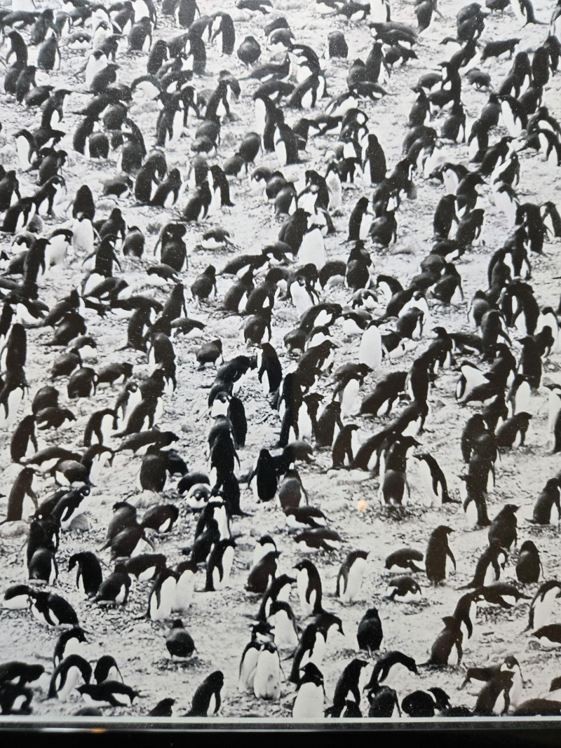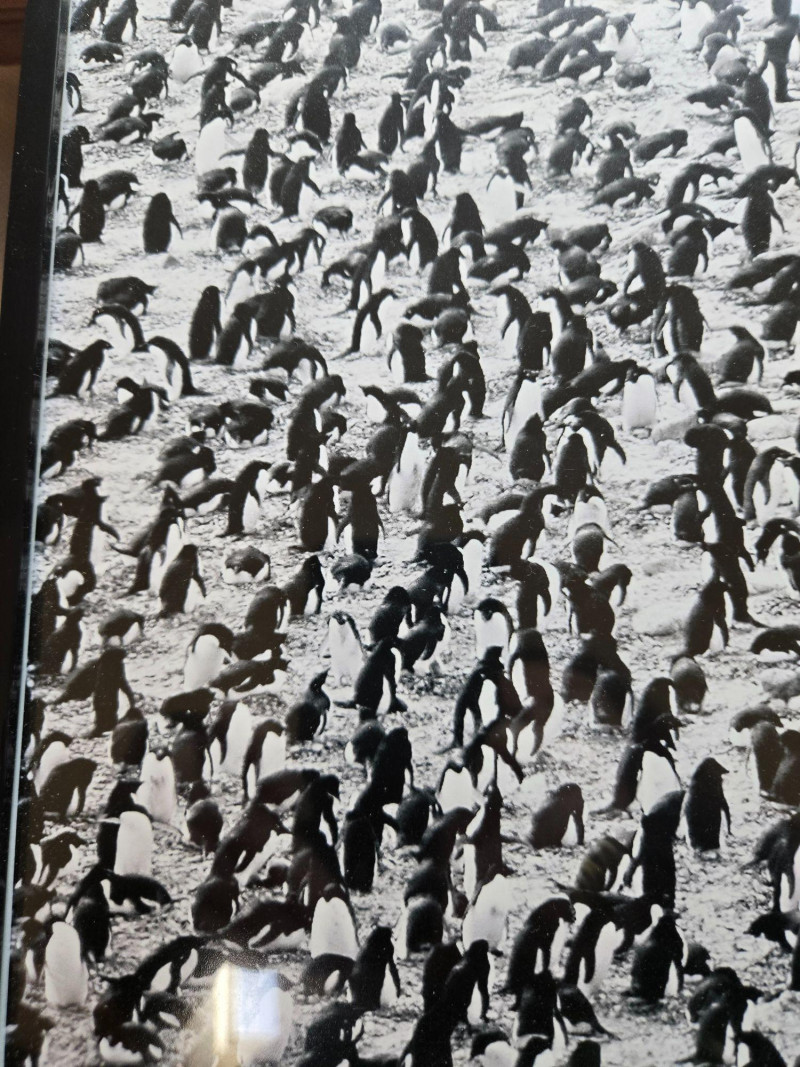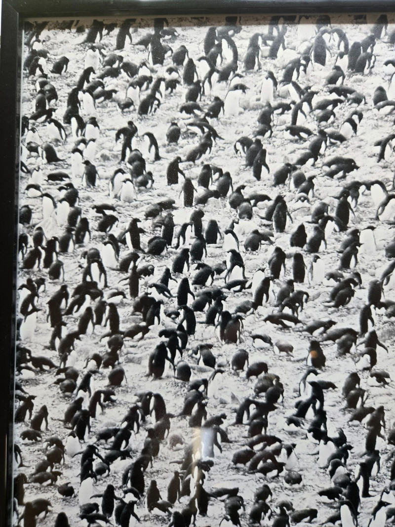 This framed print features a tightly packed group of penguins standing on a snowy or icy surface. The black-and-white plumage blends into the wintry background, creating a visual puzzle that challenges the viewer to count the individual birds. The composition is both humorous and intricate, capturing the charm of communal wildlife behavior. Subject: Penguin colony in snowy habitat Medium: Print on paper (framed) Style: Photographic realism with visual complexity Condition: Excellent; clean and professionally presented