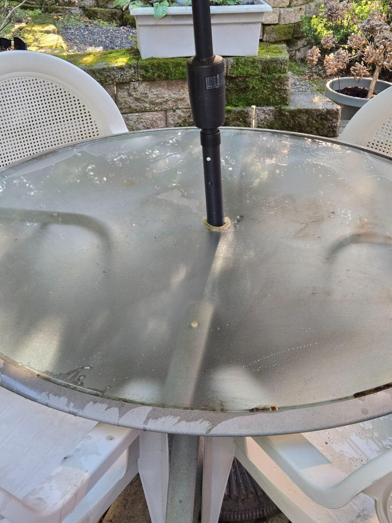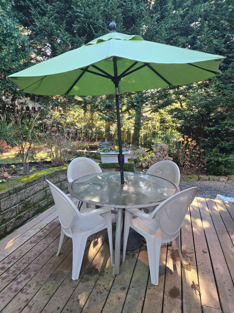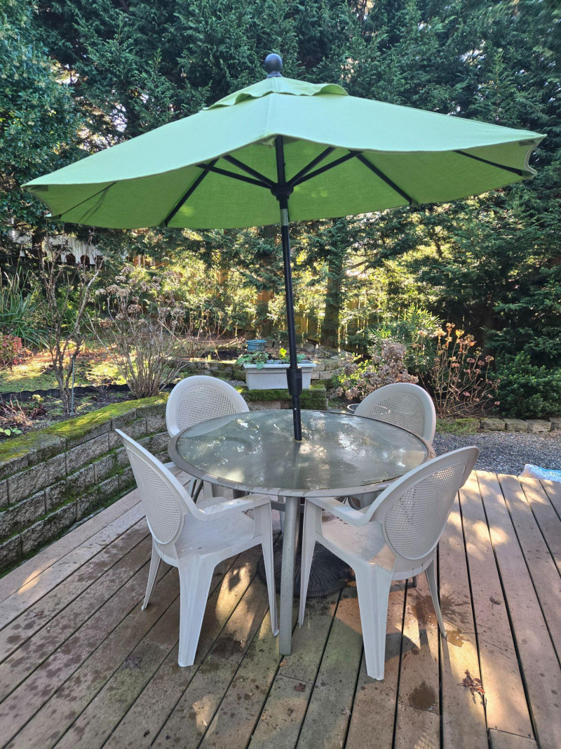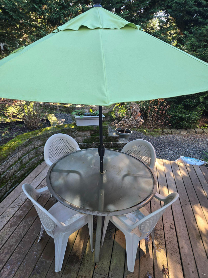 Sold AS IS WHERE IS with no guarantees on condition or completeness.Patio Set with Great O’bravia / Treasure Garden Green Umbrella