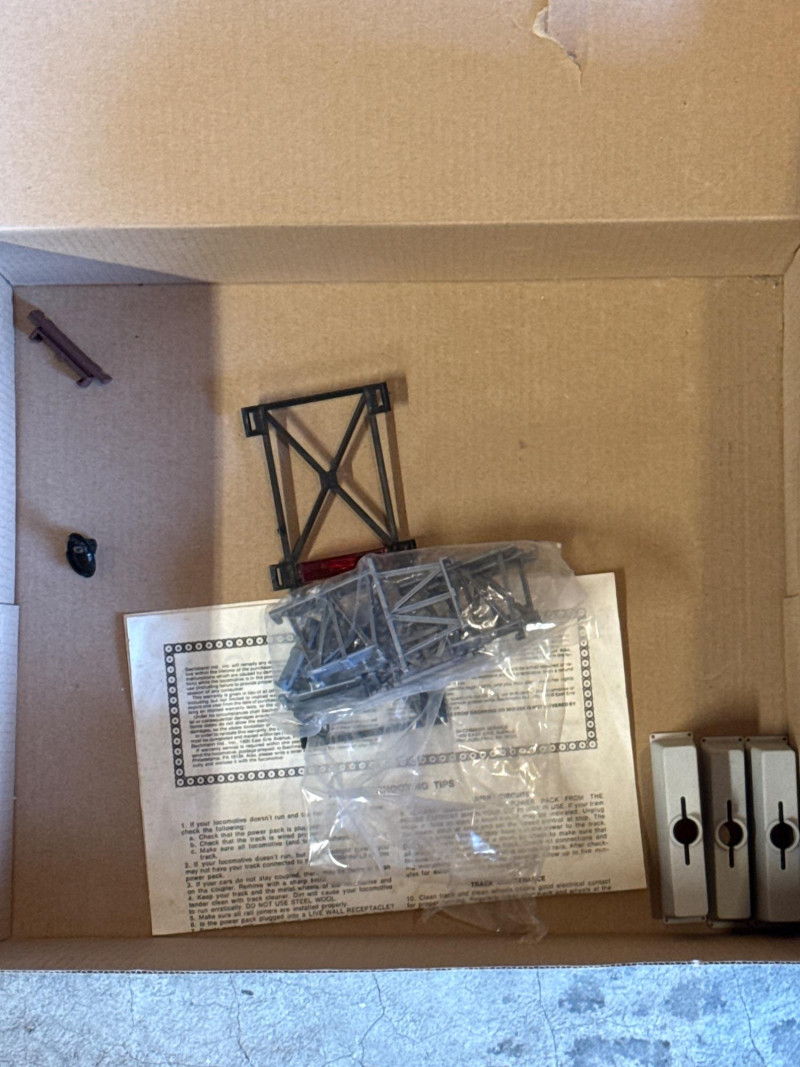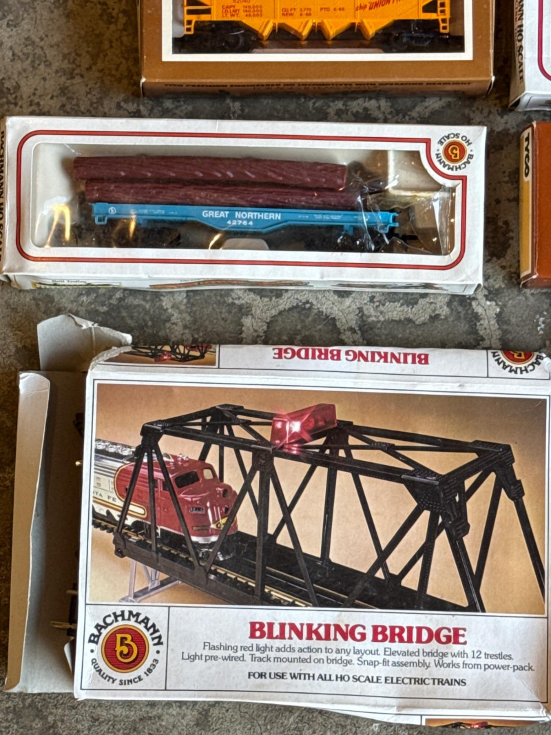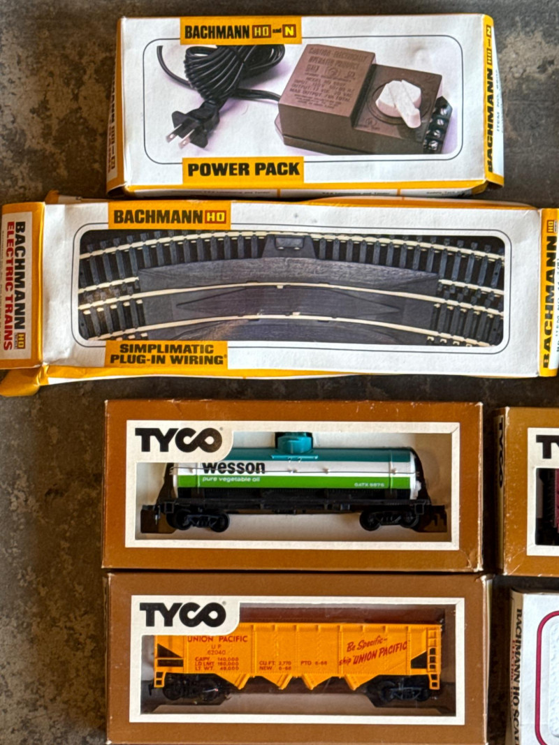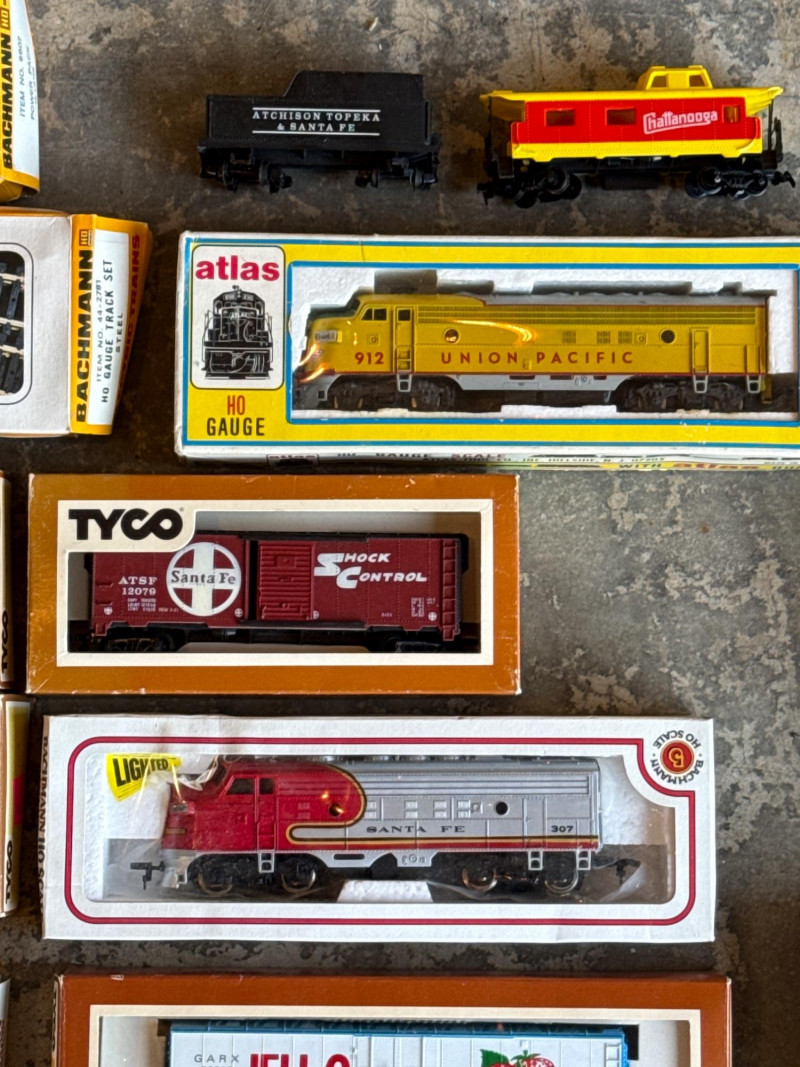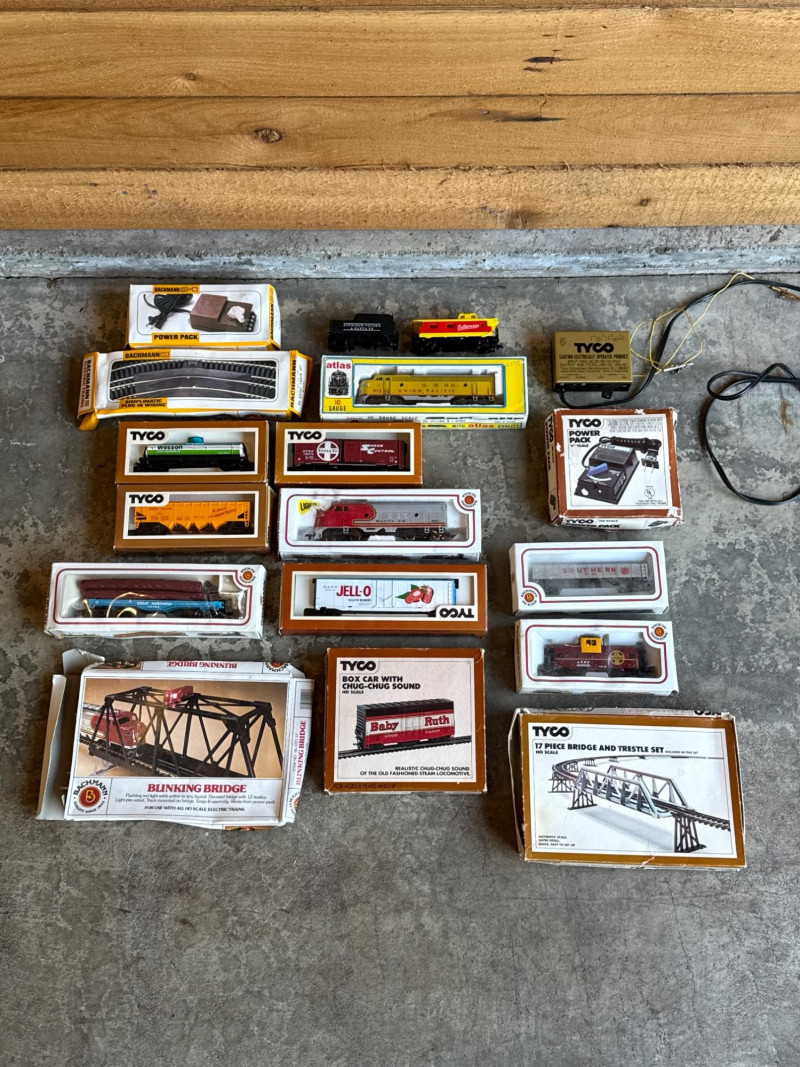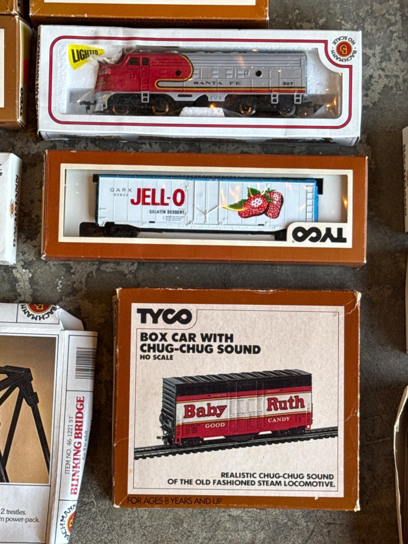 A substantial lot of vintage HO scale model railroading equipment, featuring a variety of locomotives, rolling stock, and track accessories. Locomotives & Rolling Stock: Includes an Atlas yellow and blue diesel locomotive. Features multiple Tyco brand boxcars with nostalgic advertising, including a Jell-O car, a Baby Ruth car, and a Tyco Weston tanker. Contains a Tyco Box Car with "Chug-Chug" Sound. Accessories & Track: Includes a Bachmann "Blinking Bridge" and a Tyco 17-Piece Bridge and Trestle Set in their original vintage packaging. Features multiple power controllers, including a Bachmann Power Pack and a Tyco Power Pack. Includes a significant amount of loose brass or steel track and various landscape accessories. Condition: These items are in vintage, pre-owned condition. Several pieces remain in their original boxes, which show age-appropriate wear. The functional status of the locomotives and power packs is unknown; please refer to the photos for individual cosmetic details.