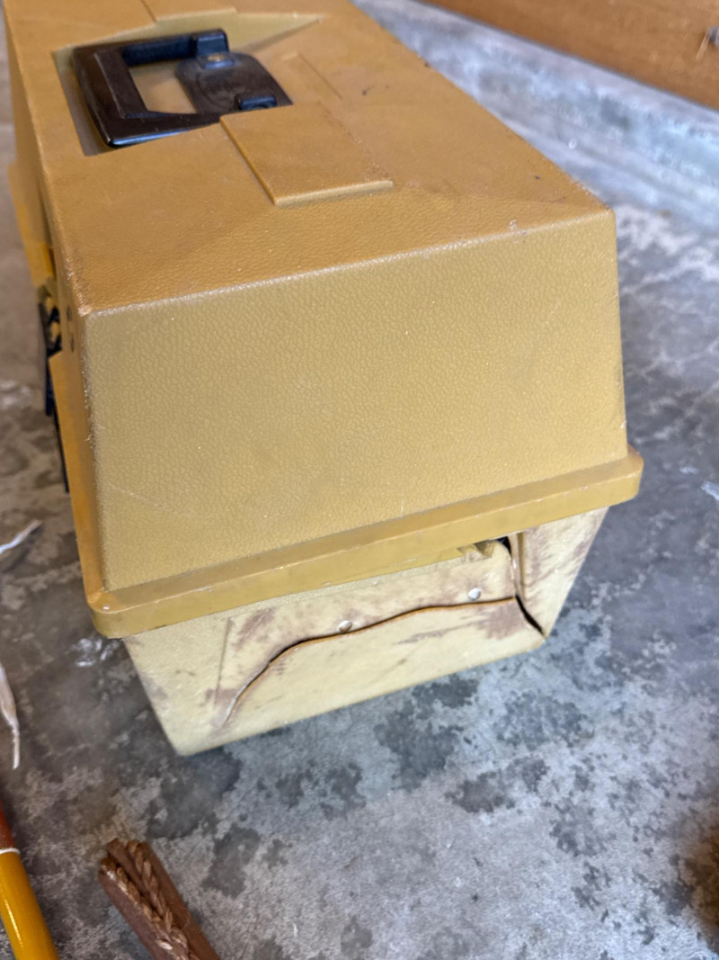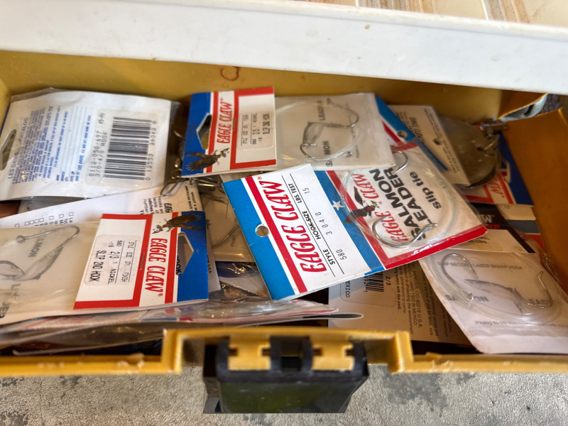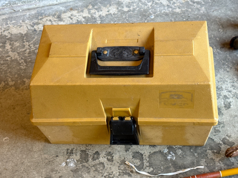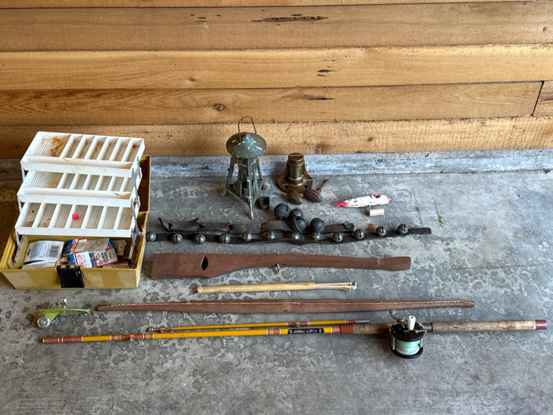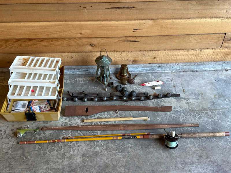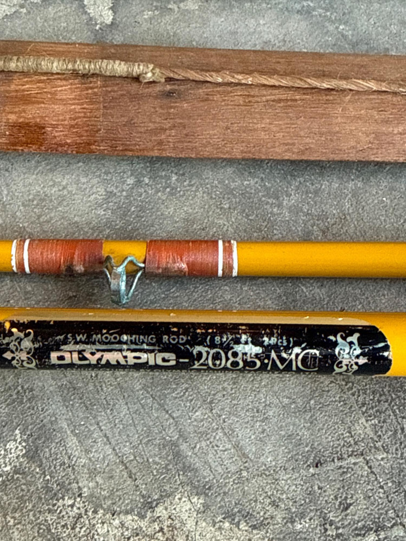 Vintage Metal, Olympic Fishing Rod & Fishing Lures w/ Tackle Box *please note photos. All vintage condition. The Tacklebox has some fishing gear inside, and the edge of the box is cracked.