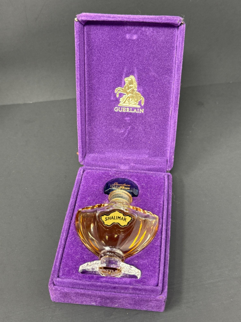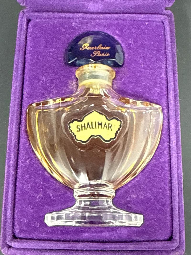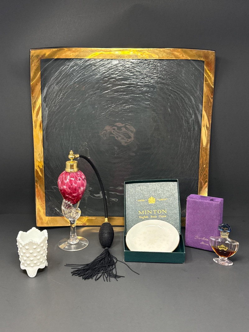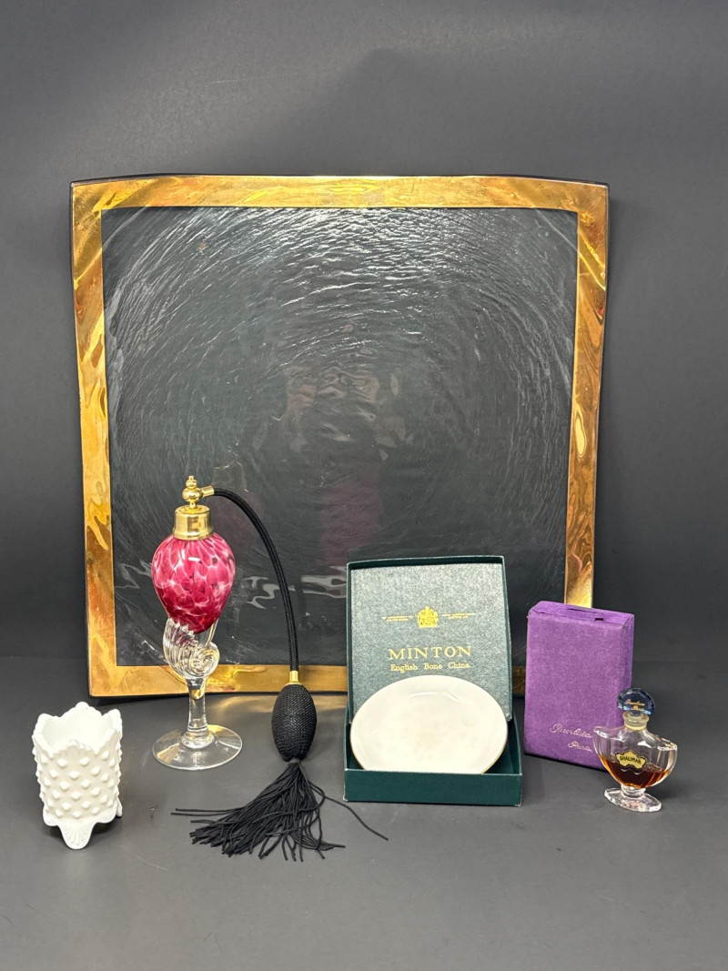 An elegant assortment of vintage vanity items, including luxury perfumes, fine English bone china, and decorative glass. Shalimar by Guerlain: Features a classic bottle of Shalimar Extrait de Parfum by Guerlain. Presented in its iconic purple velvet-lined presentation box with gold-tone accents. Perfume Spritzer: Includes a striking Fenton-style perfume spritzer with a pink hobnail or ruffled glass body and a vintage black bulb atomizer. Height: 8 1/4 inches. Minton Bone China: Features a small decorative plate or pin dish from Minton, the prestigious English bone china manufacturer. Diameter: 4 3/8 inches. Additional Accessories: Fenton Toothpick/Trinket Holder: A small white hobnail holder measuring 3 inches in height. Decorative Display Tray: A large 16” x 16” tray with gold toned edges Good used vintage condition.